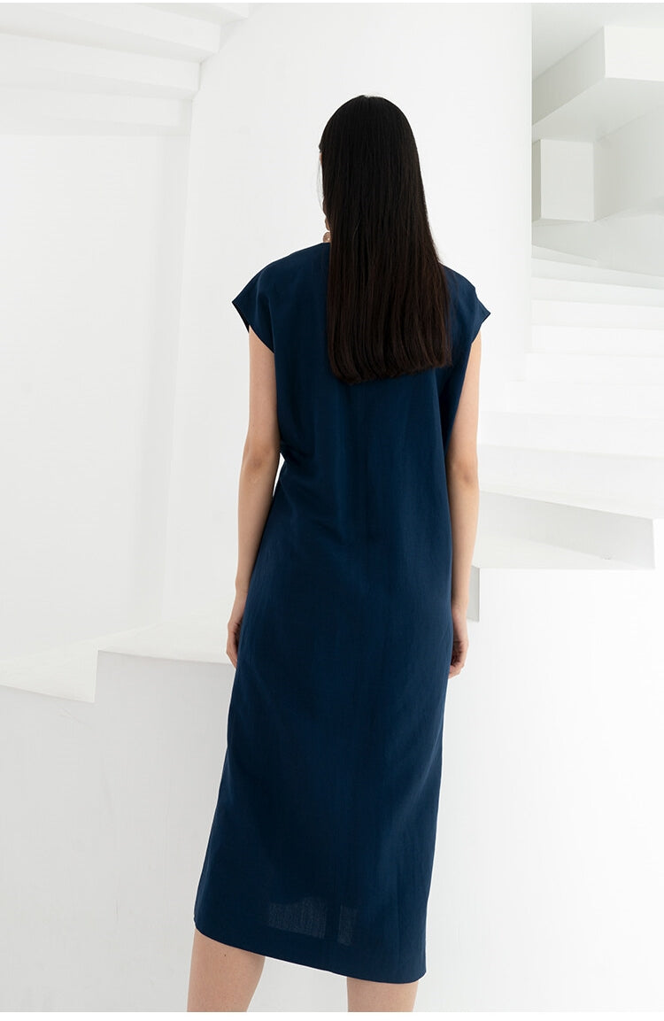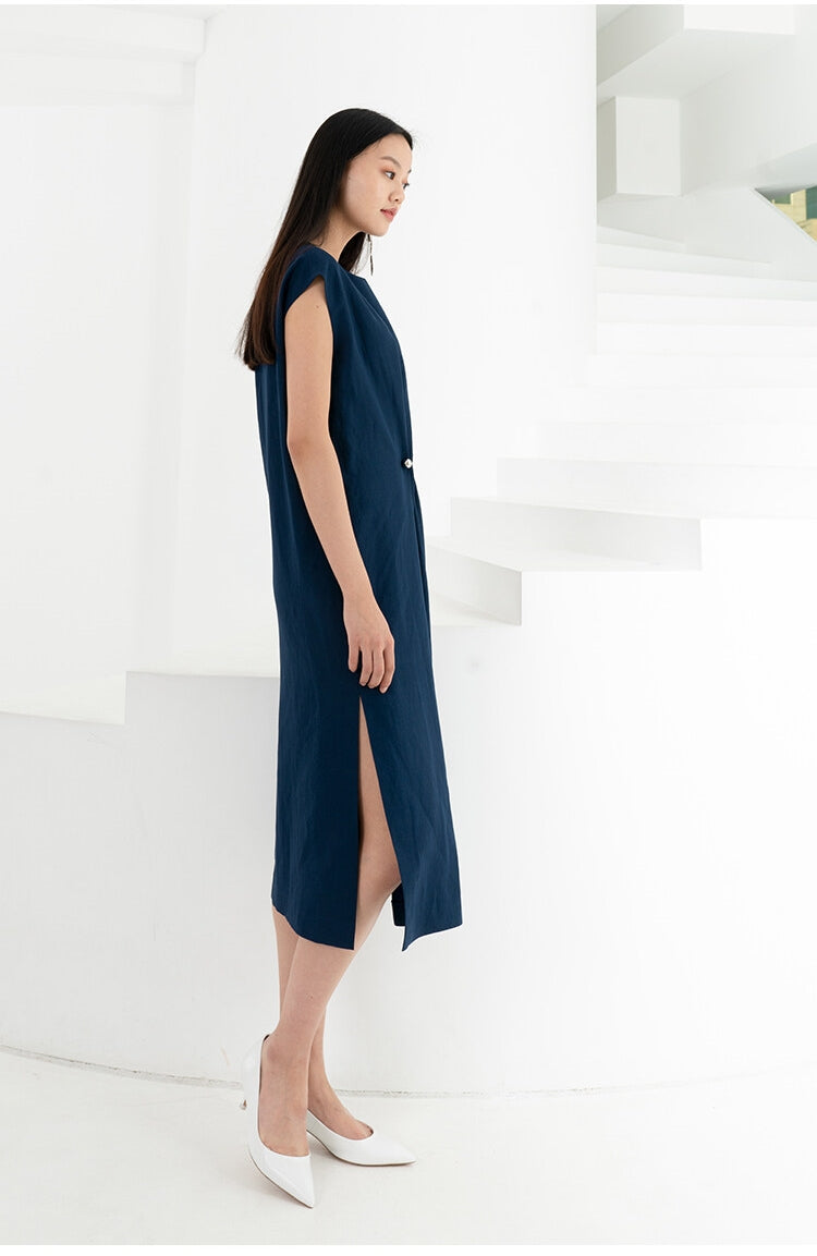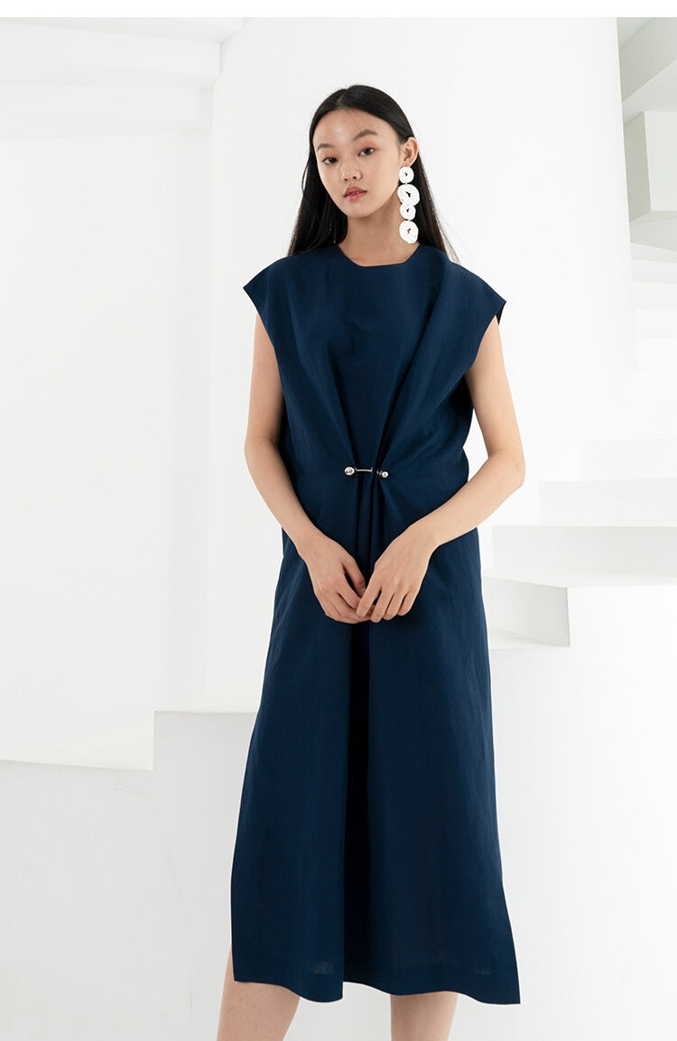 Laura Ren presents a refined sleeveless linen midi dress that merges architectural elegance with effortless comfort. Crafted from airy, natural linen, this piece features a clean round neckline, softly structured shoulders, and a signature front drape detail secured by a subtle metallic pin. The asymmetric silhouette flows into a straight midi hemline, giving it modern sculptural movement while maintaining breathability. A minimalist yet striking design, perfect for warm-season city dressing or elevated resort wear, this dress captures Laura Ren’s sophisticated approach to summer tailoring.