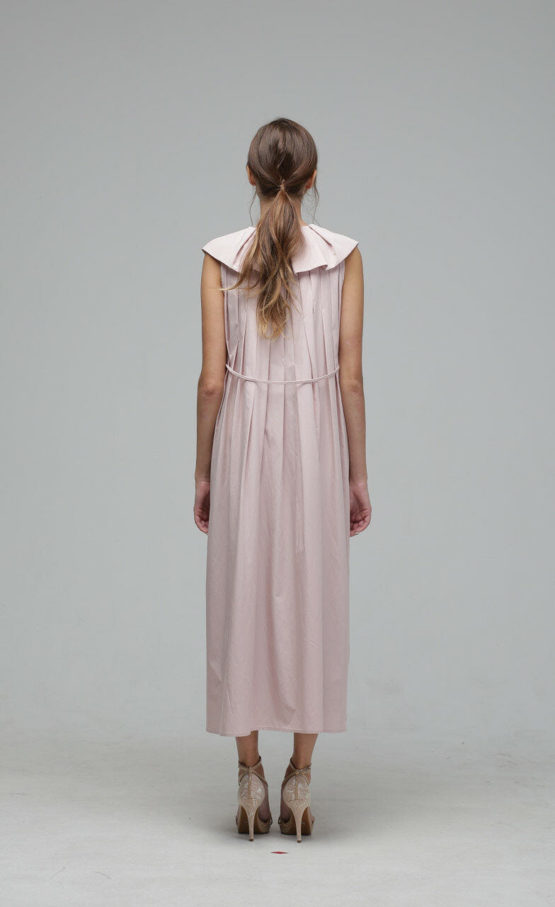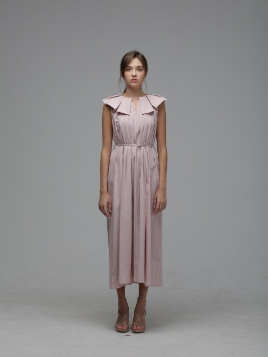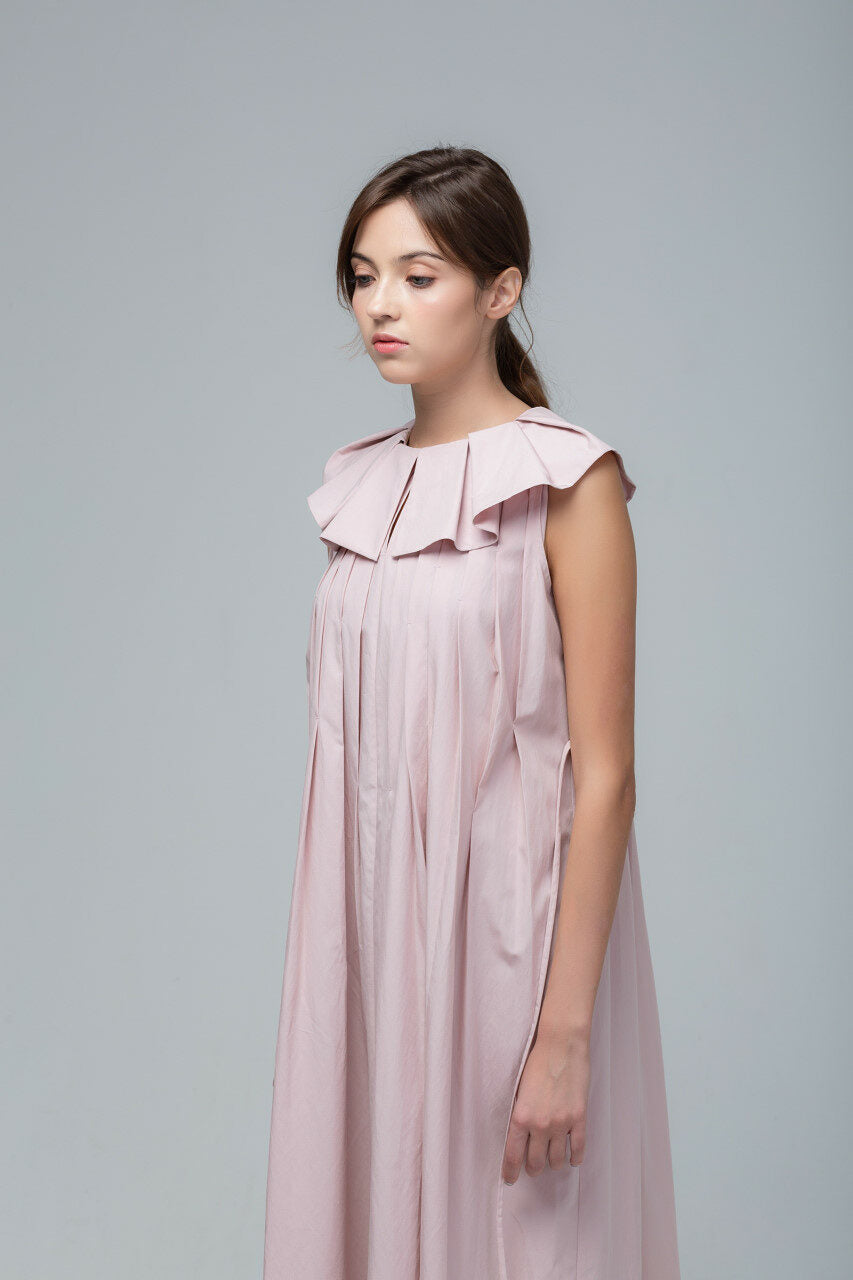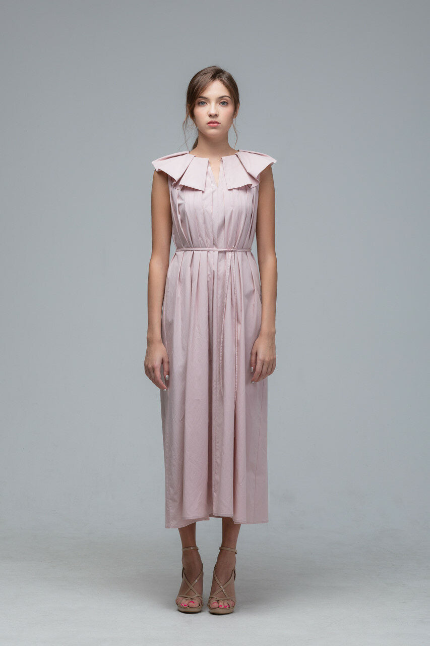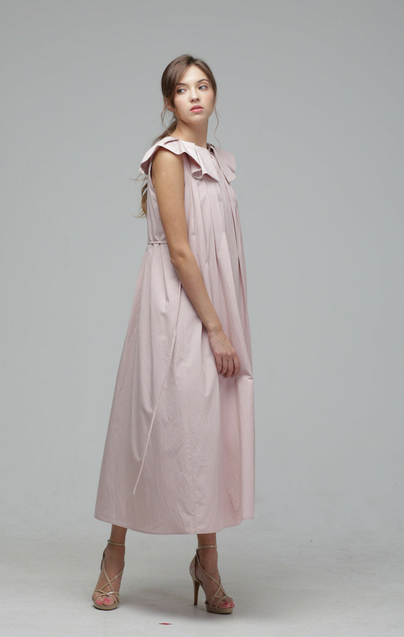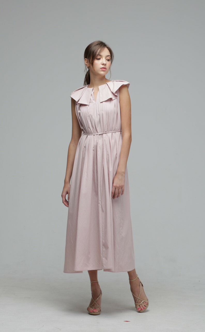 Crafted from crisp cotton poplin, this sleeveless midi dress by Laura Ren features an elegant blend of structure and softness. The wide ruffle collar brings a romantic statement to the neckline, while vertical pleats enhance the fluid drape of the silhouette. A slim waist belt cinches the shape for added definition, offering a tailored contrast to the relaxed skirt. Lightweight yet polished, this dress is perfect for elevated daywear, refined gatherings, or summer occasions. Laura Ren delivers timeless craftsmanship and modern femininity through this breathable and beautifully balanced piece.