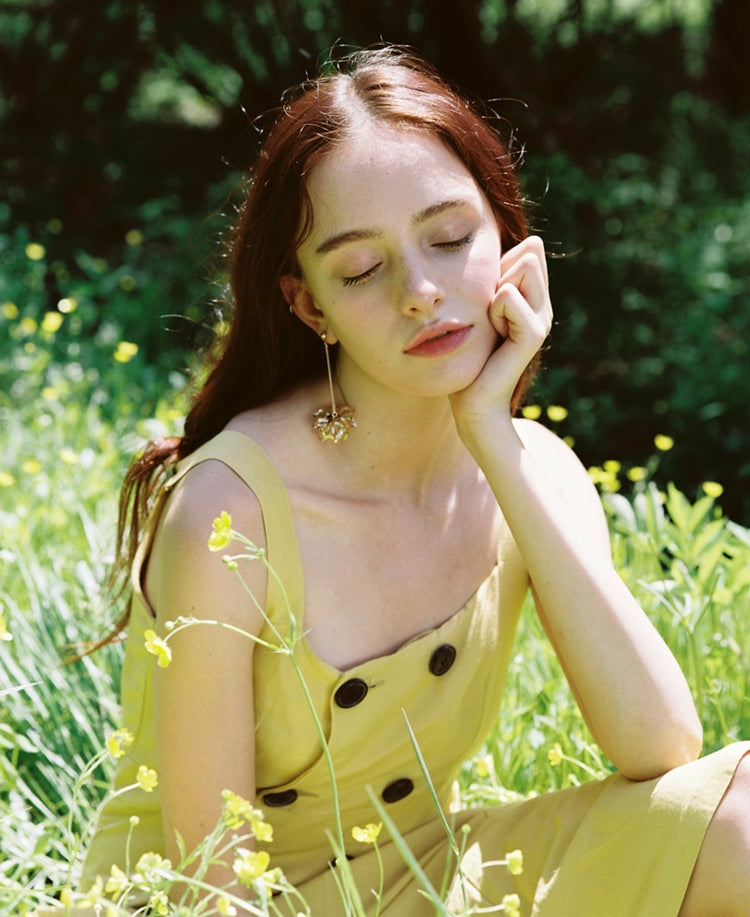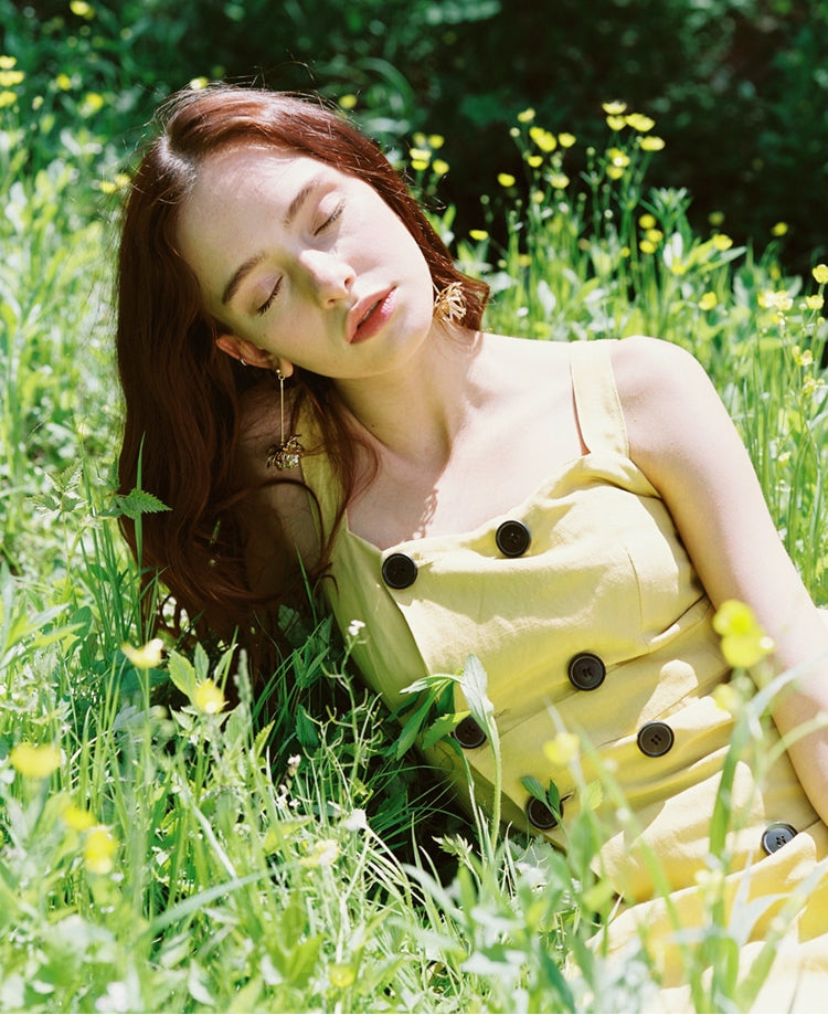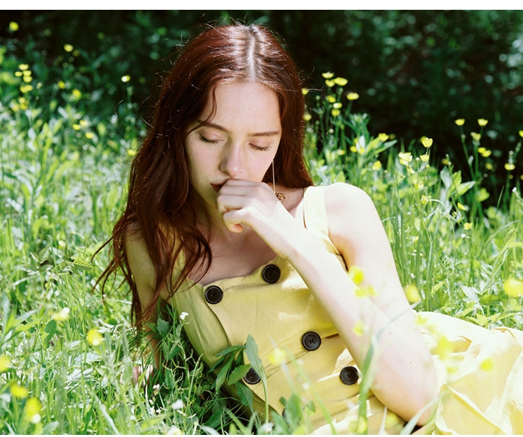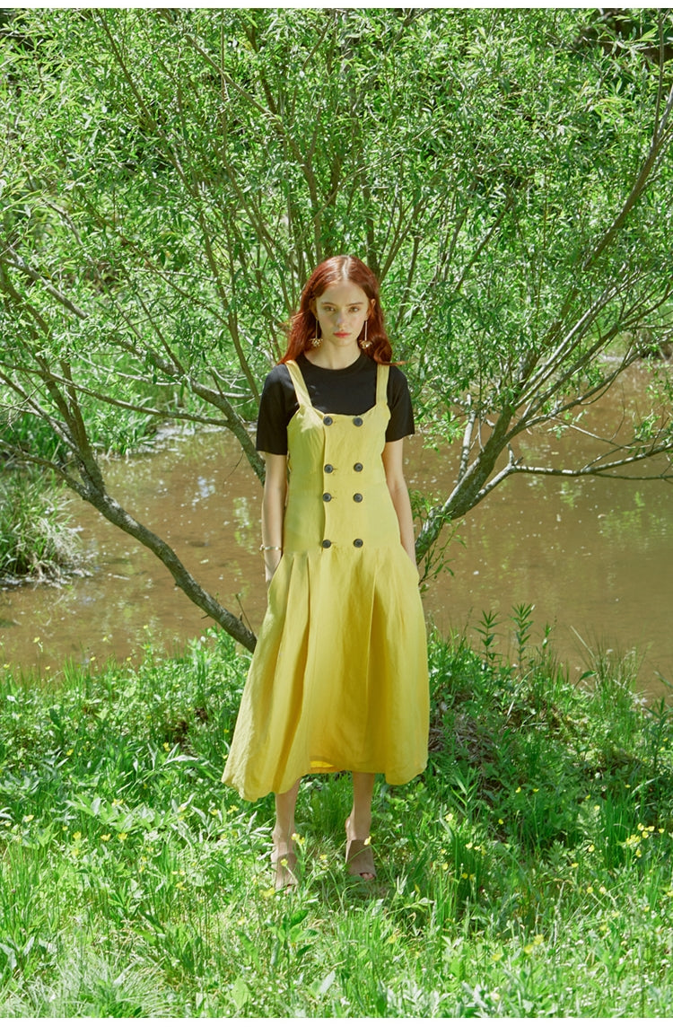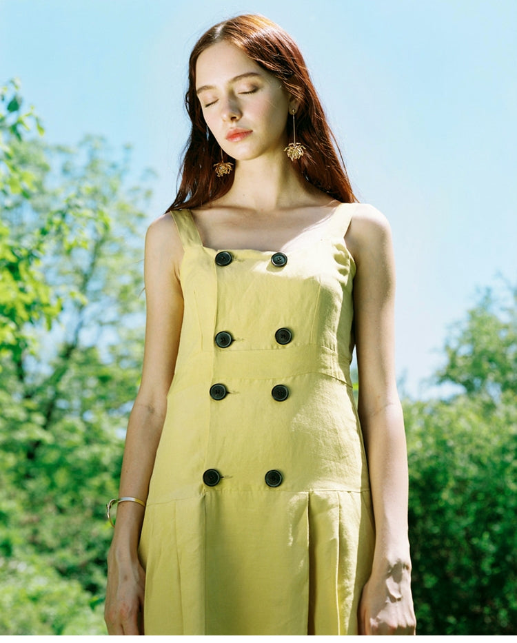 Laura Ren presents this summery linen dress, styled with a sleeveless bodice and wide shoulder straps for a fresh, breathable feel. The double-breasted button detail adds vintage charm, while the softly pleated midi skirt offers volume and flow. Whether layered over a tee or worn alone, this dress is a versatile wardrobe staple for sunny days.