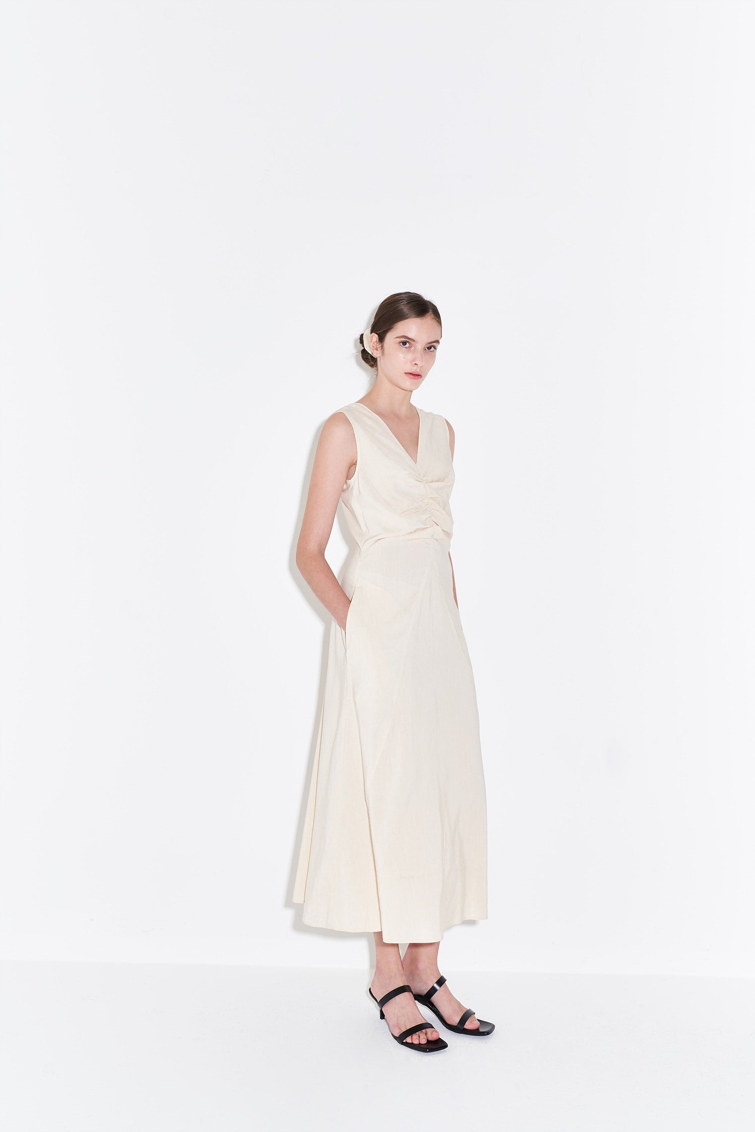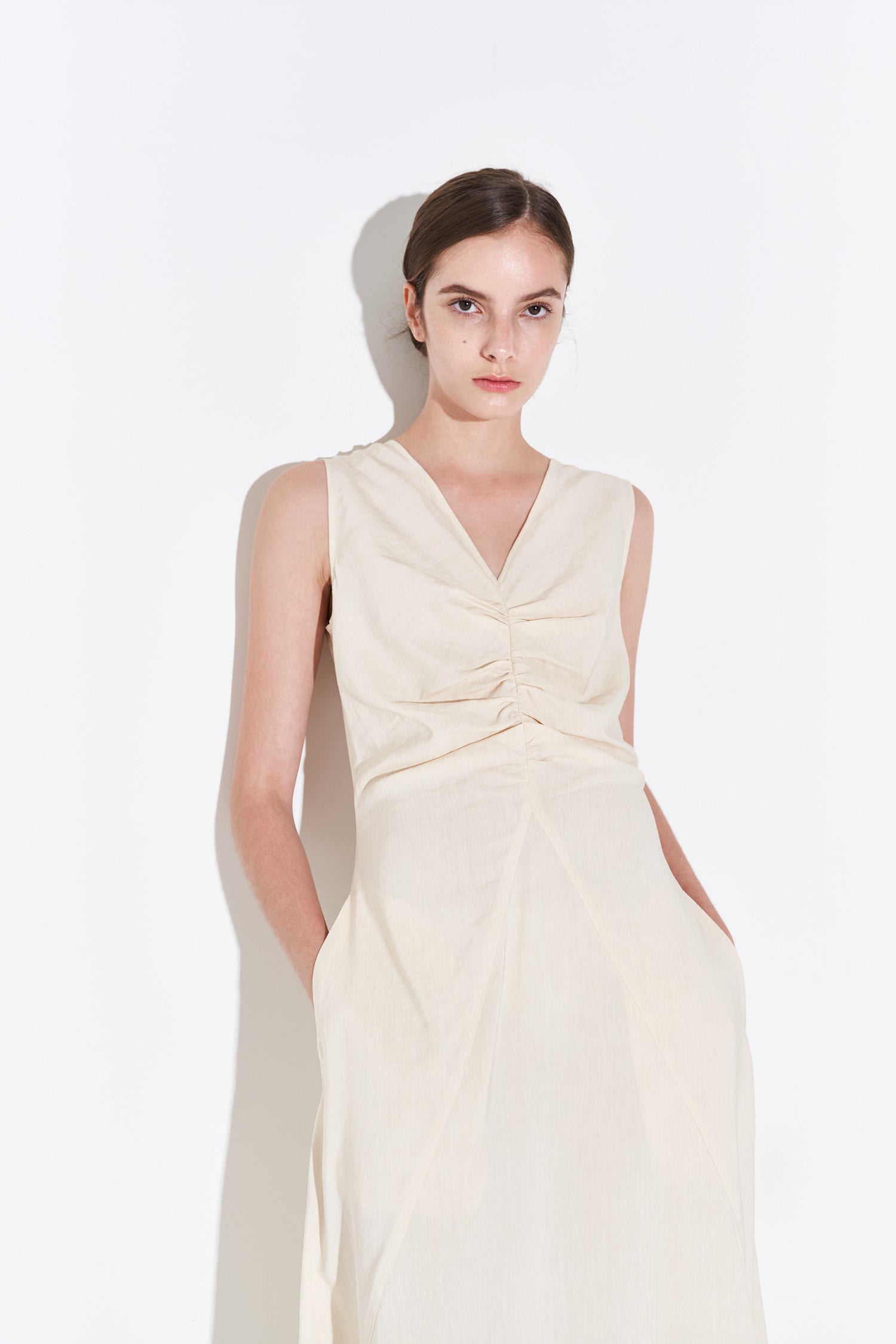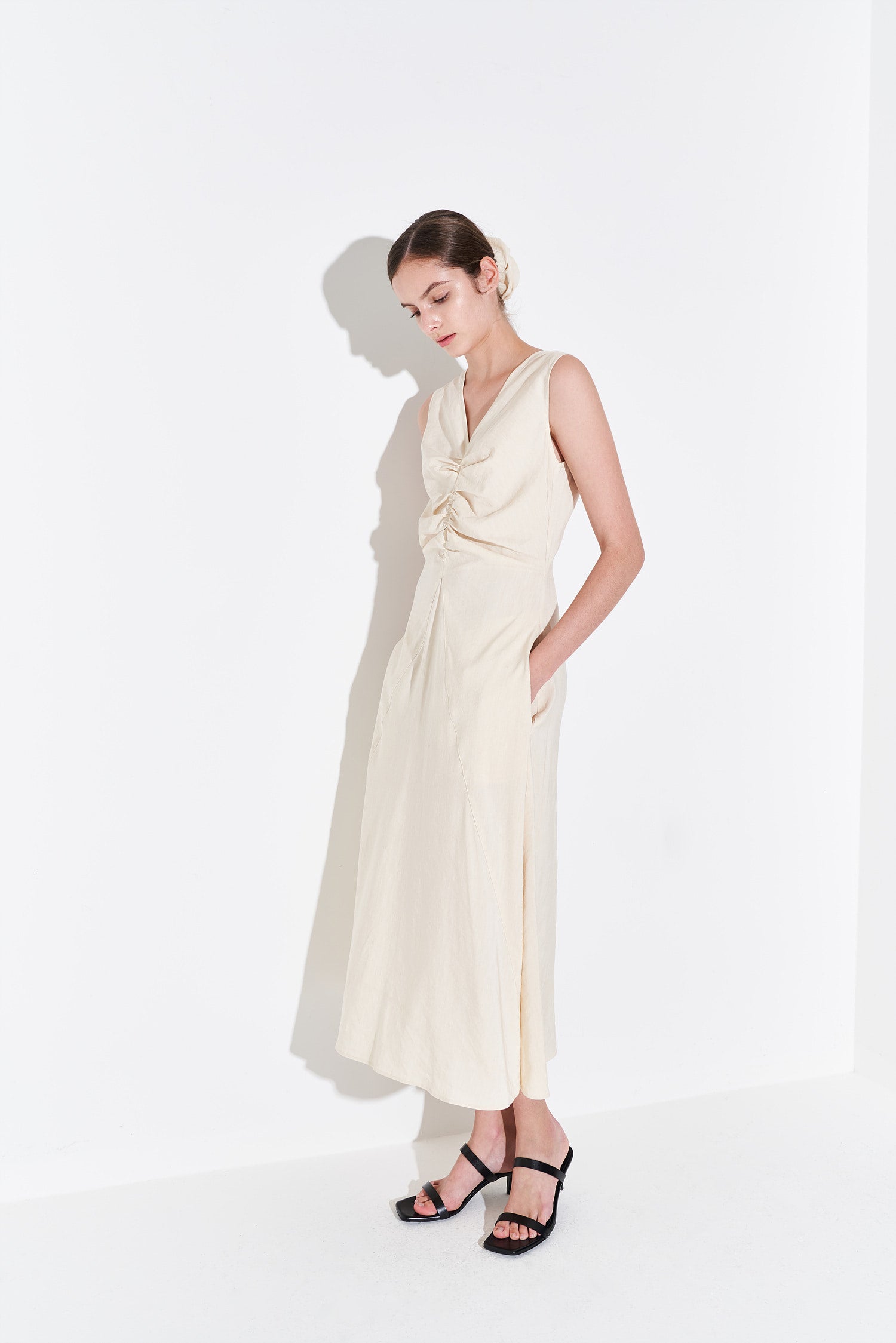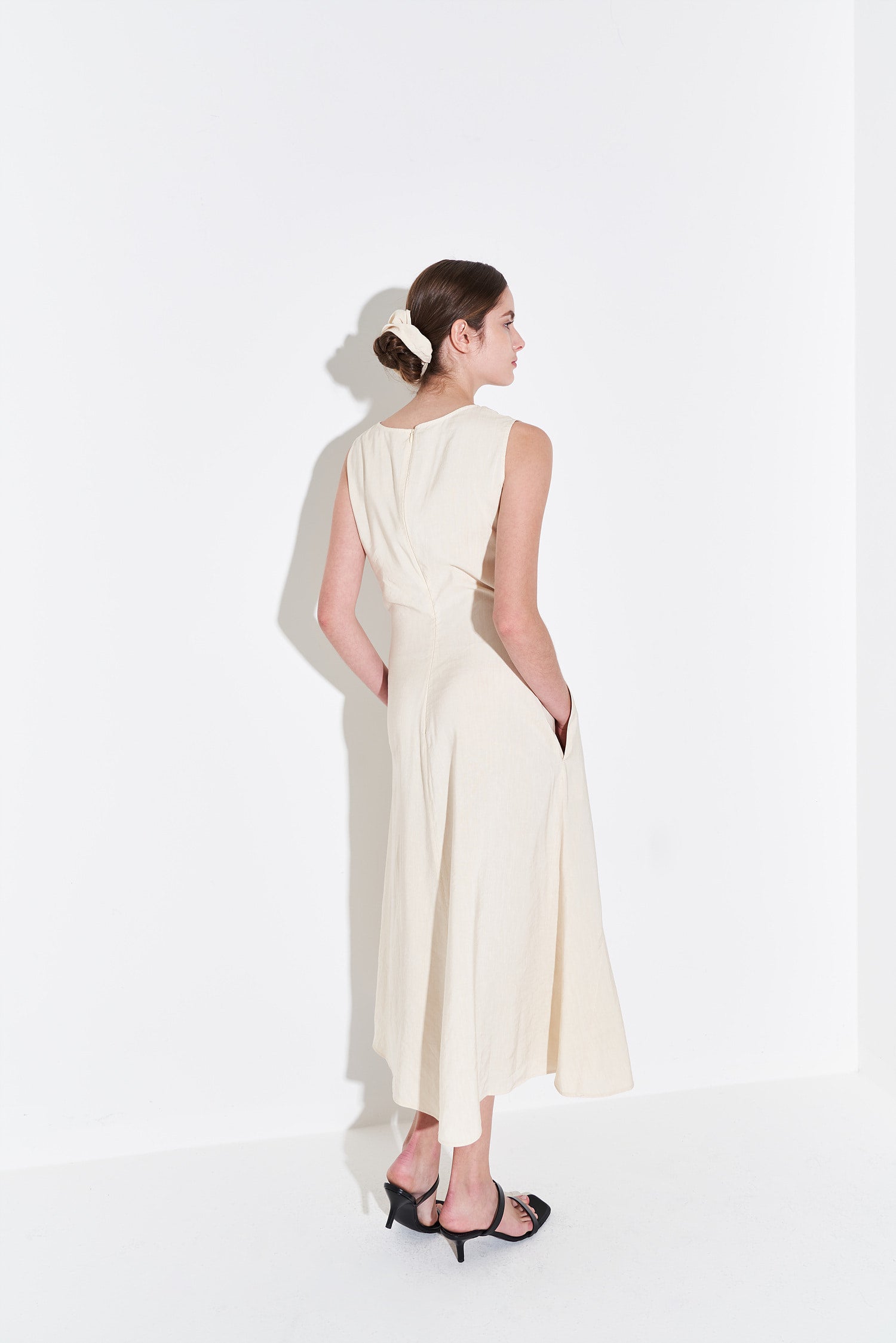The Laura Ren sleeveless linen midi dress embodies effortless elegance with a touch of refined detail. Expertly crafted from breathable, natural linen, this women’s dress features a flattering V-neckline and delicate draped ruching at the waist, enhancing the feminine silhouette. The flared midi skirt provides graceful movement, while the hidden zipper ensures a seamless fit. Ideal for daytime events or relaxed summer occasions, this linen dress by Laura Ren combines comfort and timeless style, making it a versatile essential for every modern wardrobe.