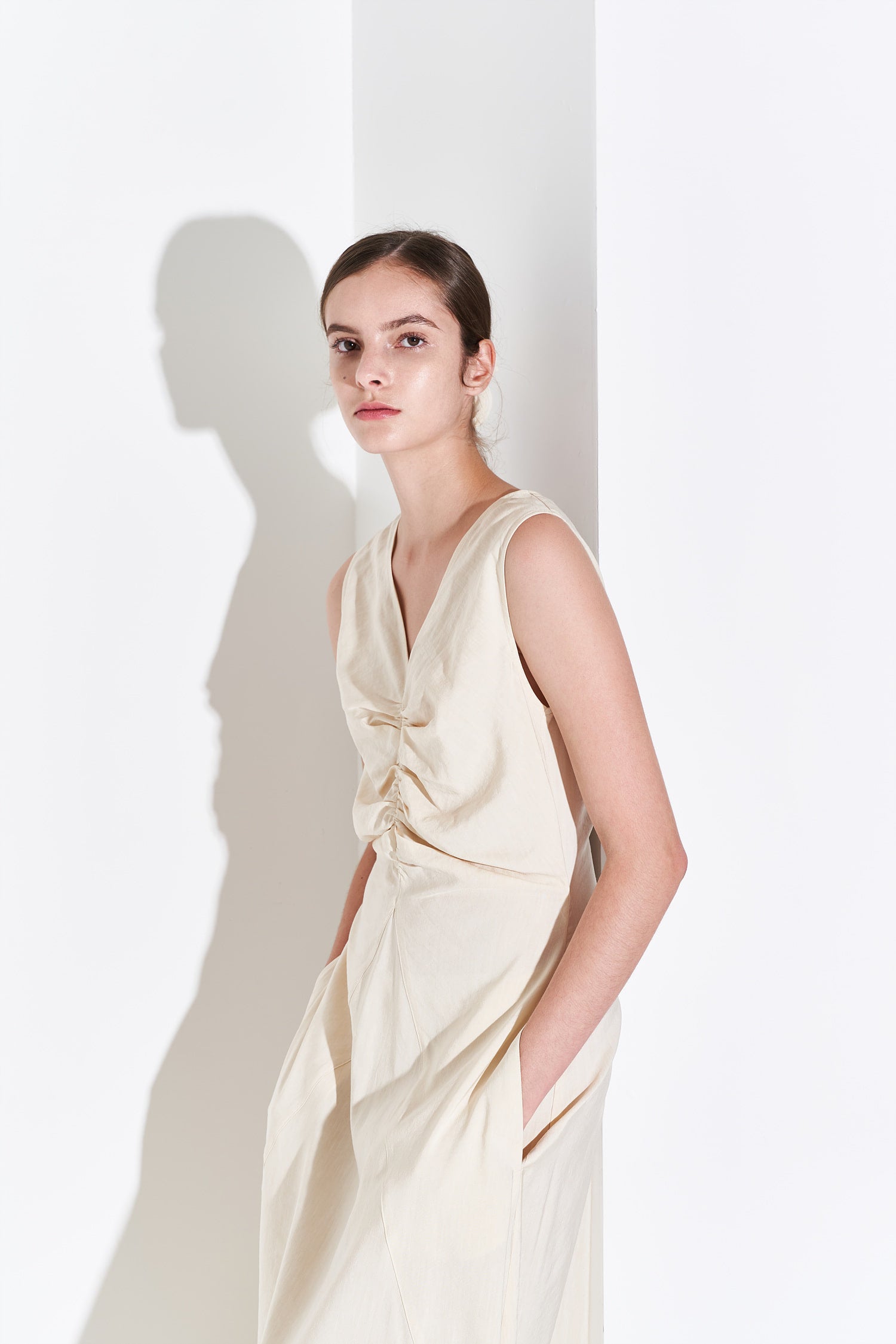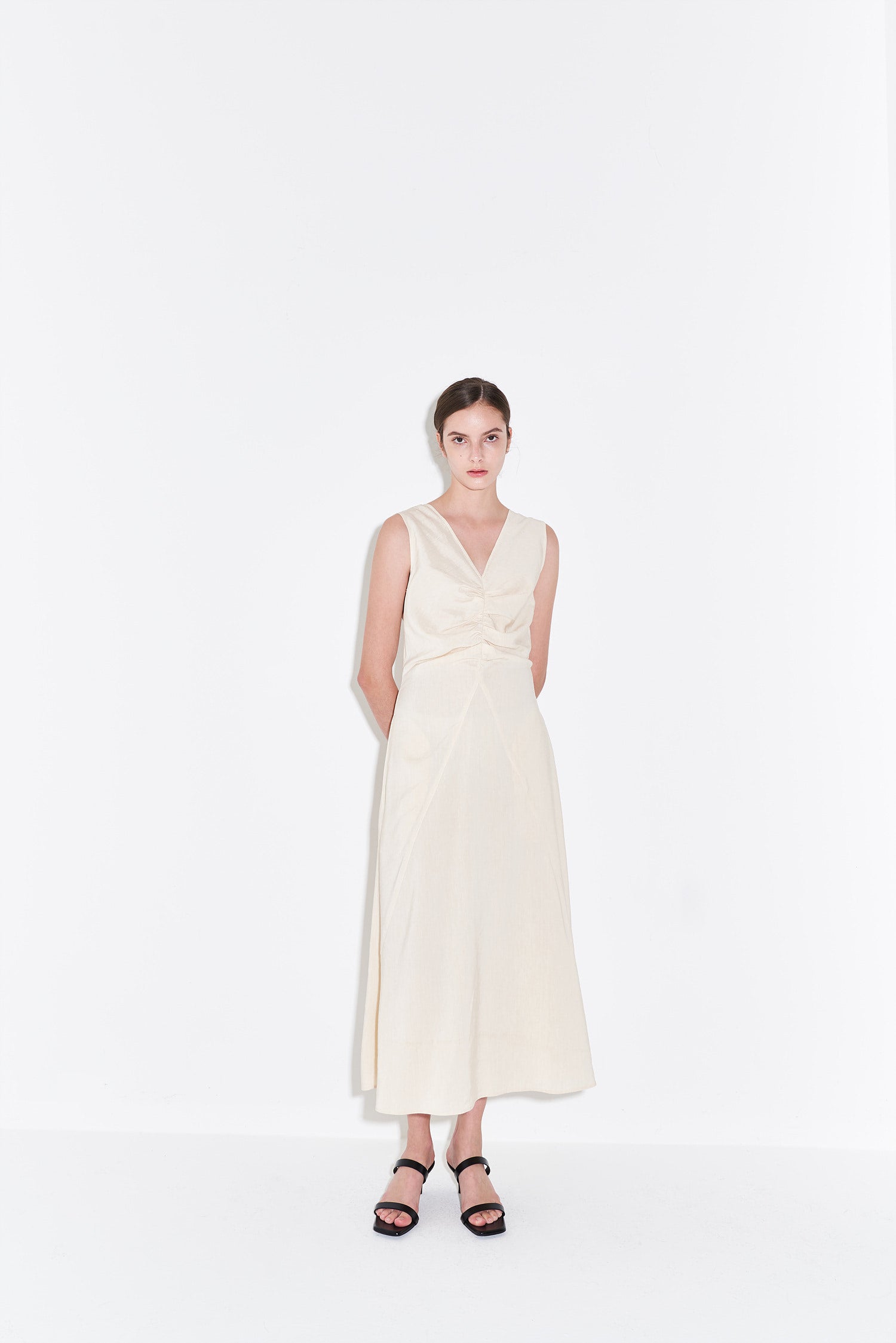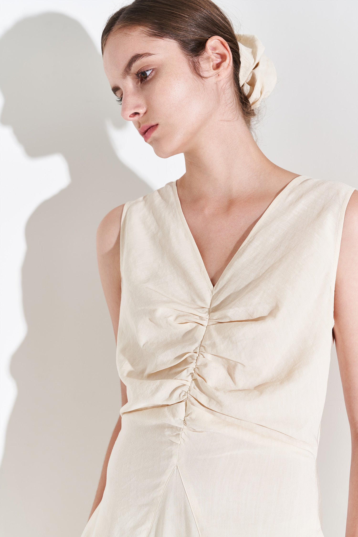 The Laura Ren sleeveless linen midi dress embodies effortless elegance with a touch of refined detail. Expertly crafted from breathable, natural linen, this women’s dress features a flattering V-neckline and delicate draped ruching at the waist, enhancing the feminine silhouette. The flared midi skirt provides graceful movement, while the hidden zipper ensures a seamless fit. Ideal for daytime events or relaxed summer occasions, this linen dress by Laura Ren combines comfort and timeless style, making it a versatile essential for every modern wardrobe.