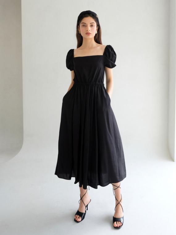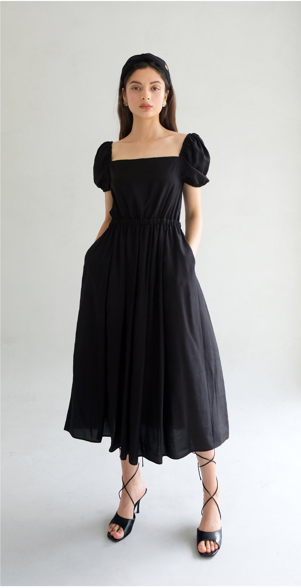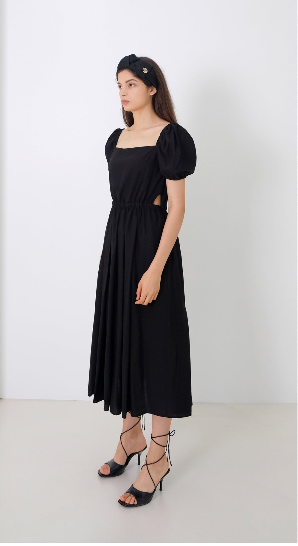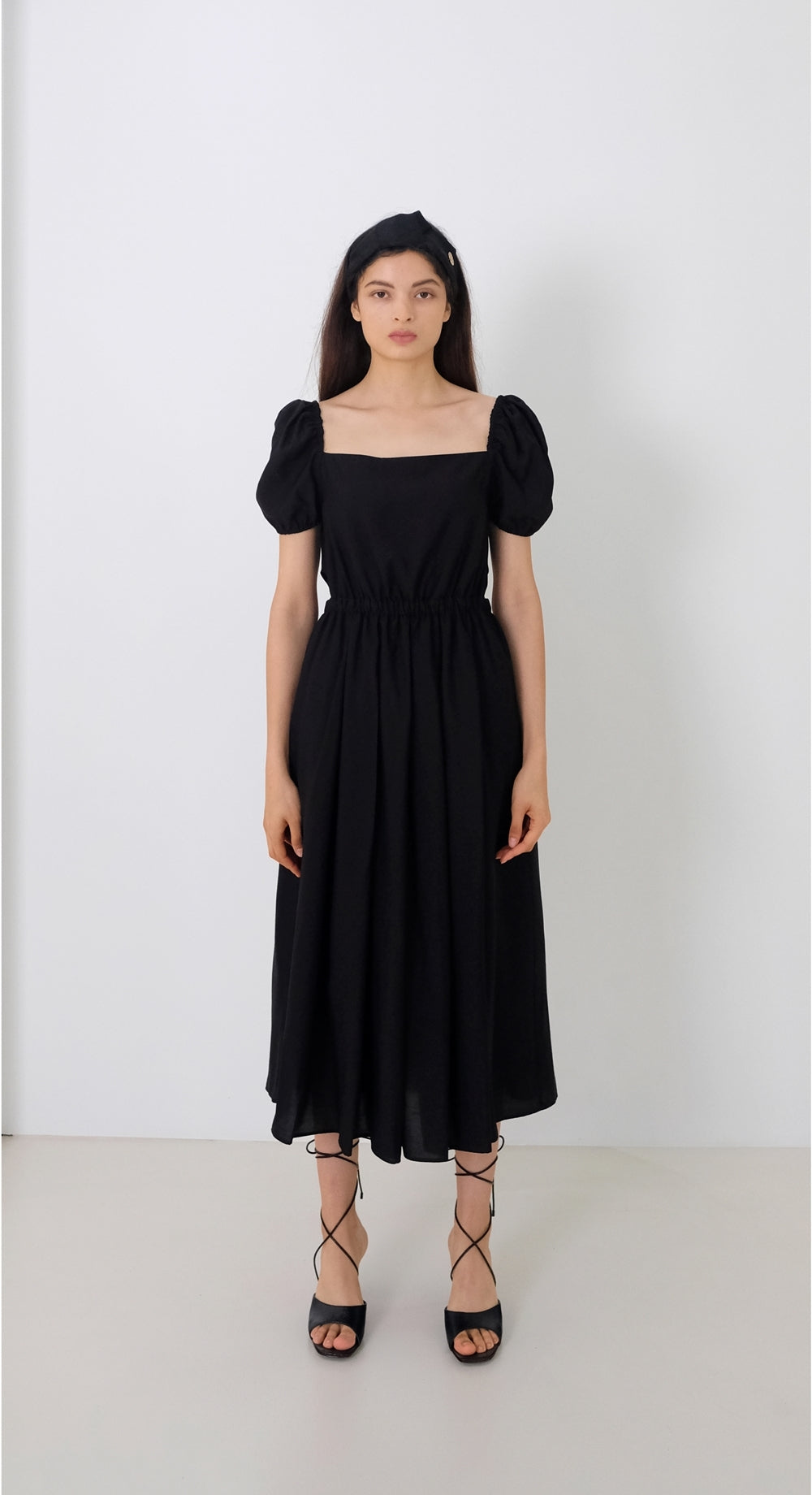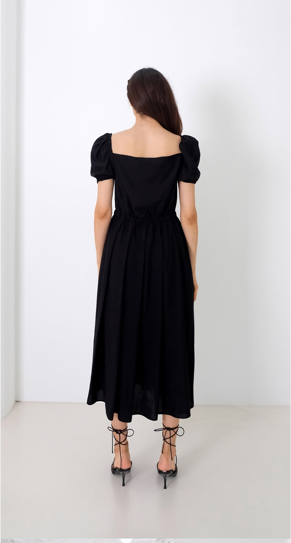 The sleeveless linen midi dress by Laura Ren captures timeless elegance with clean lines and smart detailing. Crafted from breathable linen, this dress features a wide V-collar neckline that drapes into a structured front with sculptural button closures. The fitted bodice subtly cinches at the back waist with an elastic gather, offering comfort while shaping the silhouette. Designed to fall just below the knee, this versatile piece transitions seamlessly from summer outings to effortless eveningwear. Every detail reflects Laura Ren’s dedication to refined silhouettes and wardrobe versatility.
