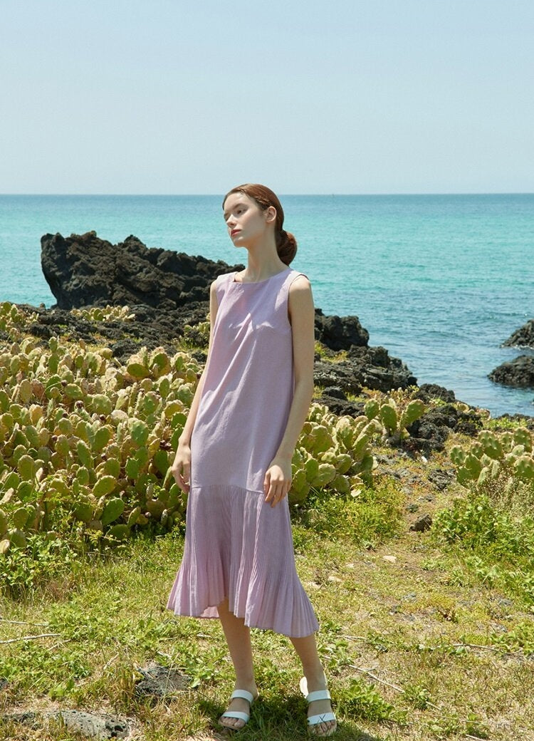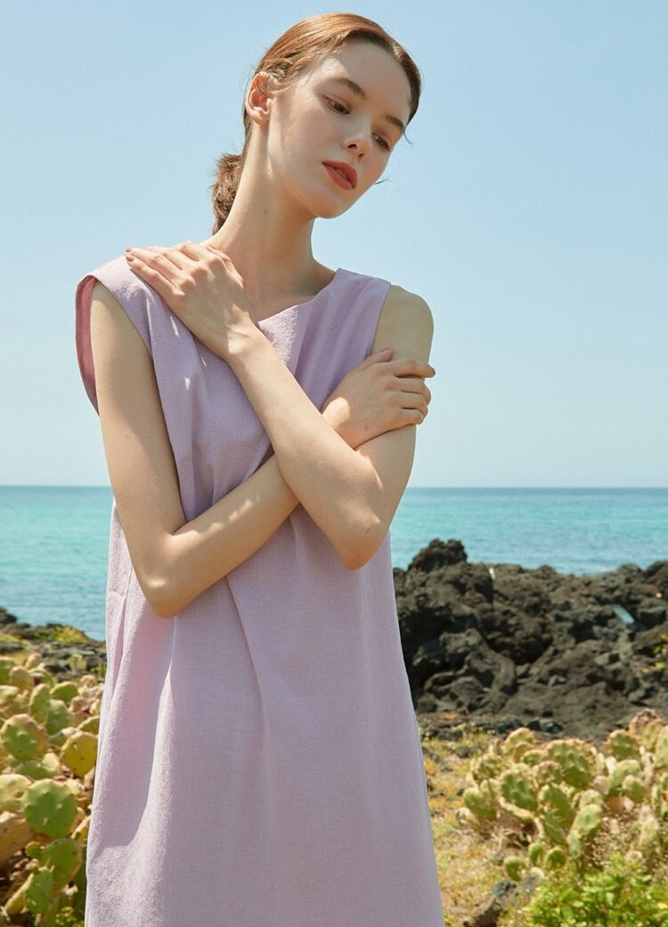 Embrace effortless elegance with this sleeveless linen dress from Laura Ren. Crafted from breathable, lightweight linen, this midi-length design features a graceful pleated hem and a flattering A-line silhouette, perfect for both beach days and urban strolls. The subtle back V-cut adds a refined touch, while the natural drape ensures comfort in every step. This dress captures the essence of minimalist sophistication, combining timeless charm with everyday versatility. Laura Ren’s attention to detail makes this a wardrobe staple for modern women who value understated luxury and premium natural fabrics.