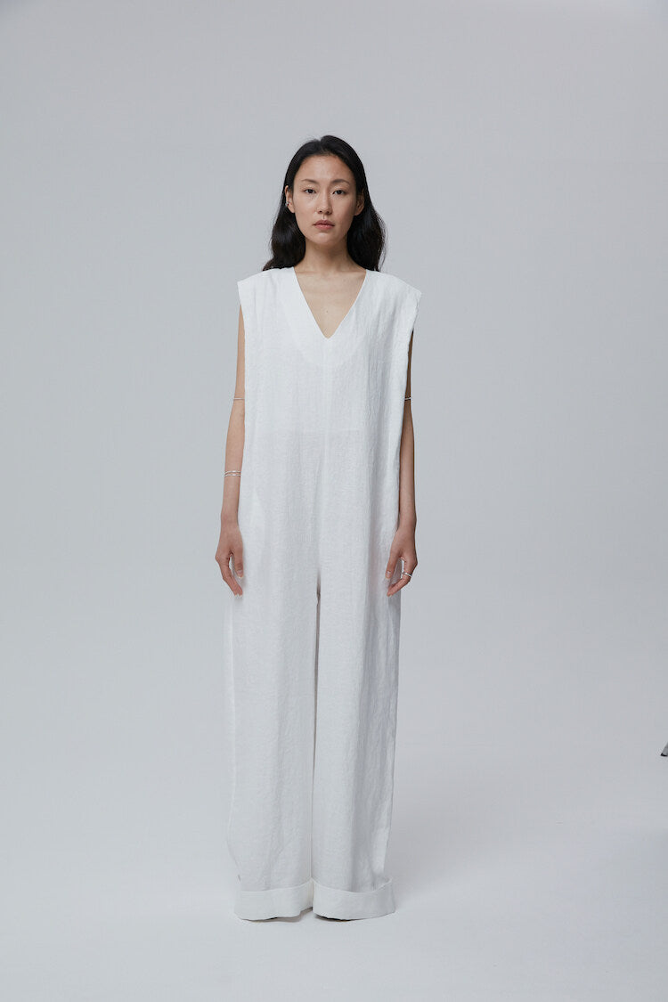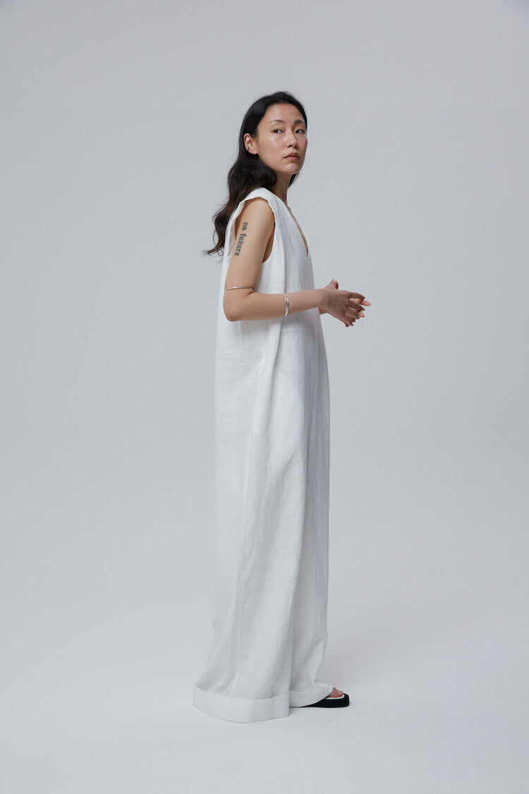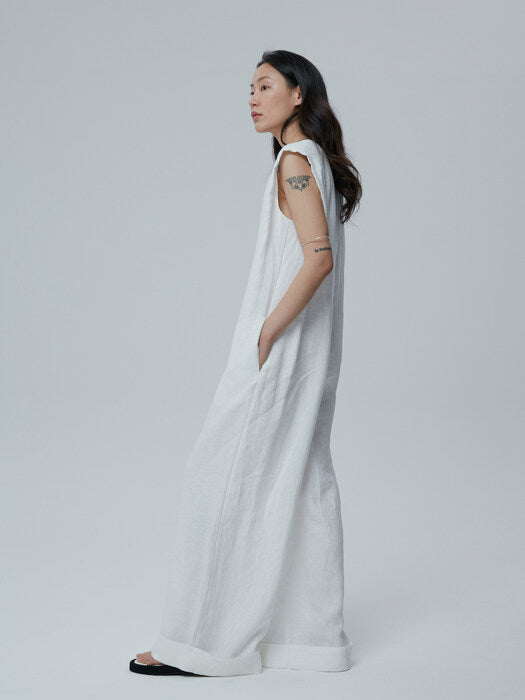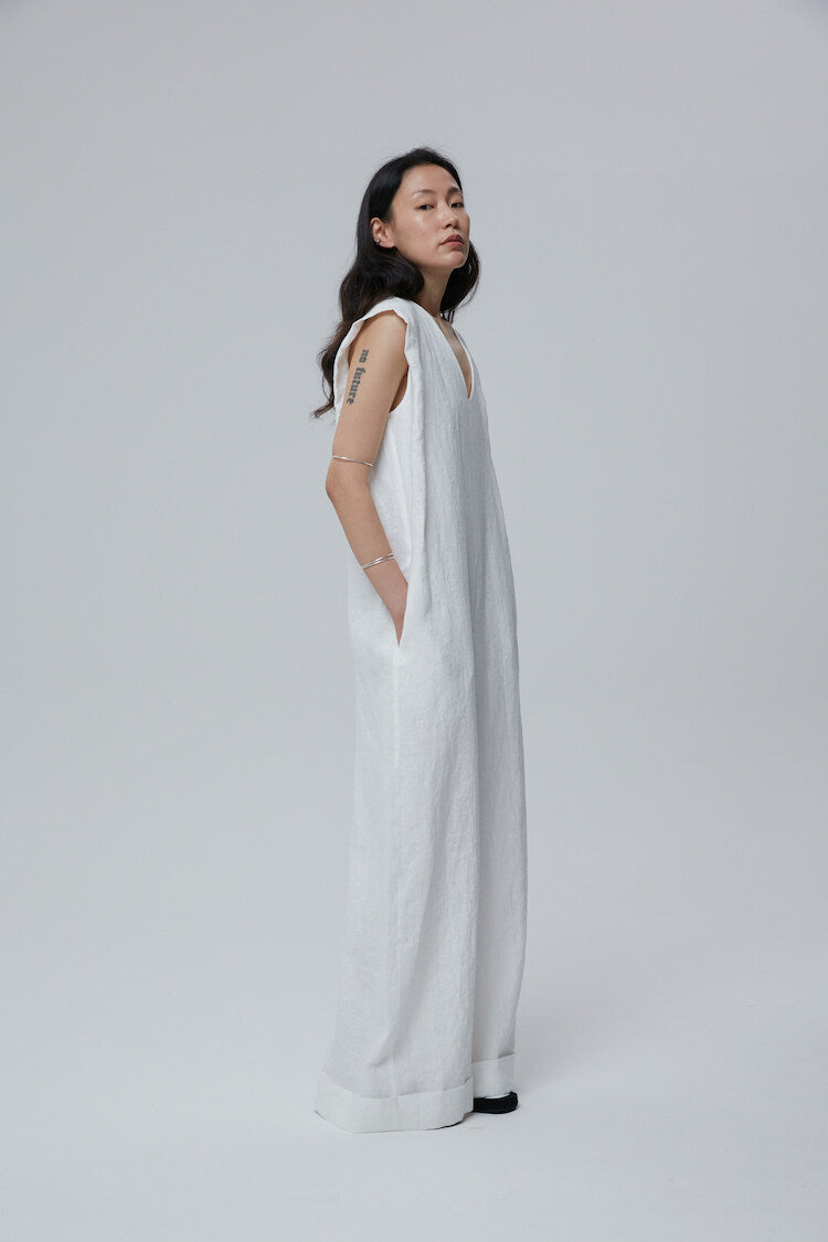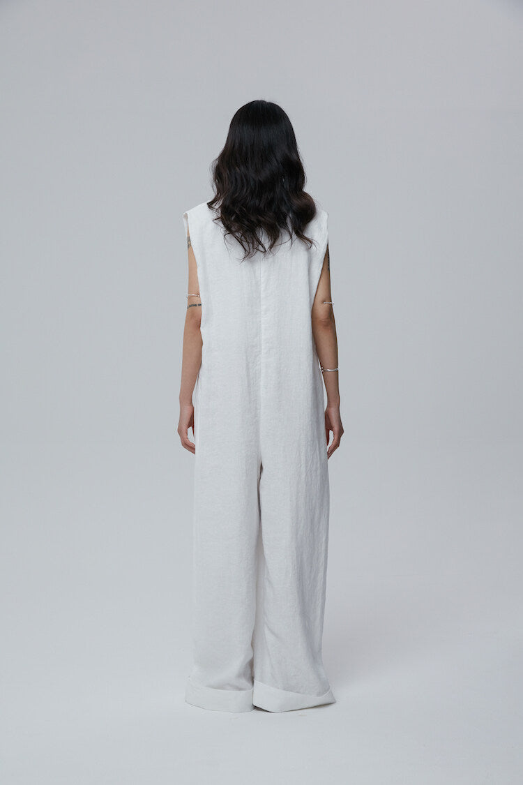 Effortlessly elegant, this sleeveless linen jumpsuit by Laura Ren is a minimalist’s dream. Crafted in crisp, breathable linen, it features a deep V-neckline and wide-leg silhouette that flows gracefully with movement. The exaggerated armholes and soft folds create an airy, nonchalant vibe, while the tailored hem cuffs add a structured finish. Perfect for resort days or elevated everyday wear, this piece is a fresh expression of Laura Ren’s modern femininity with a sculptural touch.