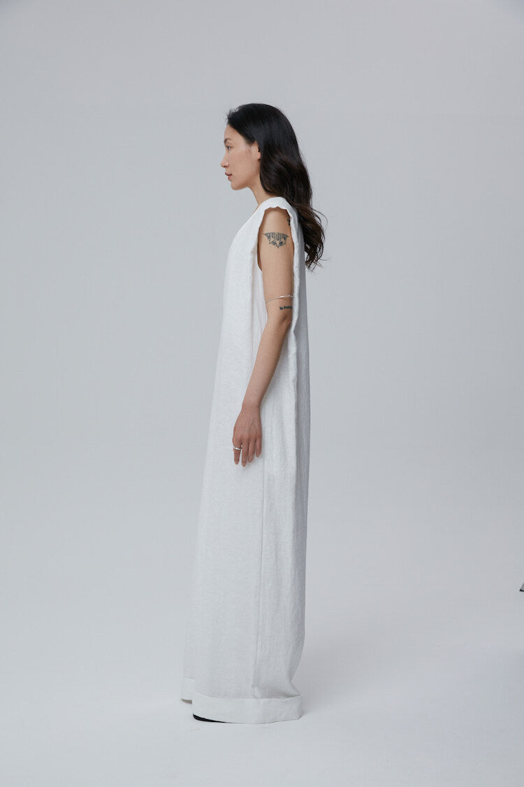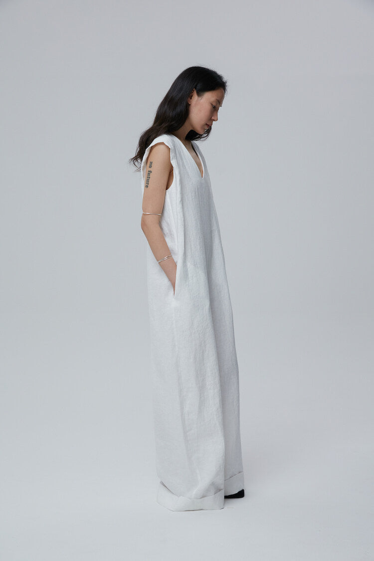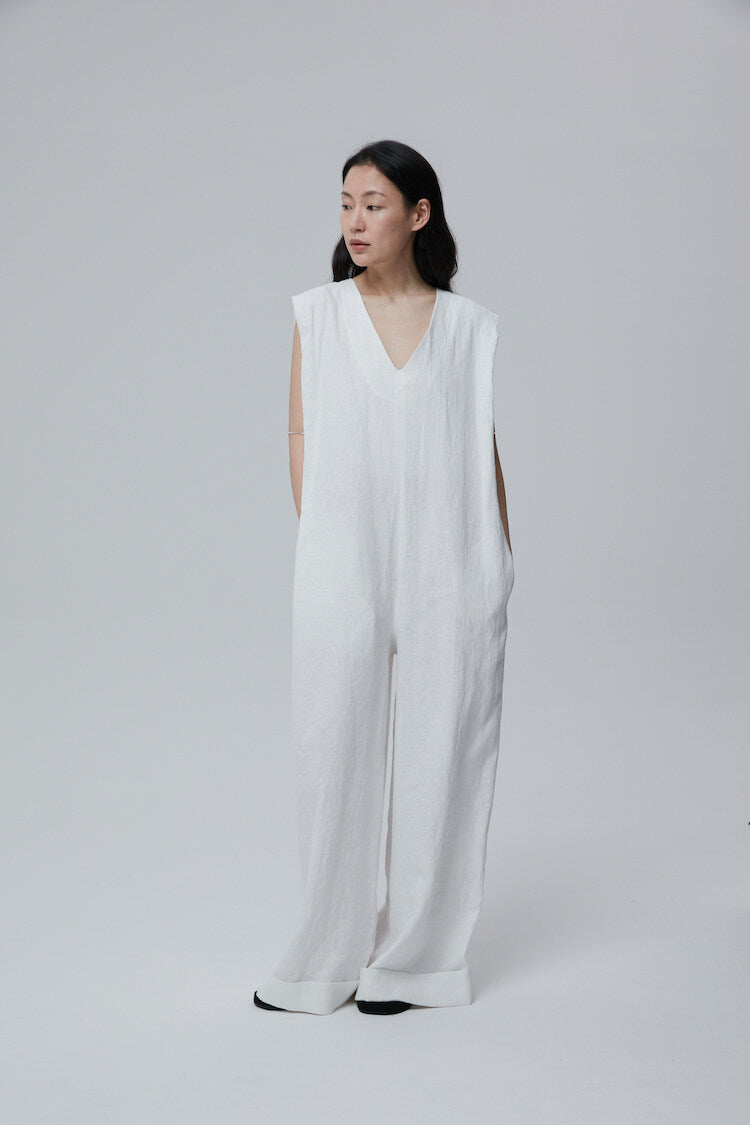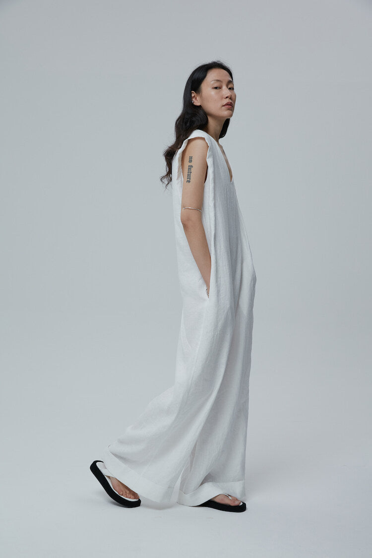 Effortlessly elegant, this sleeveless linen jumpsuit by Laura Ren is a minimalist’s dream. Crafted in crisp, breathable linen, it features a deep V-neckline and wide-leg silhouette that flows gracefully with movement. The exaggerated armholes and soft folds create an airy, nonchalant vibe, while the tailored hem cuffs add a structured finish. Perfect for resort days or elevated everyday wear, this piece is a fresh expression of Laura Ren’s modern femininity with a sculptural touch.