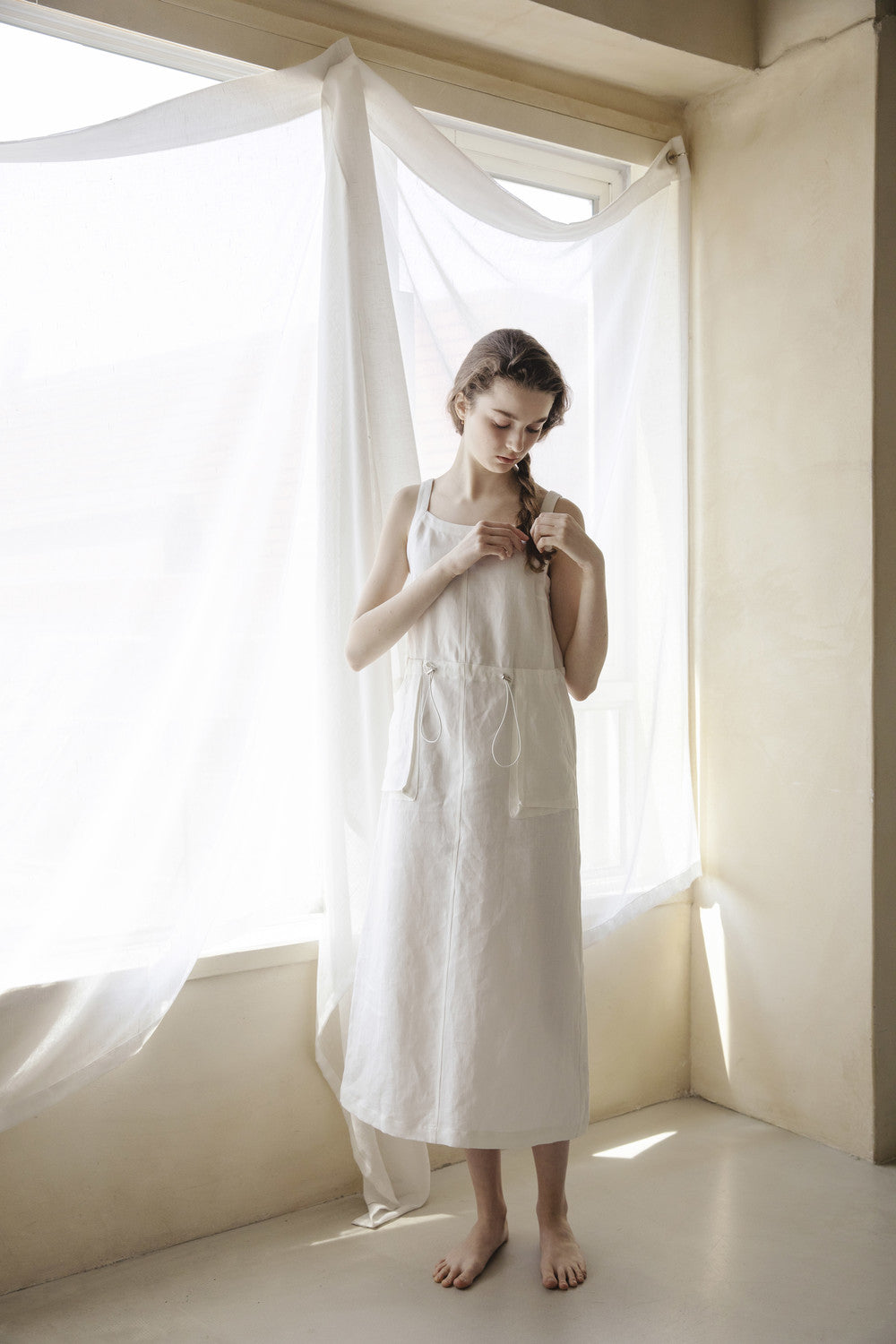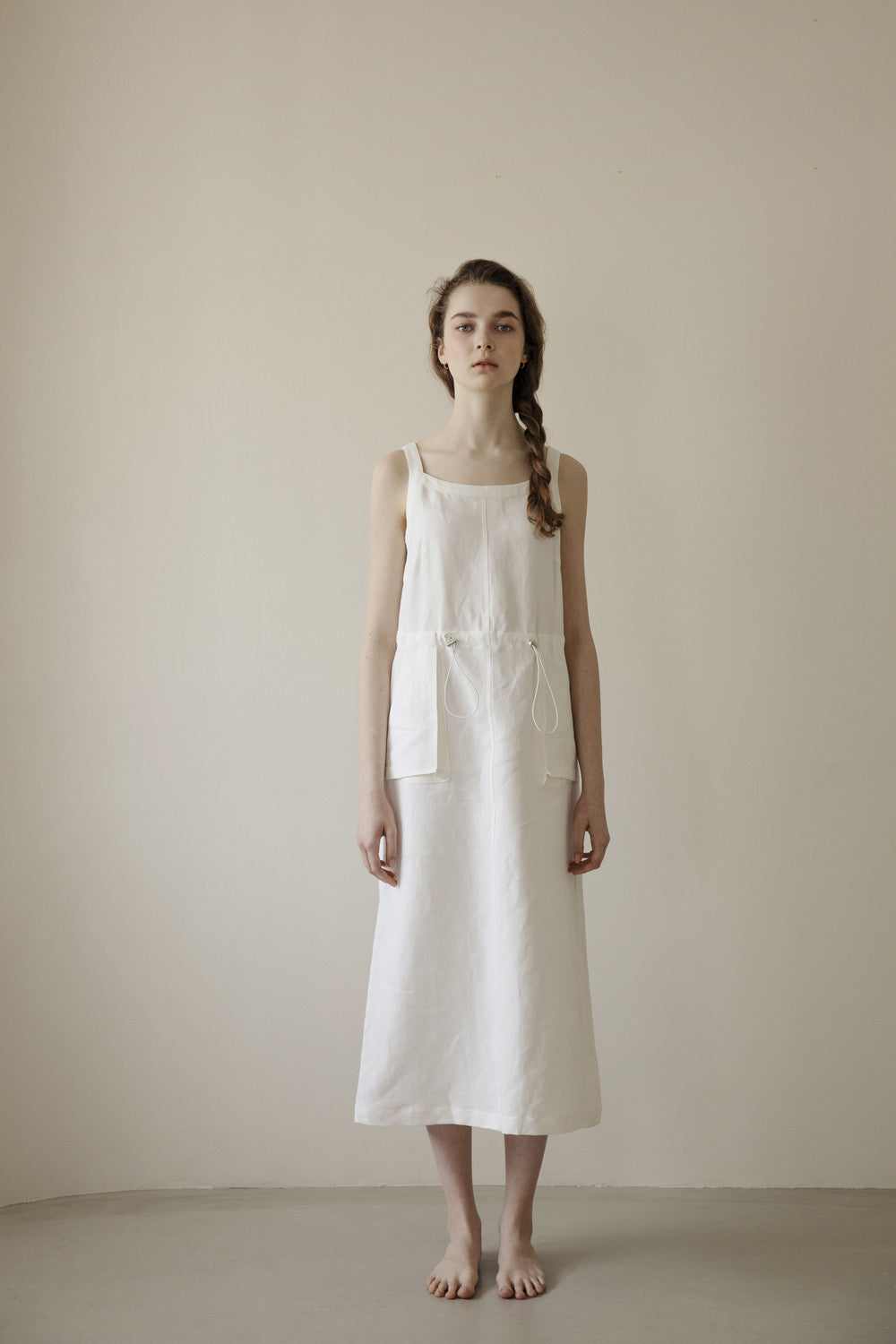 Channel refined minimalism with this sleeveless linen midi dress by Laura Ren. Crafted from pure, breathable linen, this dress features a square neckline, adjustable drawstring waist, and practical front patch pockets for a modern utility edge. The lightweight, natural texture ensures comfortable wear while the clean lines and tailored structure create an elegant silhouette. Whether styled for everyday simplicity or elevated with accessories, this versatile piece reflects Laura Ren’s dedication to timeless design and thoughtful functionality.