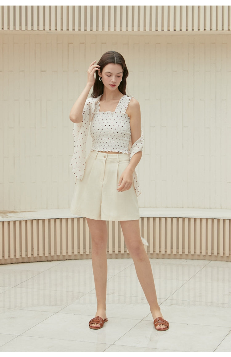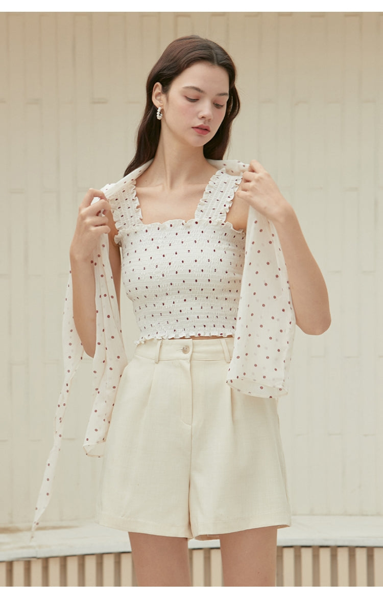 Elevate your warm-weather wardrobe with Laura Ren’s smocked linen blouse and matching lightweight overlay shirt. Designed for effortless elegance, this two-piece set features a fitted smocked crop top with soft ruffle straps for a romantic silhouette, paired with a breathable sheer shirt that adds flow and layering versatility. Crafted from premium linen-blend fabric, this airy ensemble balances comfort and sophistication, perfect for resort wear, weekend brunches, or chic strolls under the sun. Laura Ren redefines summer style with timeless femininity and luxurious fabric details.