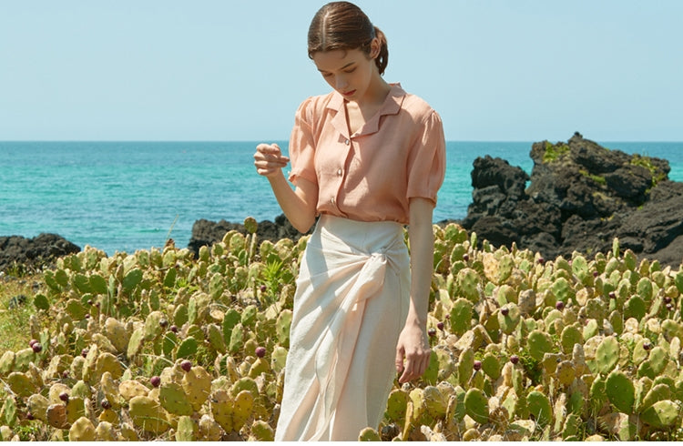 Elevate your warm-weather wardrobe with this refined silk blouse from Laura Ren. Crafted from breathable, lightweight silk, it features a soft sheen finish that drapes gracefully over the body. The blouse is designed with a gently structured collar, short puffed sleeves, and elegant pearl button detailing to exude timeless femininity. Its versatile cut makes it ideal for both casual seaside walks and elevated occasions. Pair it effortlessly with linen skirts or high-rise shorts to complete a look that feels as luxurious as it looks.