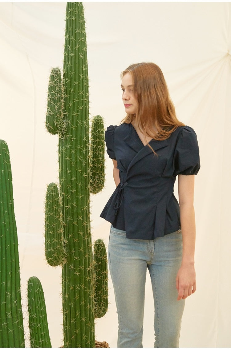 Laura Ren introduces a refined linen blouse that merges contemporary tailoring with romantic detailing. Designed with a structured wrap silhouette, this top features puffed short sleeves, a V-neck lapel collar, and a flattering side-tie closure that cinches the waist perfectly. Made from breathable natural linen, it offers both structure and softness, ideal for transitioning from day to evening looks. A polished yet feminine staple for warm-weather wardrobes.