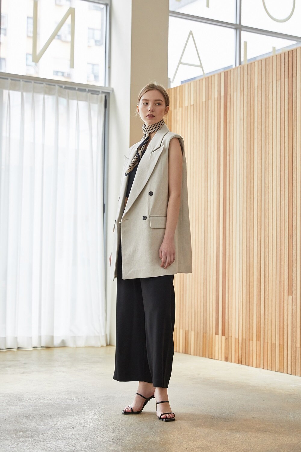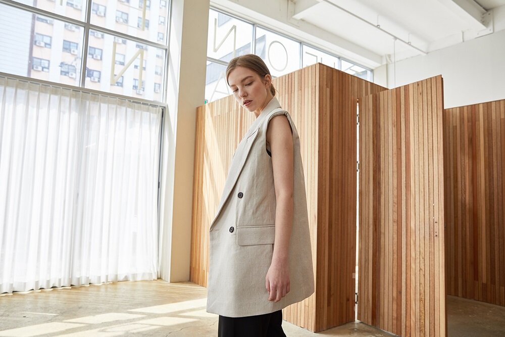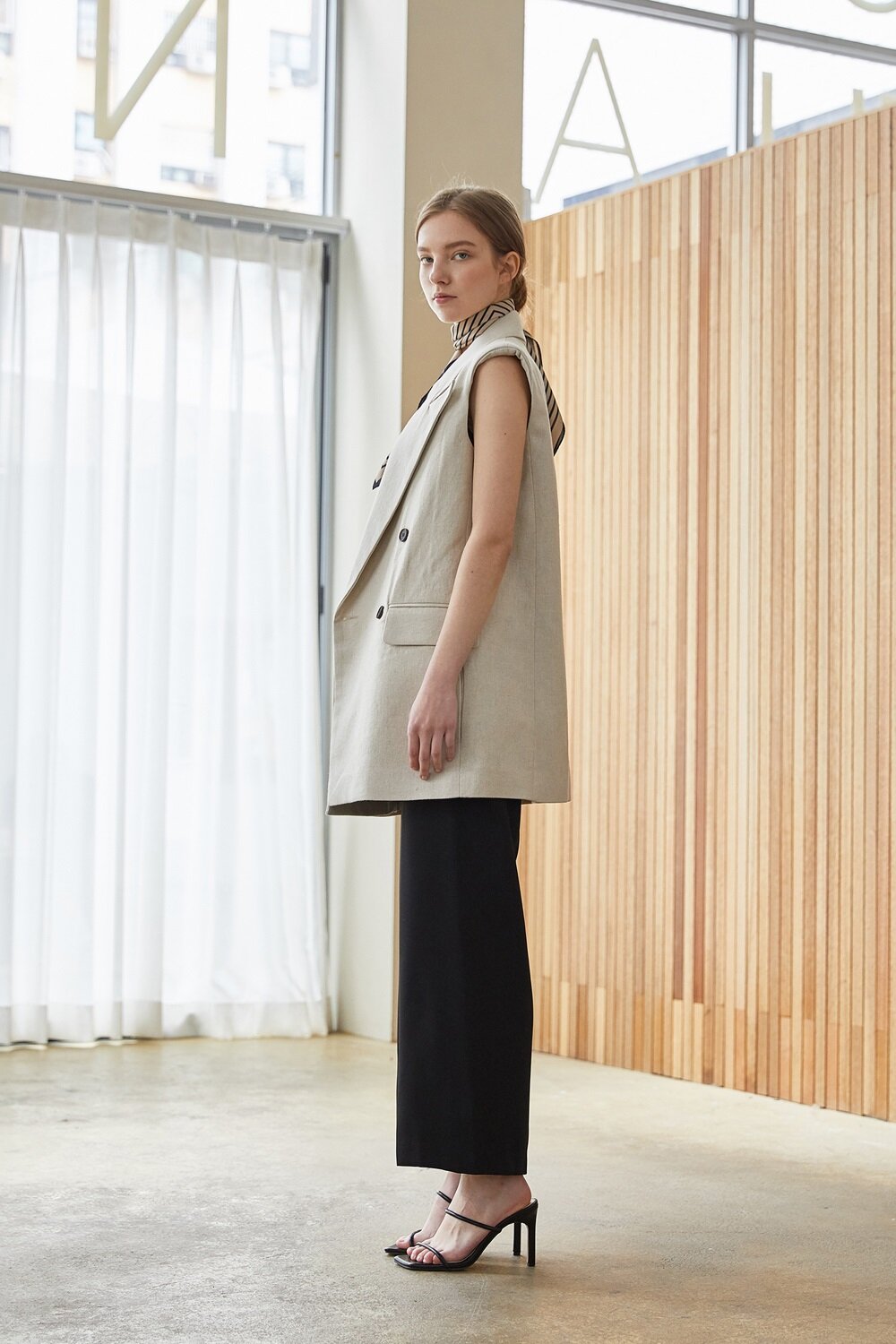 Elevate your warm-weather wardrobe with this tailored sleeveless linen blazer from Laura Ren. Crafted from premium breathable linen, this versatile blazer features a double-breasted front with bold buttons and sharp peak lapels for a commanding silhouette. Its elongated cut and lightly structured shoulders enhance the modern, minimalist aesthetic, making it the perfect layering piece for both professional and casual ensembles. Pair it effortlessly with tailored trousers, shorts, or even dresses to exude understated sophistication. Designed for women who appreciate timeless style and impeccable craftsmanship.