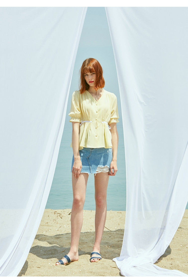 Laura Ren presents a delicately tailored linen blouse designed for effortless elegance. Crafted from breathable, lightweight linen, this button-up blouse features soft puff sleeves, a V-neckline, and adjustable waist ties to accentuate the silhouette. The gathered detailing adds a romantic touch, while the versatile cut makes it perfect for pairing with high-waisted skirts, trousers, or denim. Ideal for warm-weather wear, this blouse brings natural texture and timeless femininity to your wardrobe.