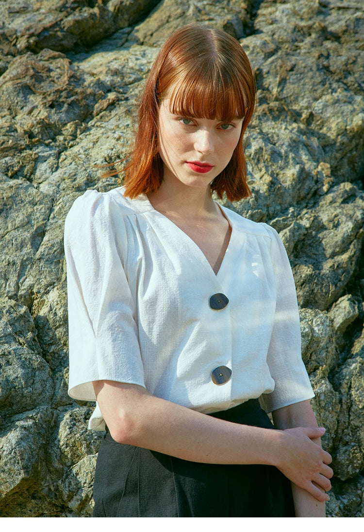 Laura Ren presents a timeless linen blouse crafted for refined comfort and contemporary flair. Designed with a flattering V-neckline and statement oversized buttons, this blouse is made from breathable linen, perfect for warm-weather sophistication. Puff sleeves add volume and elegance, while the tailored silhouette pairs beautifully with high-waisted trousers or skirts. Ideal for both beachside strolls and city chic looks, this blouse is a staple for versatile styling.