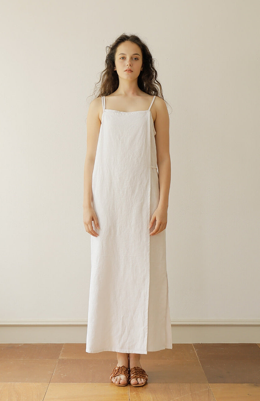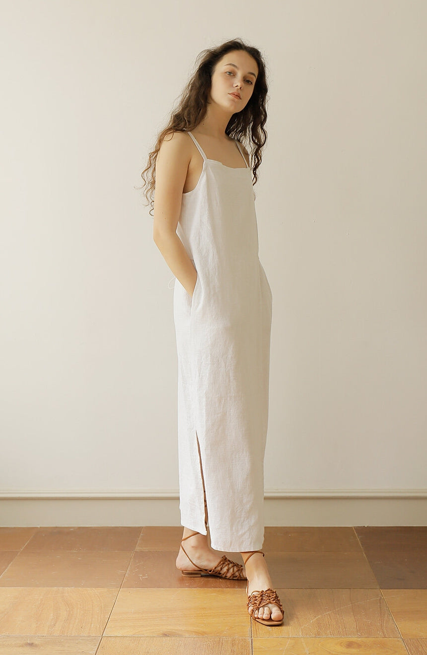 Effortlessly elegant, this white linen maxi dress from Laura Ren is a refined staple for summer wardrobes. Featuring delicate double spaghetti straps and a straight neckline, the design offers a clean, minimal silhouette perfect for warm-weather styling. The dress includes an adjustable waist tie that can be styled to accentuate your shape or left loose for relaxed drape. Crafted from 100% breathable linen, this maxi-length piece flows naturally with every step, making it ideal for beach getaways, garden parties, or resort lounging. Laura Ren merges comfort and sophistication in this versatile piece.