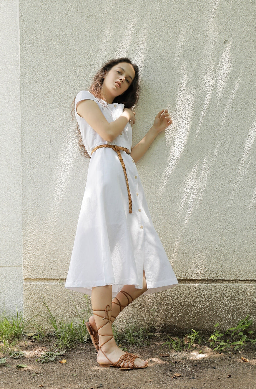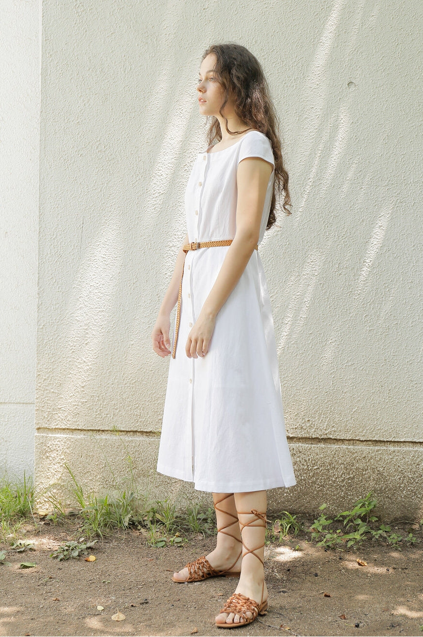 Timeless and effortlessly chic, this white linen midi dress from Laura Ren is designed for refined summer elegance. Made from breathable linen, it features a flattering boat neckline and cap sleeves that enhance the natural lines of the body. The full-length button-front closure adds both visual detail and ease of wear, while the softly flared skirt creates beautiful movement. Lightweight yet structured, this dress offers a clean silhouette perfect for everything from coastal getaways to city strolls. Laura Ren combines form, function, and sophistication in this warm-weather essential.