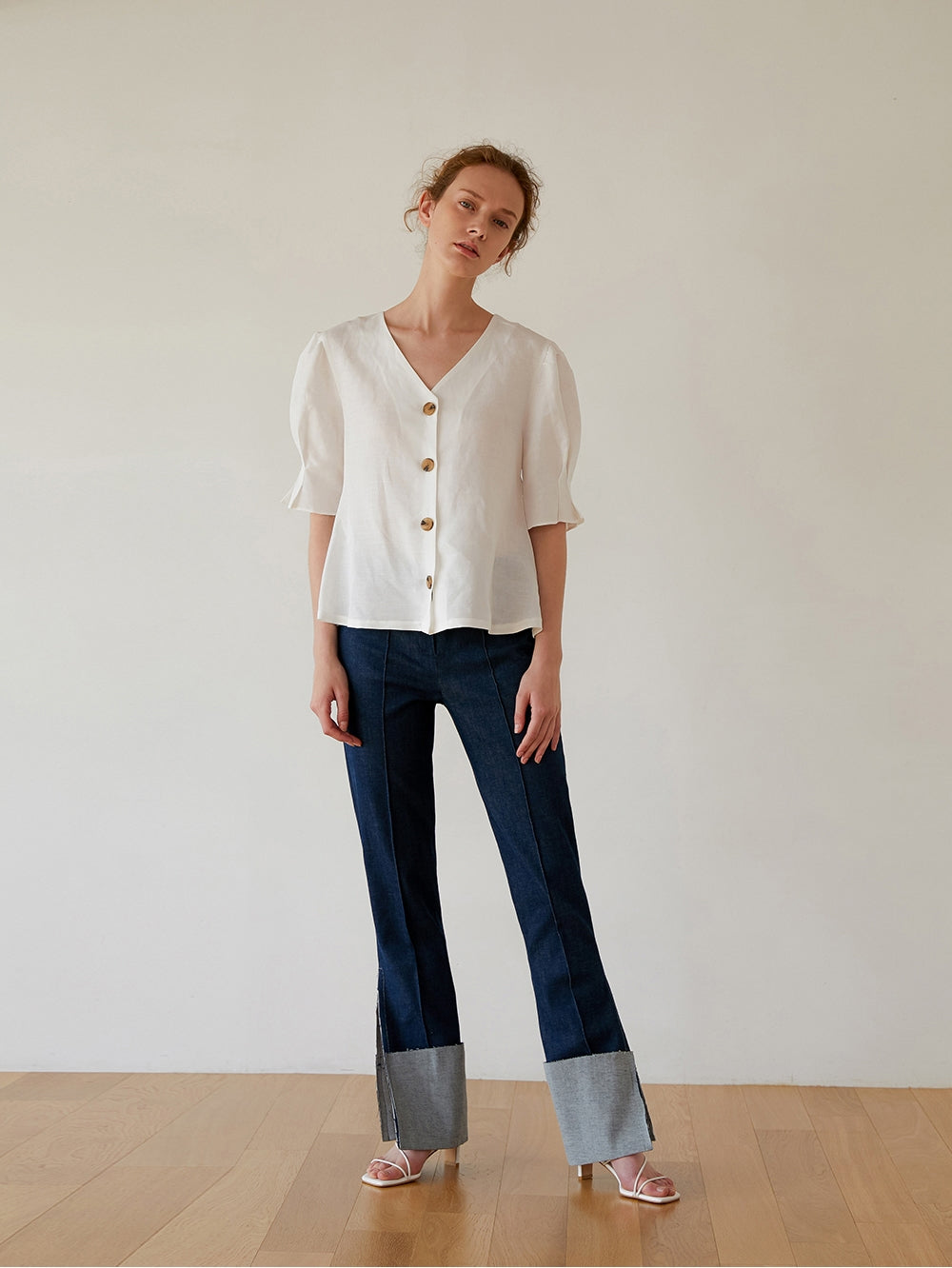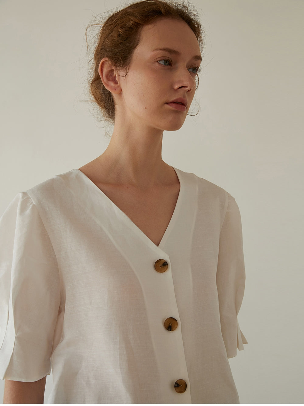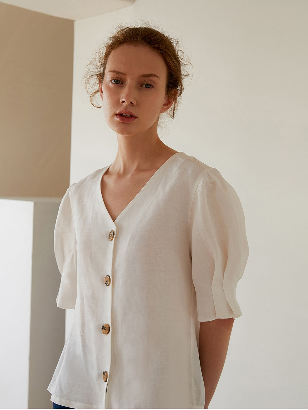 Timeless elegance meets breathable comfort in this linen blouse from Laura Ren, designed for effortless everyday refinement. Crafted from lightweight linen, this blouse features softly gathered puff sleeves, a flattering V-neckline, and natural-toned button detailing for a clean, modern look. The elbow-length sleeves offer modest coverage while maintaining a breezy silhouette, perfect for warm-weather wear. Its slightly boxy fit and crisp structure make it ideal for pairing with tailored trousers or relaxed denim. A versatile essential that blends classic femininity with contemporary ease.