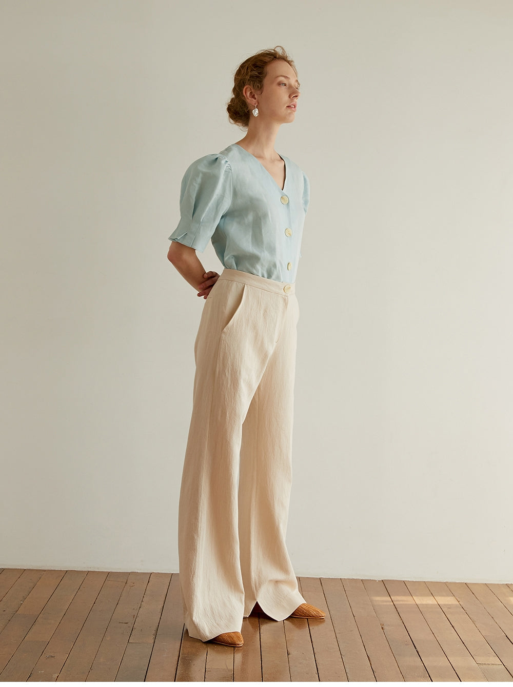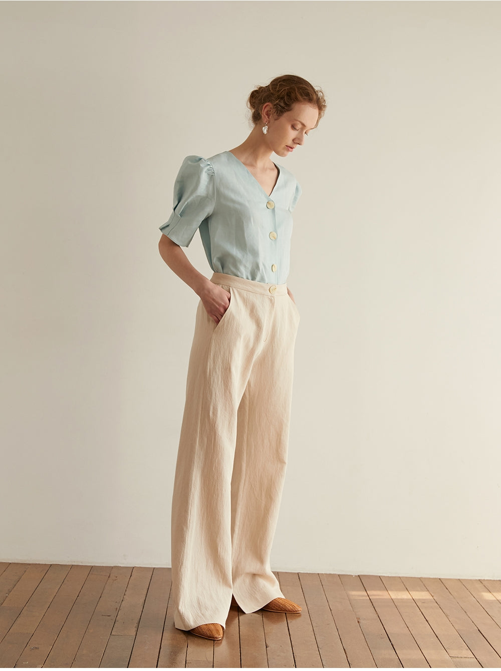Elevate your warm-weather wardrobe with this linen blouse by Laura Ren, crafted to combine tailored polish with breathable comfort. Made from 100% linen, this top features voluminous puff sleeves with pleated detail, a flattering V-neckline, and oversized tonal buttons for a modern minimalist touch. The relaxed fit and soft structure make it perfect for tucking into high-waisted trousers or pairing with skirts for both casual and dressy occasions. Whether you're heading to brunch or a summer event, this piece delivers timeless femininity with an effortless silhouette.