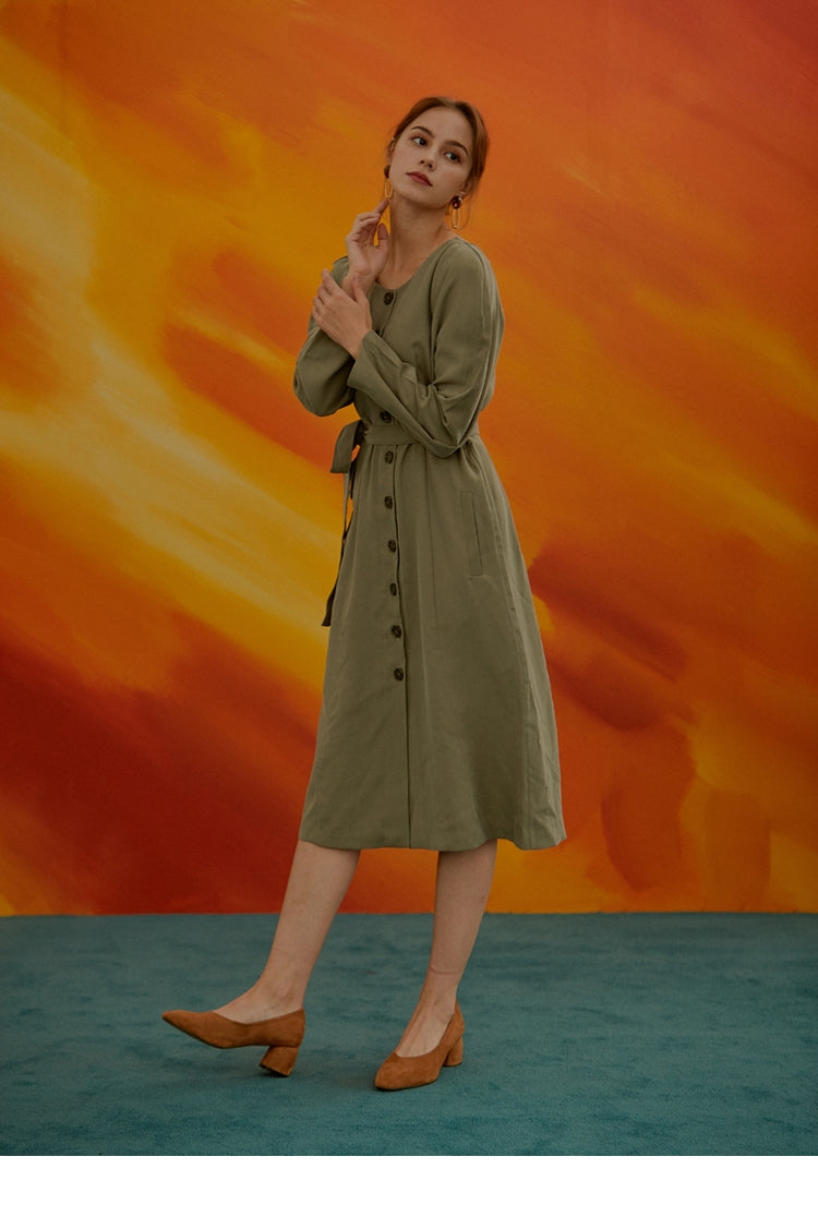 Discover understated sophistication with this beautifully tailored linen midi dress from Laura Ren. Made from lightweight, breathable linen, it features a classic round neckline, full button-front closure, and a detachable self-tie waist belt that defines your shape. The long sleeves and minimalist design offer a timeless silhouette perfect for casual days or work-ready looks. The fluid drape and subtle details elevate this essential piece for any season. Ideal for women who value both comfort and elegance in their everyday wardrobe, this dress blends natural texture with polished refinement.