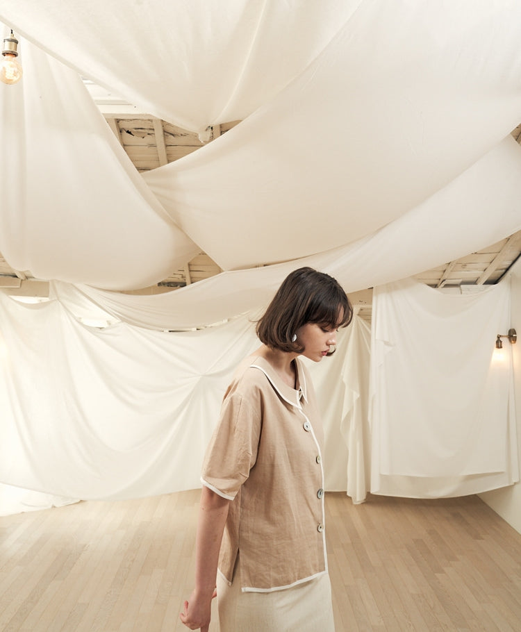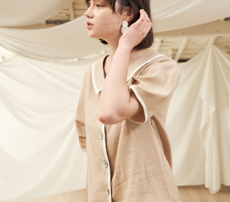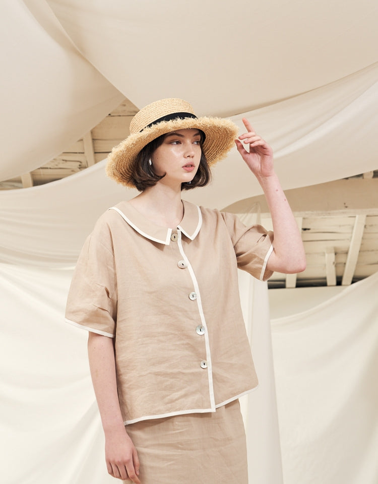 Crafted from breathable linen, this button-up blouse by Laura Ren offers an effortless blend of elegance and comfort. Featuring a timeless Peter Pan collar and charming contrast piping, this design adds subtle detail to a classic silhouette. The short sleeves and relaxed fit make it a perfect choice for warm-weather layering or solo styling. Whether paired with a matching linen skirt or tailored trousers, this blouse elevates your everyday wardrobe with understated refinement. A must-have for women seeking quality and style in their seasonal essentials.