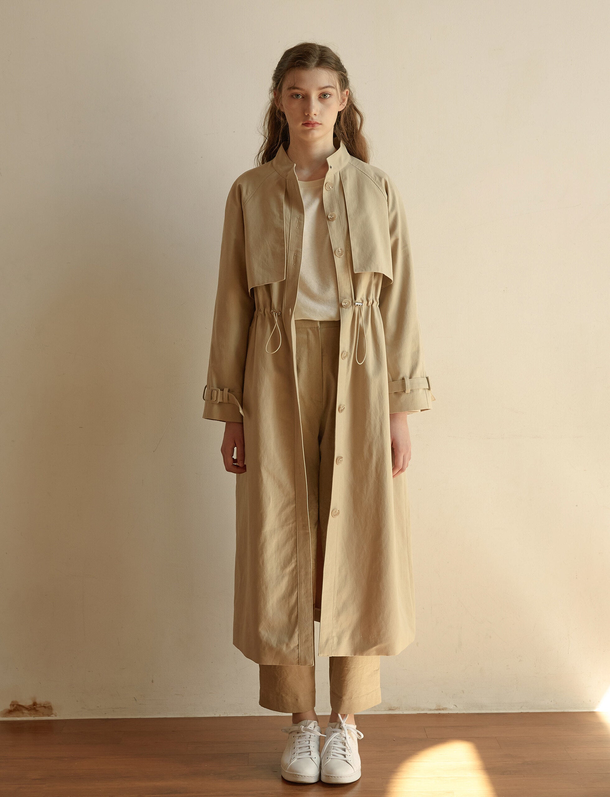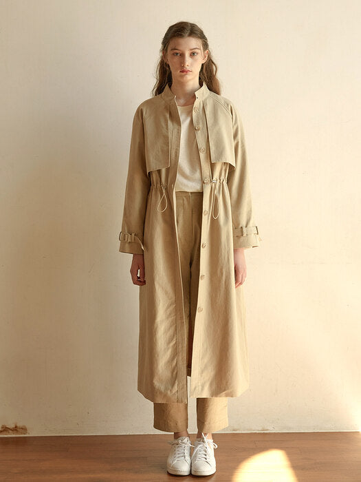 Step into transitional style with this longline linen coat from Laura Ren, designed for elegant layering across seasons. Made from breathable linen, this coat features a full-length button-front, adjustable drawstring waist, and a signature cape overlay for architectural sophistication. The long sleeves are detailed with adjustable cuffs, blending functionality with modern tailoring. Whether styled casually with denim or layered over tailored ensembles, this coat offers refined comfort and versatility. Laura Ren combines natural textures and minimalist structure in this essential outerwear piece.