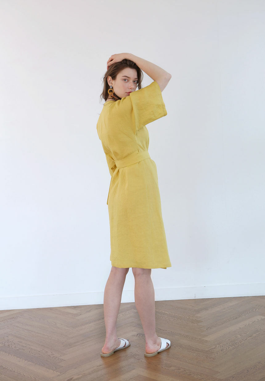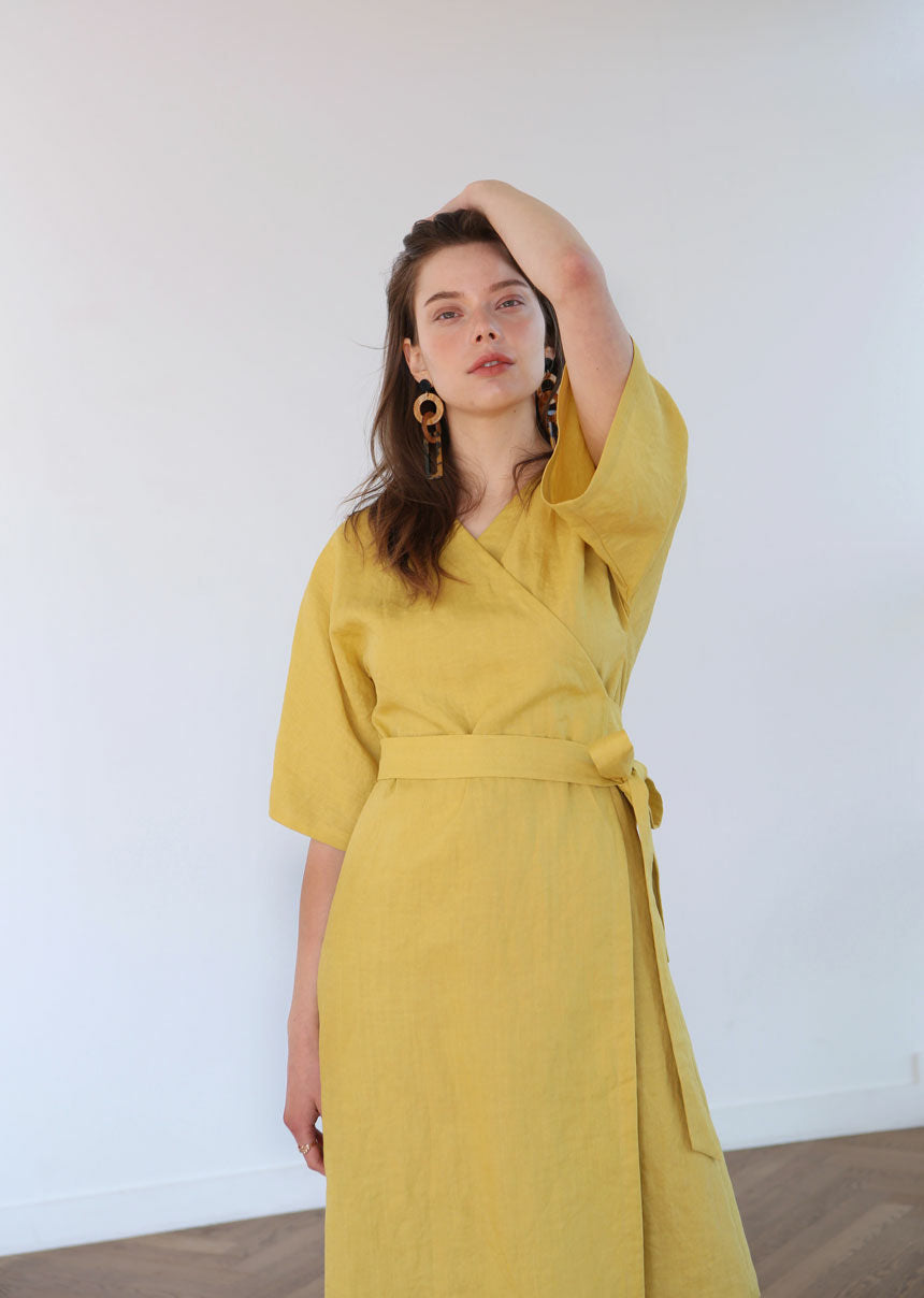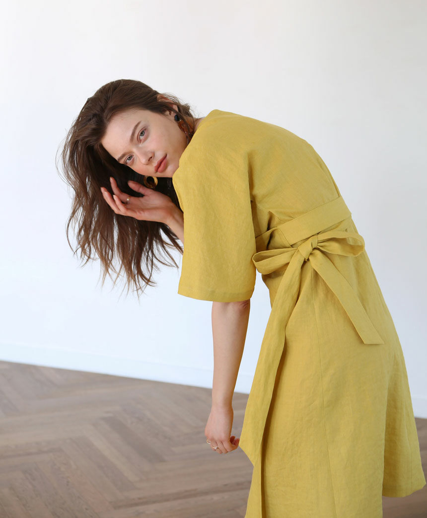 Laura Ren presents this effortlessly elegant linen wrap dress, tailored from breathable, natural linen fabric. Designed with a flattering wrap-front silhouette, it cinches at the waist with a self-tie belt to accentuate the figure. Elbow-length sleeves offer a refined touch, while the knee-length cut ensures easy wear from day to evening. Lightweight and versatile, this dress is ideal for warm-weather styling with understated sophistication.