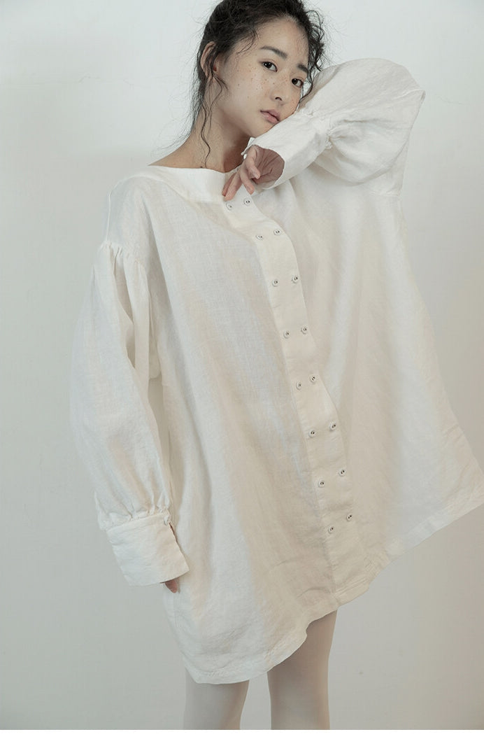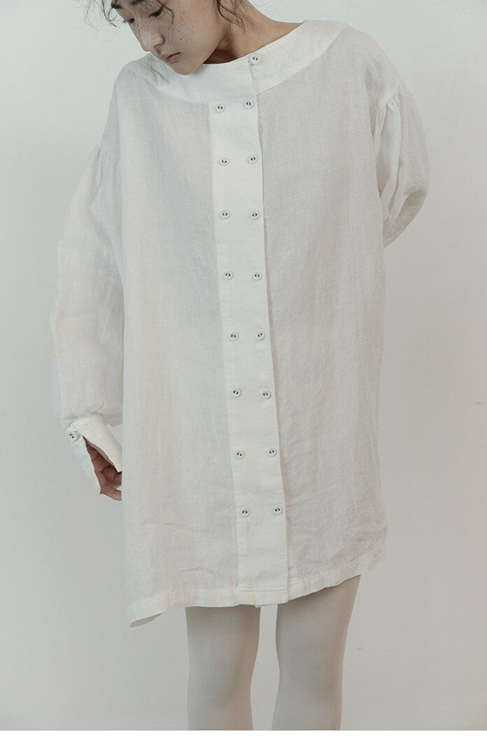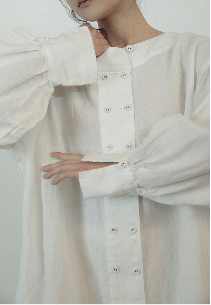 The Alisha Linen Cotton Double Breasted Bishop Long Sleeve Shirt exudes elegance and sophistication with its double-breasted design and bishop long sleeves. Made from a luxurious blend of linen and cotton, this shirt is both comfortable and stylish. Perfect for the fashion-forward individual who wants to make a statement in their wardrobe.