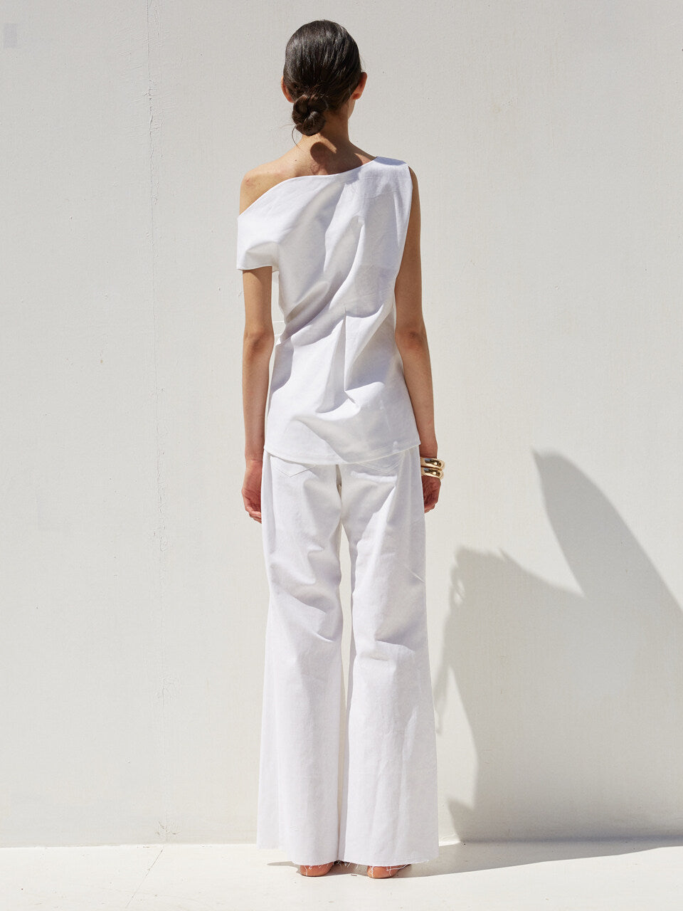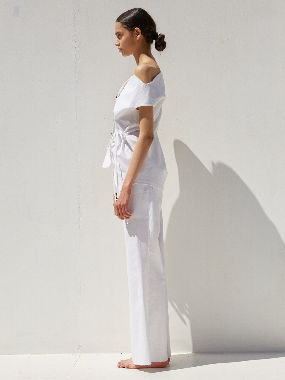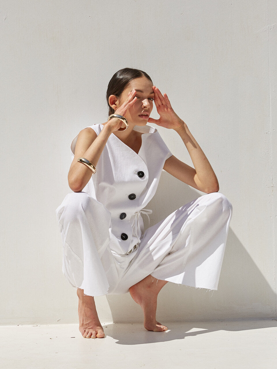 Discover contemporary elegance with this asymmetric button-front linen top by Laura Ren, designed for the modern minimalist. Made from premium breathable linen, the piece features a sculptural one-shoulder neckline, bold contrast buttons, and a flattering side tie detail that accentuates the waist. Its architectural silhouette brings a statement-making edge to your summer wardrobe while offering effortless versatility. Whether styled with tailored pants or relaxed skirts, this refined linen top transitions seamlessly from casual daywear to elevated evening style.