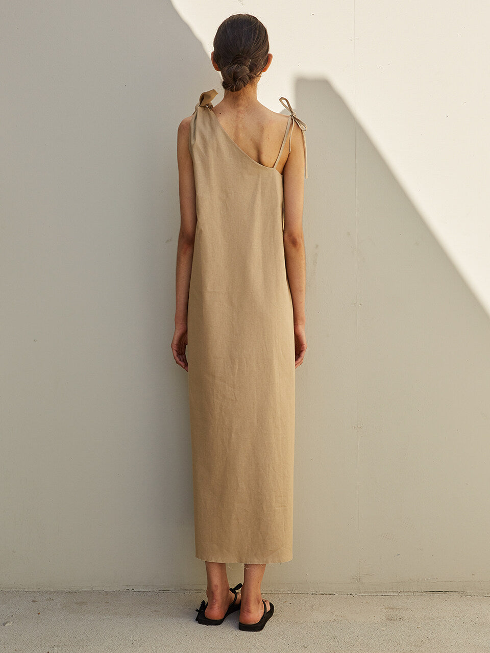 This one-shoulder linen maxi dress by Laura Ren exudes minimalist elegance and effortless versatility. Designed in a lightweight, breathable linen, it features a clean, column silhouette that softly skims the body. The asymmetrical neckline is accentuated with delicate adjustable tie straps, offering both a secure fit and subtle feminine detail. Its full-length cut provides graceful coverage while maintaining a relaxed, warm-weather feel. Ideal for summer occasions, resort looks, or understated evening wear, this piece captures modern sophistication with timeless appeal.