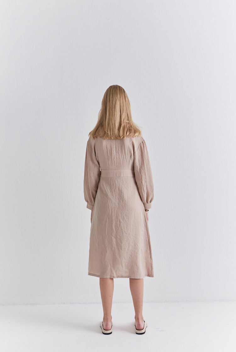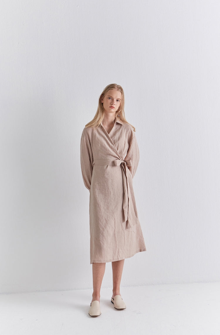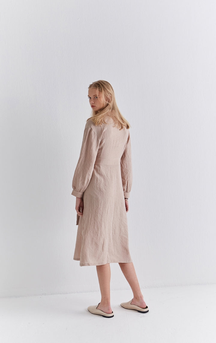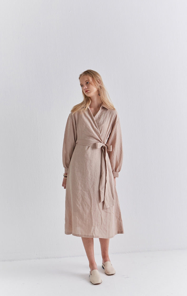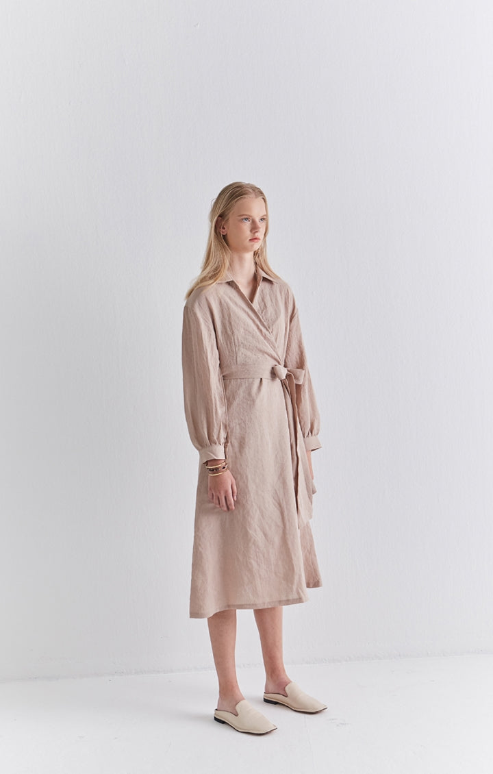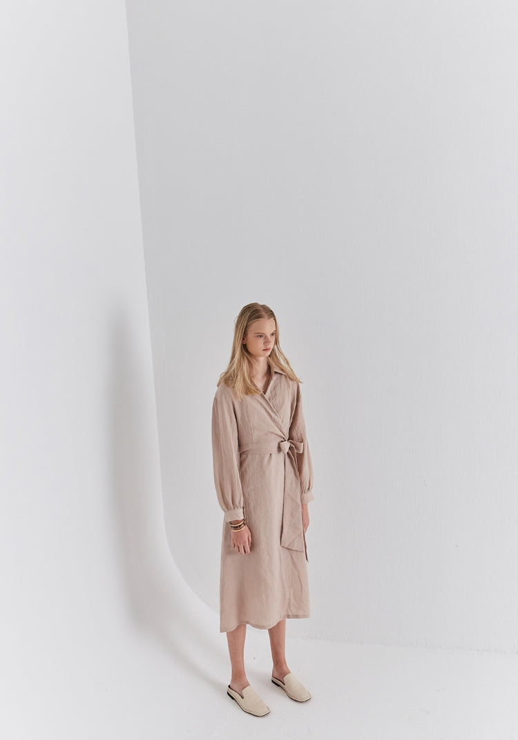 Crafted from breathable, lightweight linen, this wrap-style midi dress from Laura Ren is the perfect blend of elegance and ease. Featuring a soft collared neckline, long voluminous sleeves with cuffed hems, and a flattering waist tie, the silhouette cinches effortlessly to enhance your figure. The refined beige tone complements its minimalist design, making it ideal for both casual sophistication and polished daytime looks. This versatile piece flows gently to a midi length, offering graceful movement with every step. Laura Ren’s linen dress is a modern classic that redefines everyday luxury with timeless appeal.