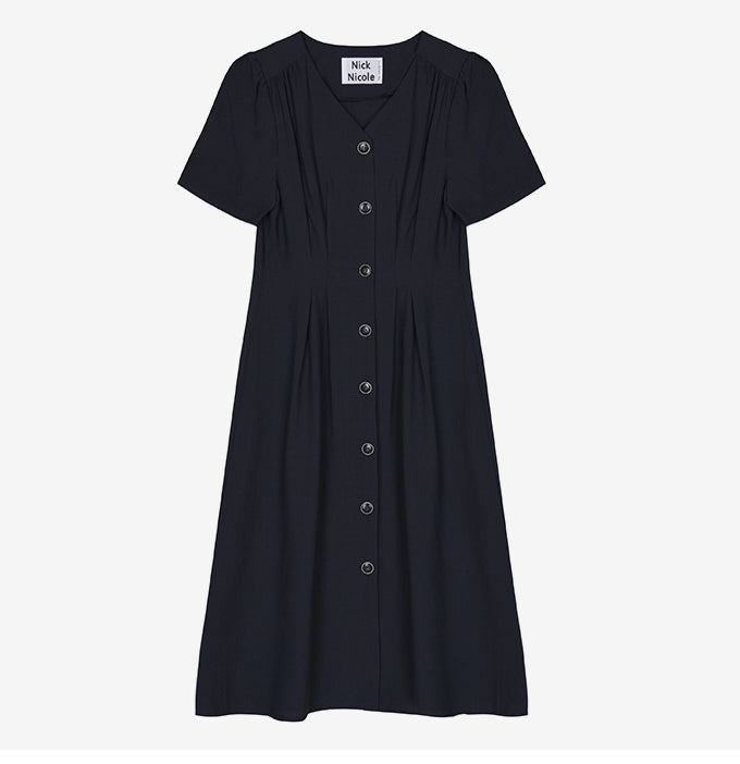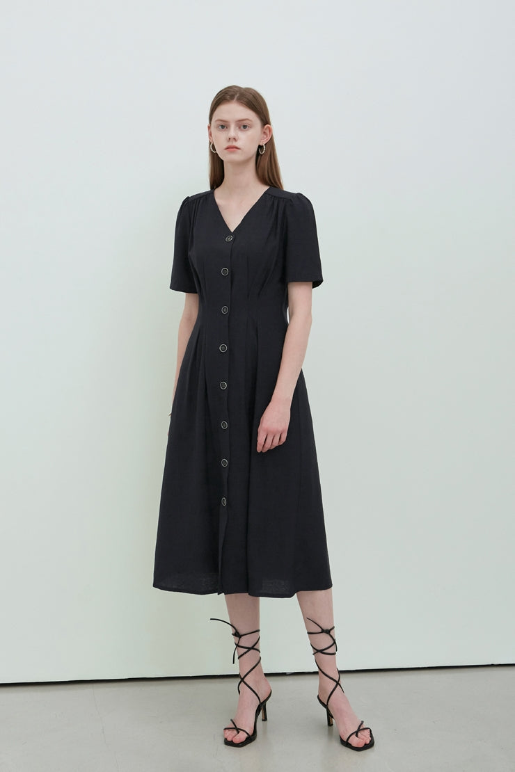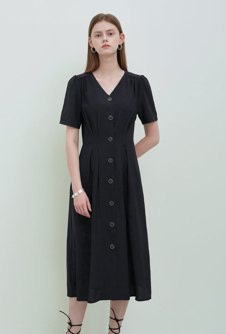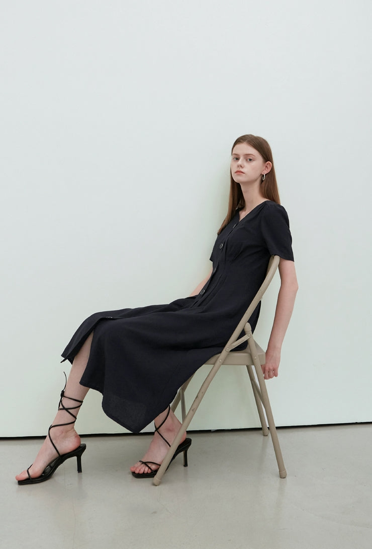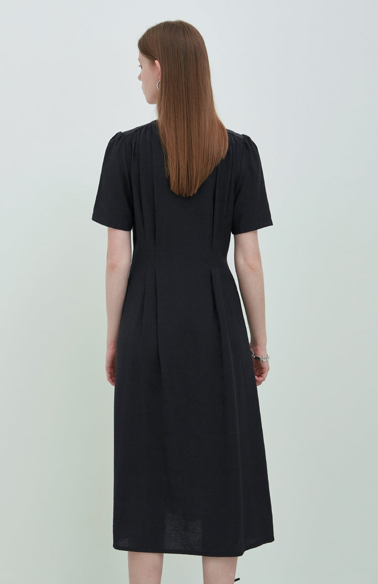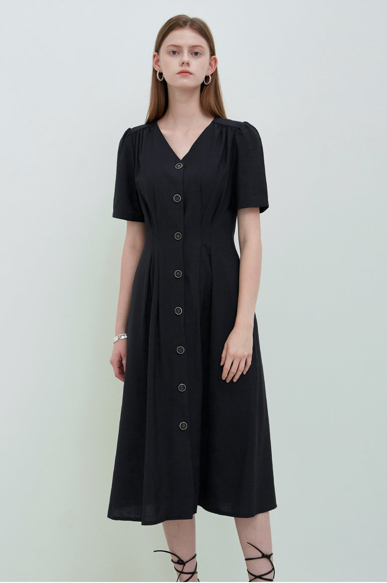 Laura Ren's black linen V-neck midi dress is a refined staple designed for modern elegance and breathable comfort. Made from lightweight natural linen, it features a flattering V neckline, delicate short sleeves, and a full front button placket. Subtle pleating along the shoulder and waist ensures a softly structured silhouette, while the gently flared skirt provides ease of movement. Perfect for office days, city strolls, or relaxed evening gatherings, this midi dress balances understated charm with tailored polish. A timeless piece, Laura Ren reimagines quiet luxury through clean lines and versatile wear.