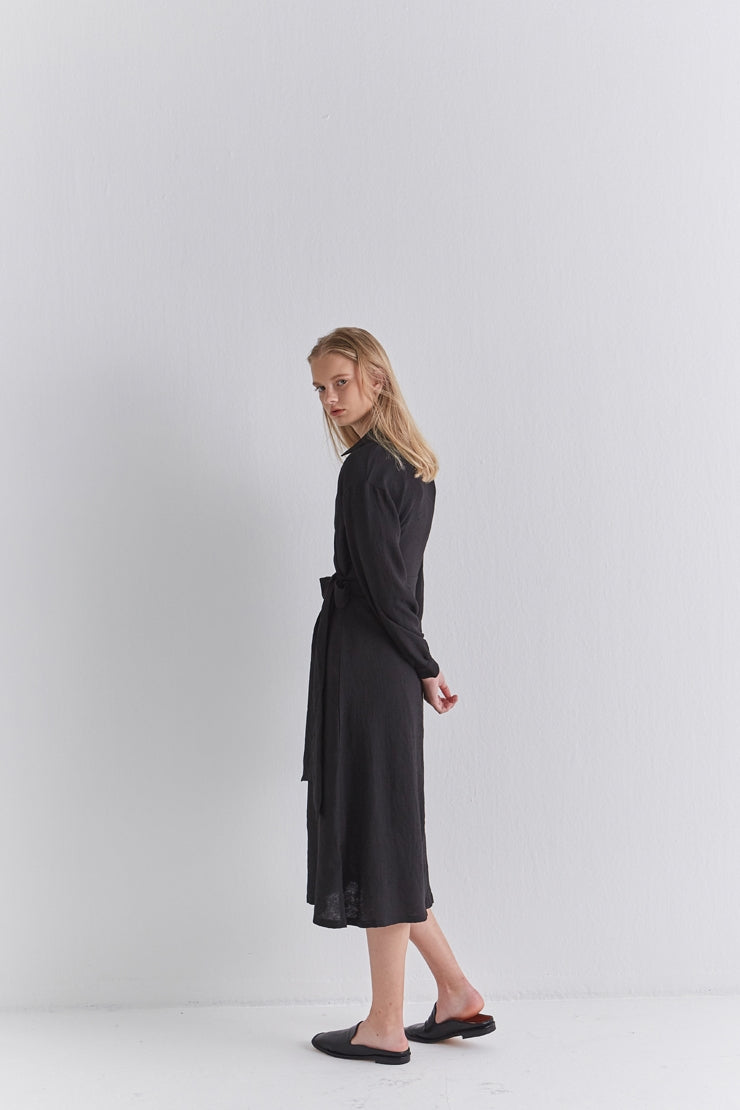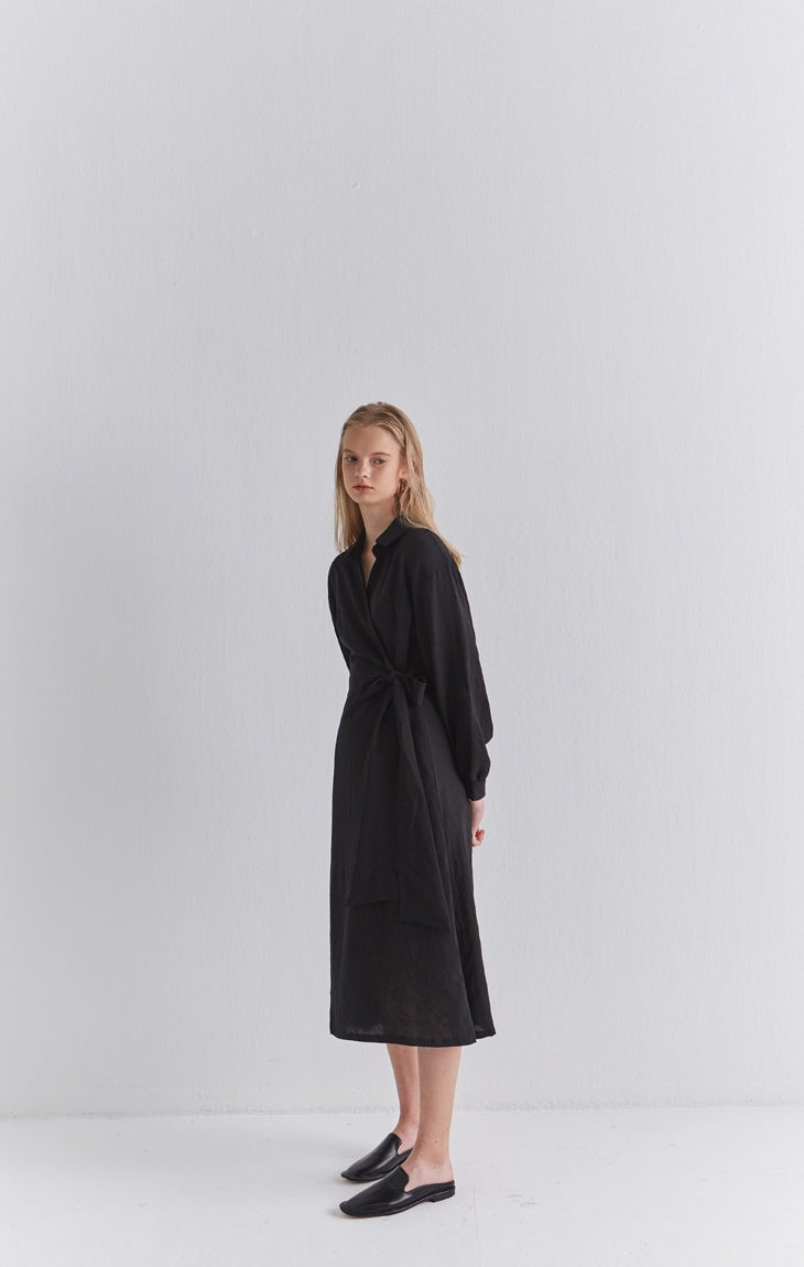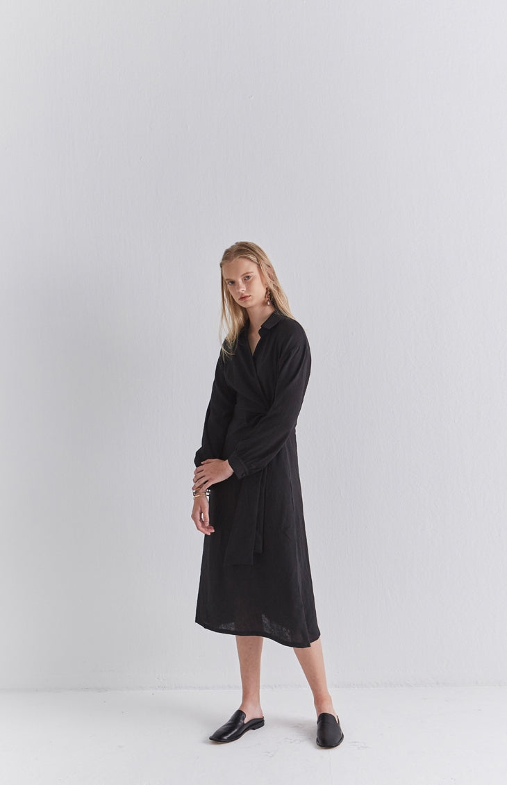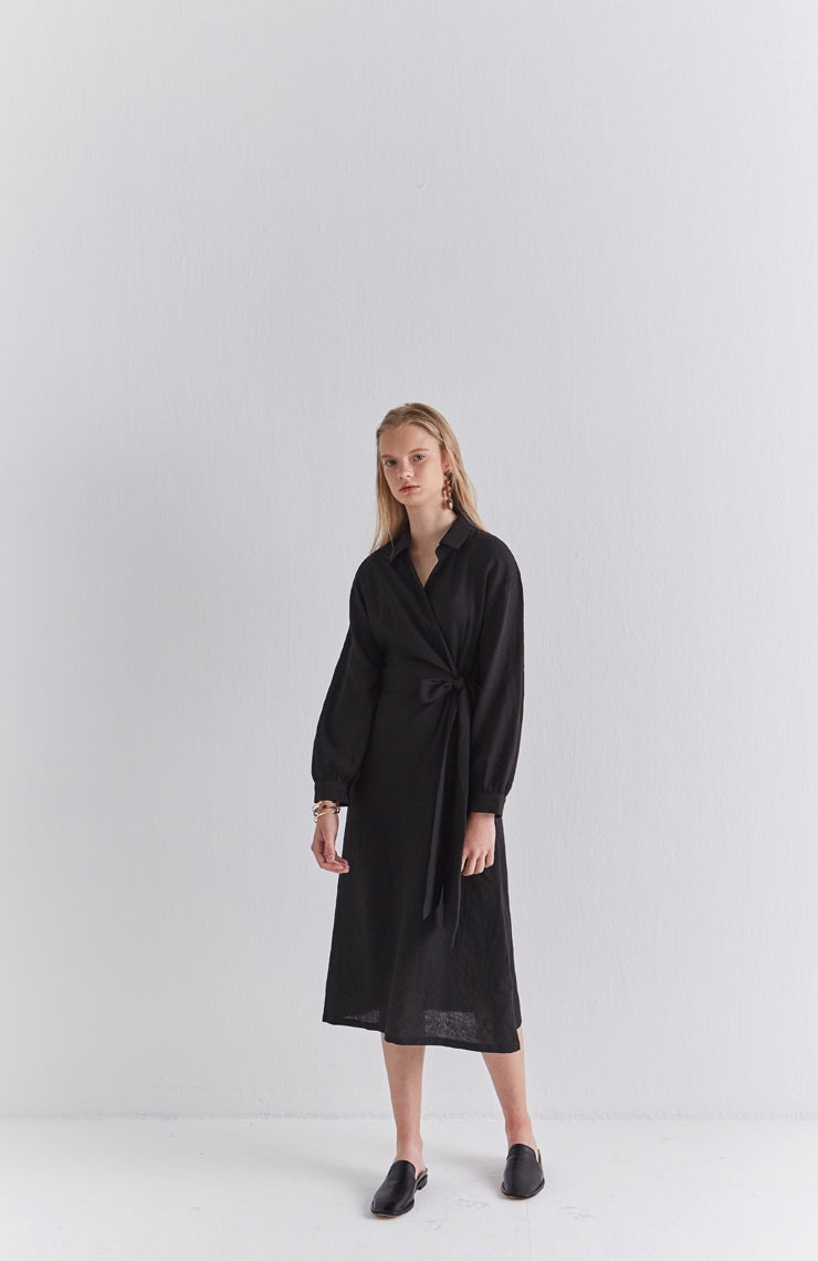 Sleek and softly structured, this black linen wrap midi dress by Laura Ren brings contemporary minimalism to timeless tailoring. Designed in breathable, natural linen, it features a collared neckline, long cuffed sleeves, and a wrap-style front that secures with an elegant side tie. The midi length creates a fluid, elongating silhouette, while the lightweight fabric ensures comfort throughout the day. This dress transitions effortlessly from workwear to refined evening settings. A modern classic from Laura Ren, it blends polish and ease with quiet confidence for the style-conscious woman.