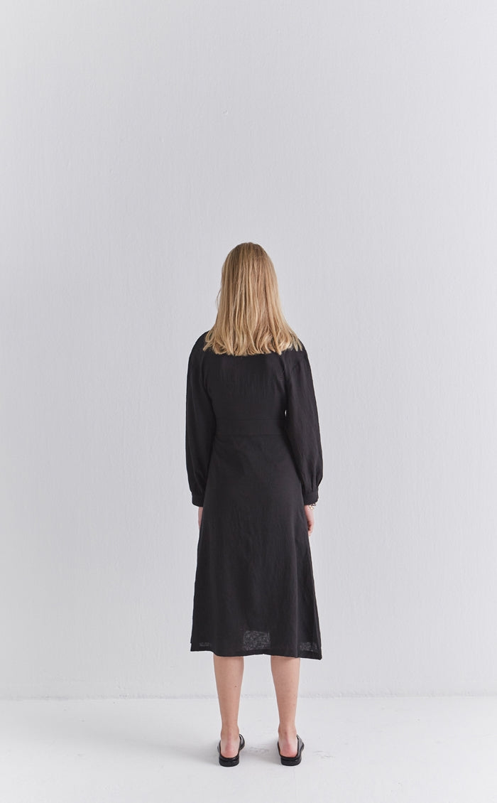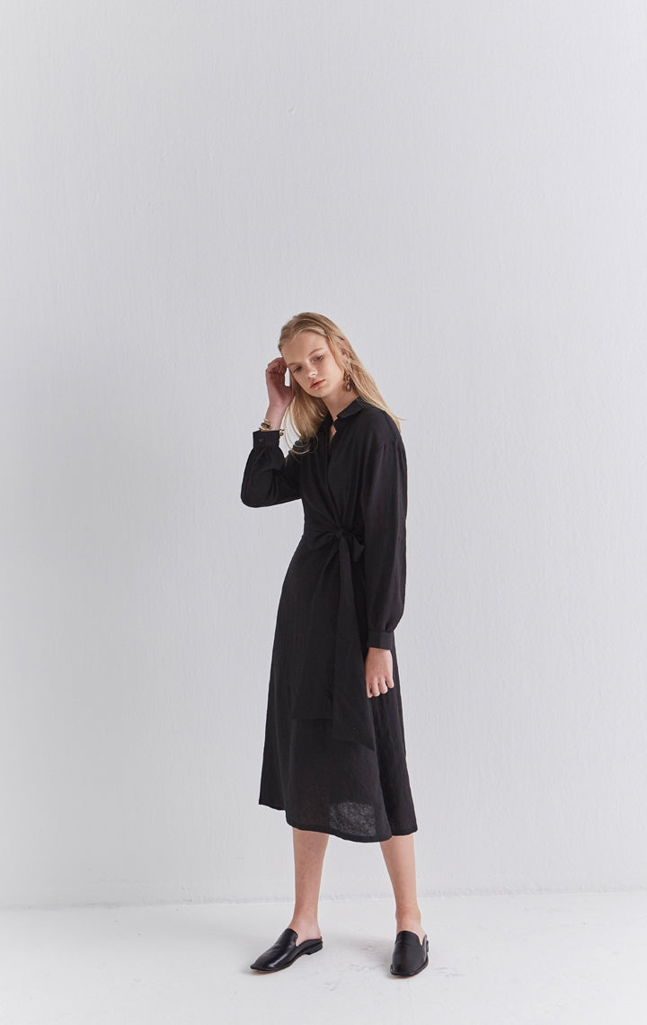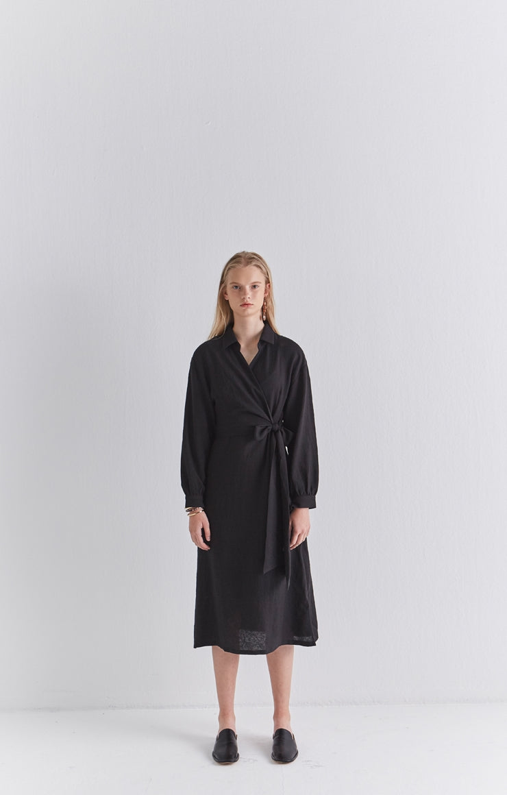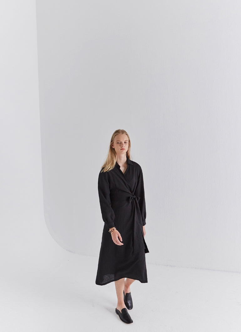 Sleek and softly structured, this black linen wrap midi dress by Laura Ren brings contemporary minimalism to timeless tailoring. Designed in breathable, natural linen, it features a collared neckline, long cuffed sleeves, and a wrap-style front that secures with an elegant side tie. The midi length creates a fluid, elongating silhouette, while the lightweight fabric ensures comfort throughout the day. This dress transitions effortlessly from workwear to refined evening settings. A modern classic from Laura Ren, it blends polish and ease with quiet confidence for the style-conscious woman.