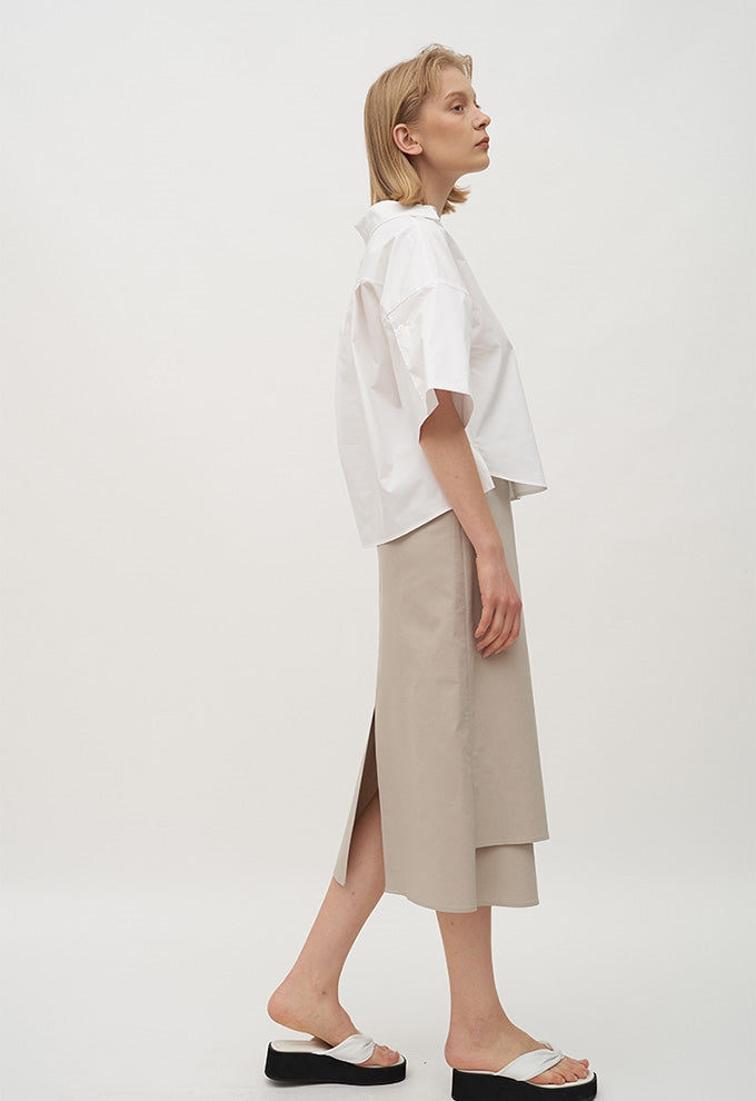 Crafted from premium lightweight linen, this short-sleeve blouse by Laura Ren brings together structured ease and breathable elegance. Designed with a flattering boxy silhouette, it features a crisp spread collar and a clean button-down front for effortless styling. The wide cuffed sleeves and subtle dropped shoulders add architectural interest, making it perfect for both minimalist and refined looks. Whether paired with a skirt or tailored trousers, this blouse offers a relaxed yet polished finish—ideal for warm-weather dressing. Versatile and timeless, it’s a staple piece for any modern wardrobe seeking comfort and quiet luxury in natural linen.