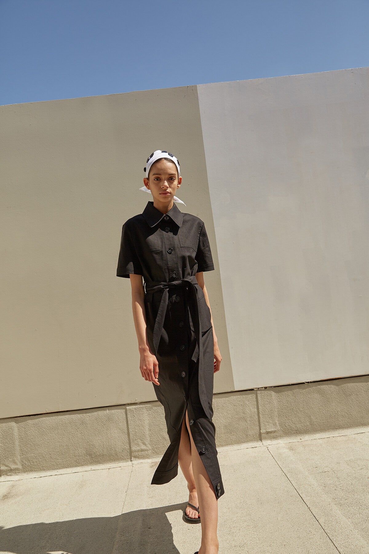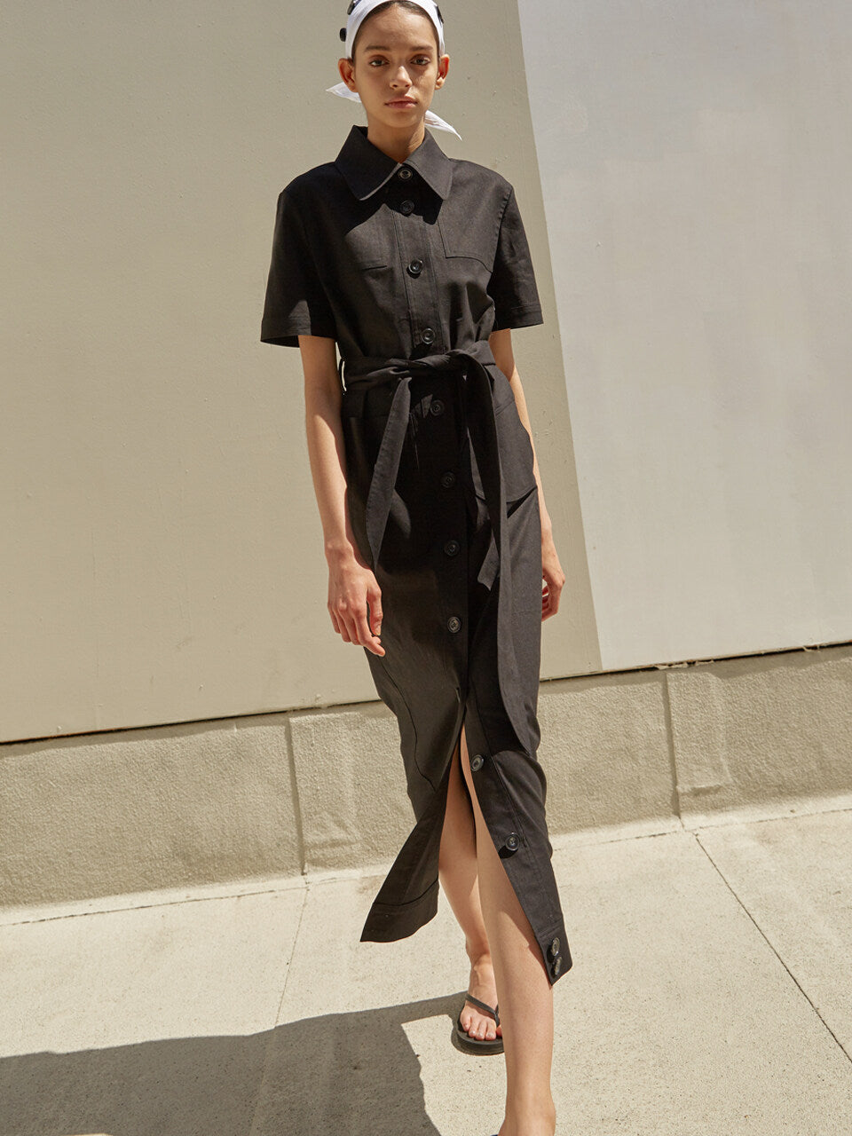 This tailored button-down linen midi dress by Laura Ren is a refined take on utilitarian-inspired design. Crafted from breathable high-quality linen, the dress features a structured shirt collar, short sleeves, and a belted waist for a defined silhouette. Front buttons add functionality and ease, while the midi length and front slit offer fluid movement and modern edge. Ideal for daytime elegance or casual sophistication, this dress transitions seamlessly from city streets to summer escapes. Pair it with sandals or flats for an effortlessly polished look with lasting comfort.