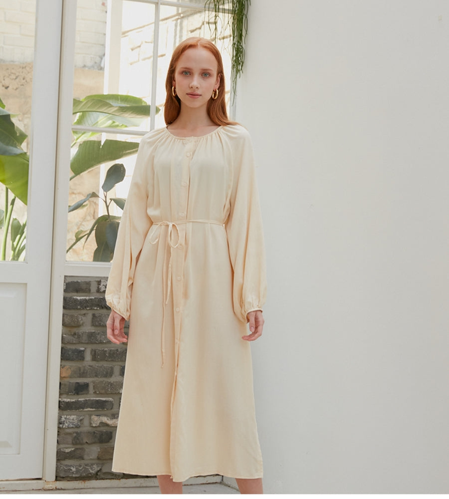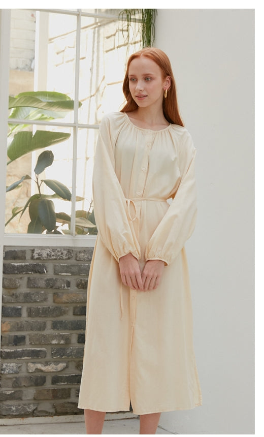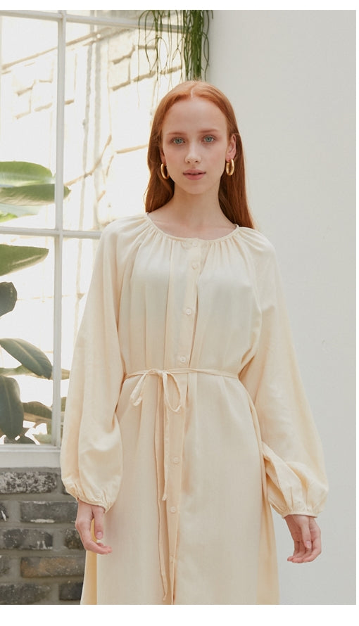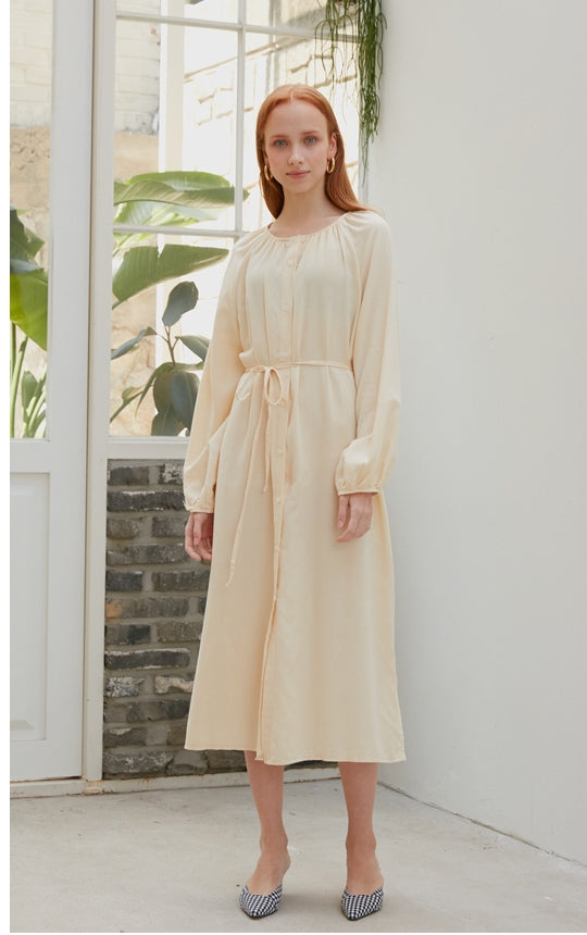 Refined and versatile, this long sleeve midi dress by Laura Ren is crafted from a soft viscose blend that drapes beautifully for a sophisticated silhouette. Featuring a button-front design and adjustable drawstring waist, it offers both structure and comfort with understated elegance. The gathered neckline and voluminous sleeves add a romantic touch, making it ideal for daytime elegance or relaxed evening outings. Designed for modern women seeking graceful ease, this dress is perfect for brunches, art galleries, or a polished casual look. Pair with heels or flats for effortless seasonal transitions.