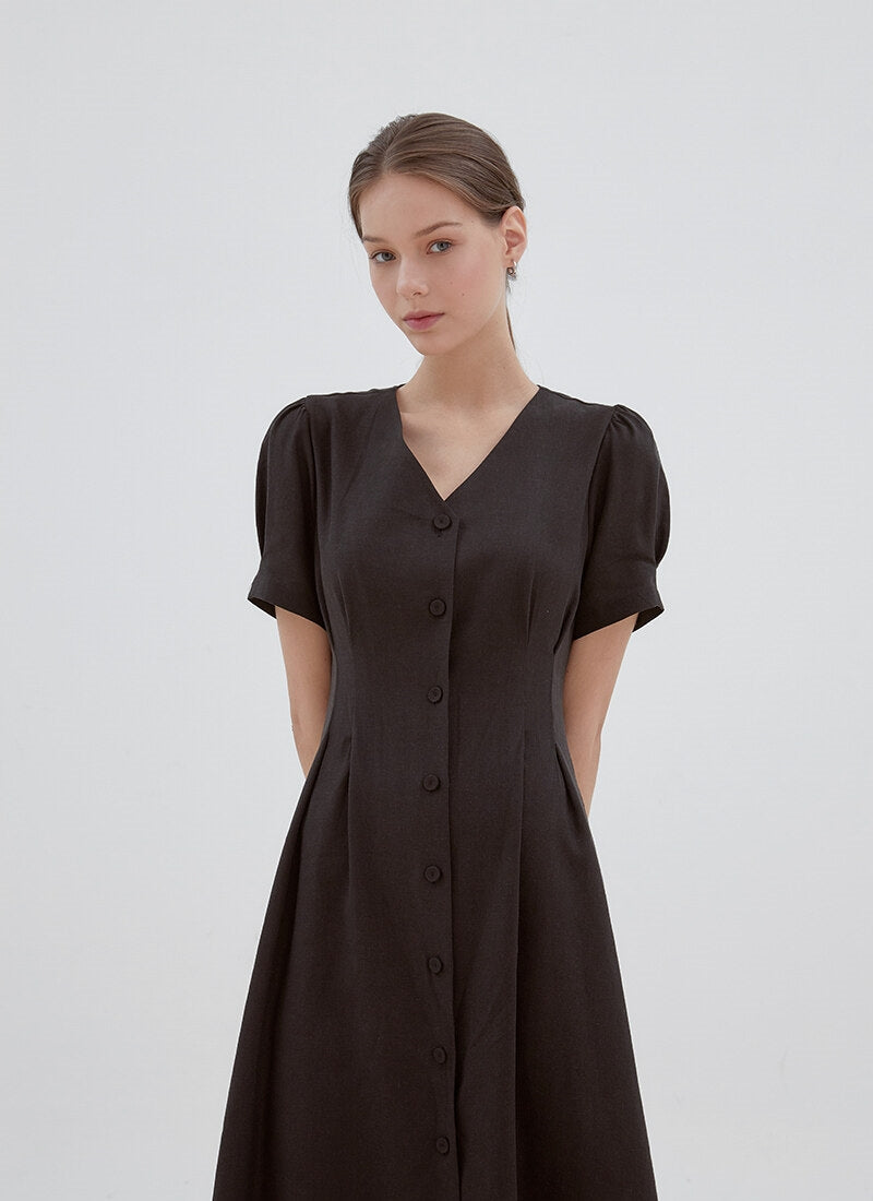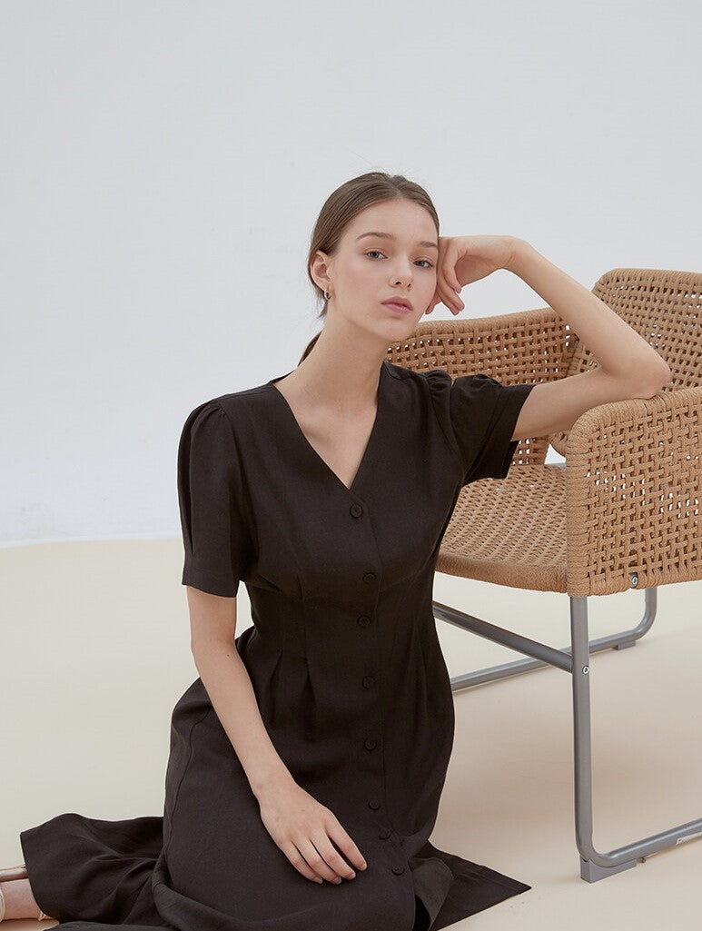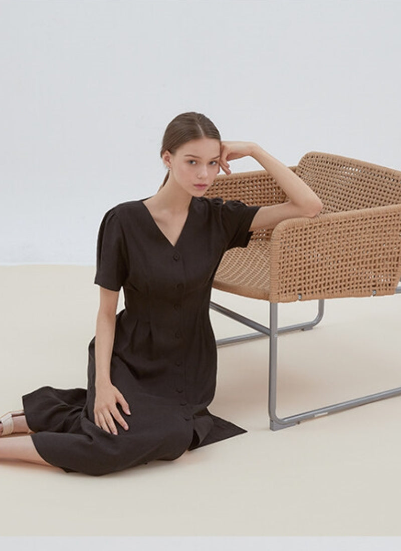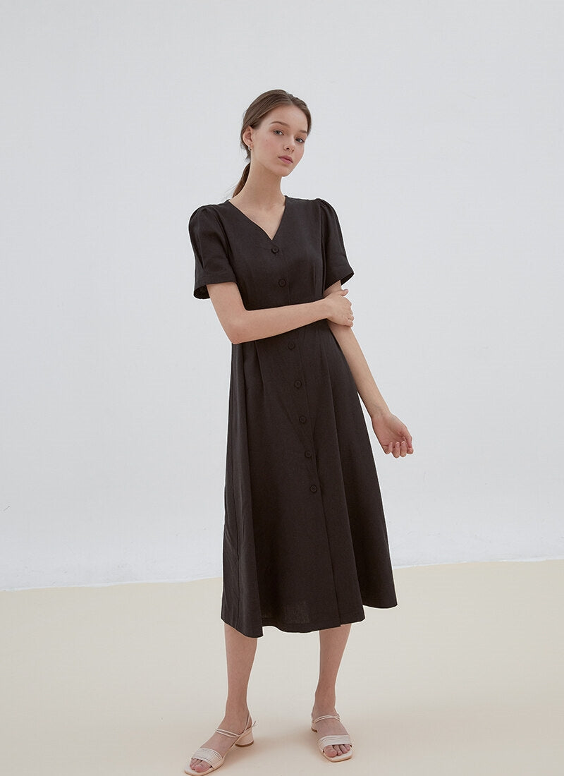 Crafted from premium breathable linen, this midi dress by Laura Ren blends timeless elegance with everyday comfort. Featuring a graceful V-neckline, structured bodice, and softly gathered short sleeves, it enhances a refined silhouette while offering ease of movement. The button-down front and A-line shape add classic charm, making it a versatile addition to any capsule wardrobe. Ideal for brunches, office days, or evening strolls, this piece exudes quiet luxury and modern minimalism. Laura Ren’s attention to tailoring and fabric quality makes this a wardrobe staple for the discerning woman.