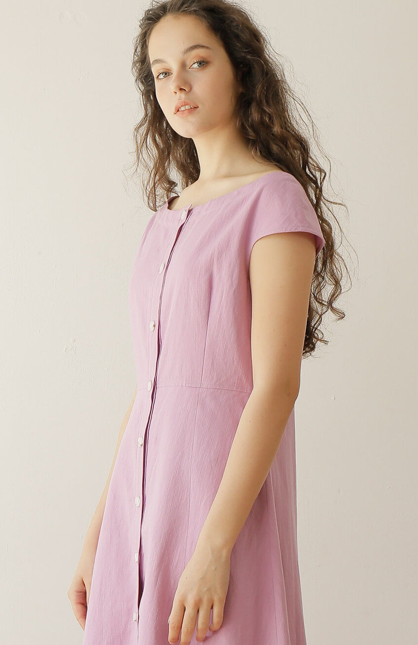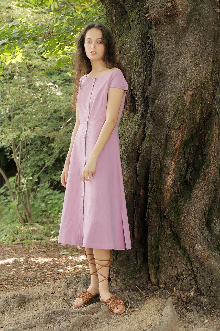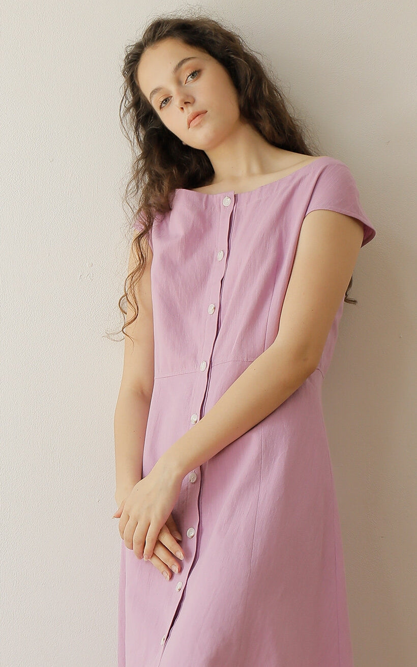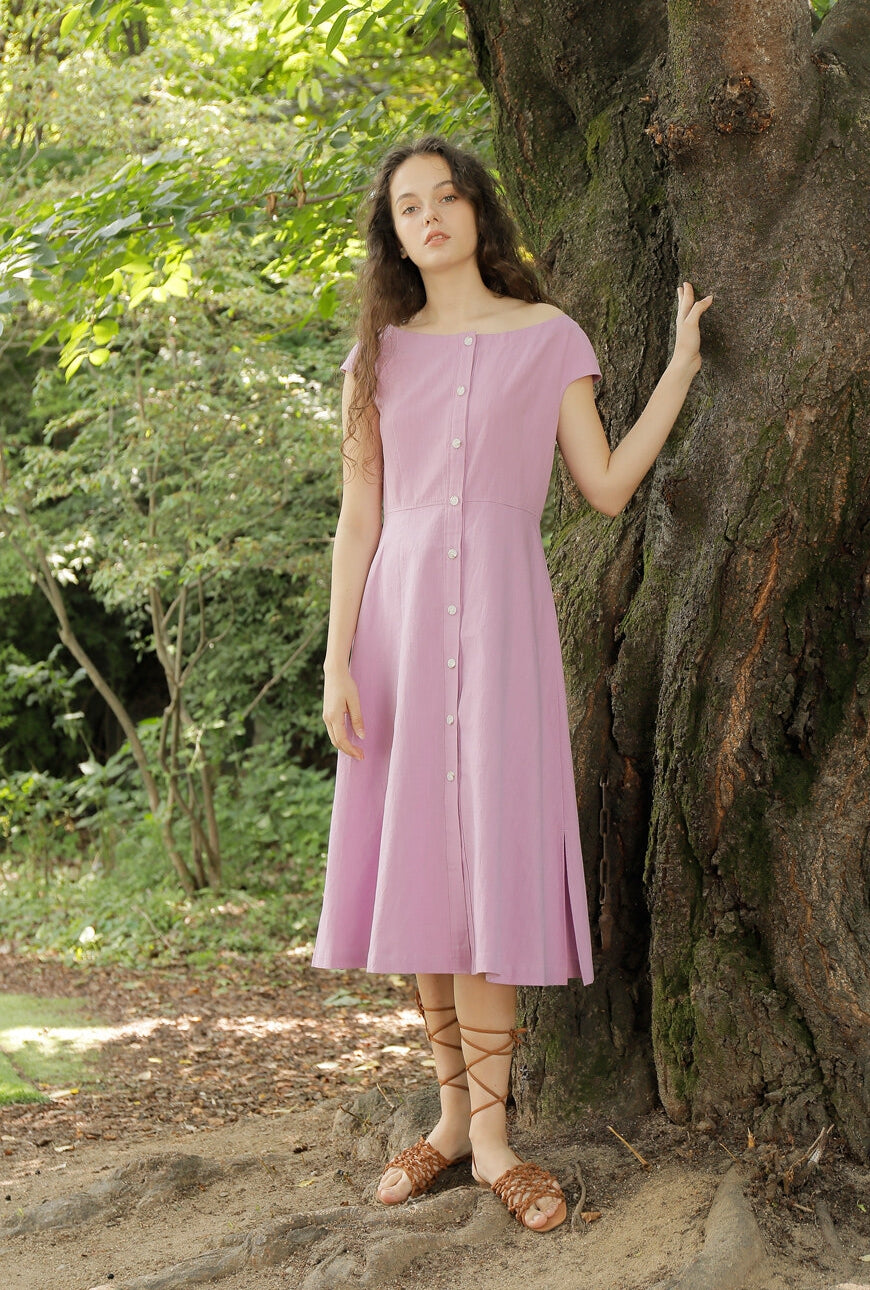 Refined and feminine, this lavender linen midi dress from Laura Ren combines soft structure with timeless elegance. Designed with a wide boat neckline and delicate cap sleeves, the dress enhances the shoulders and neckline beautifully. The button-front closure adds charm while elongating the silhouette, and the natural linen fabric ensures breathable comfort throughout the day. Its tailored waist and gently flared hem offer a flattering, feminine shape perfect for garden parties, summer evenings, or resort wear. Embrace effortless sophistication with this standout piece from Laura Ren’s linen collection.