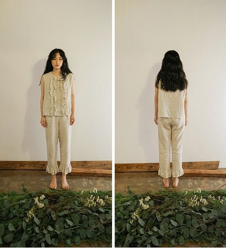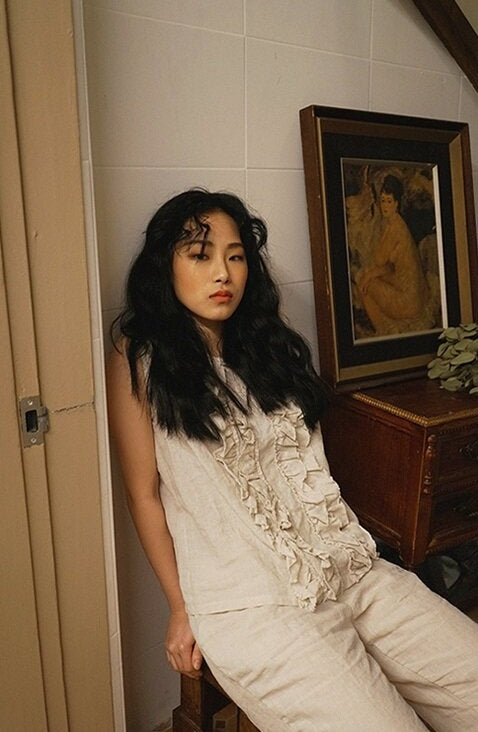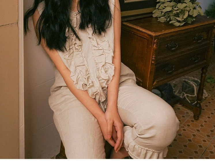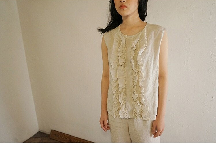 Introducing the Carla Linen Cotton Ruffle Sleeveless Top. Embodying a sophisticated elegance, this top features delicate ruffle details and a luxurious blend of linen and cotton. Elevate your wardrobe with this exclusive piece that exudes luxury and refinement.