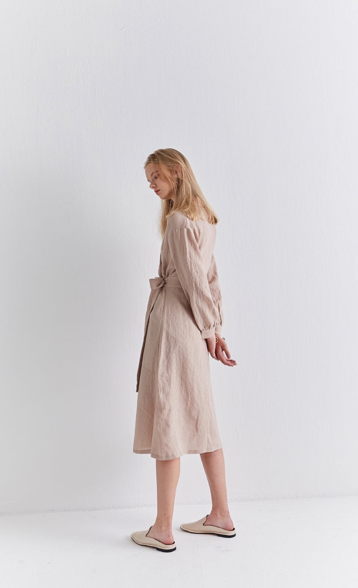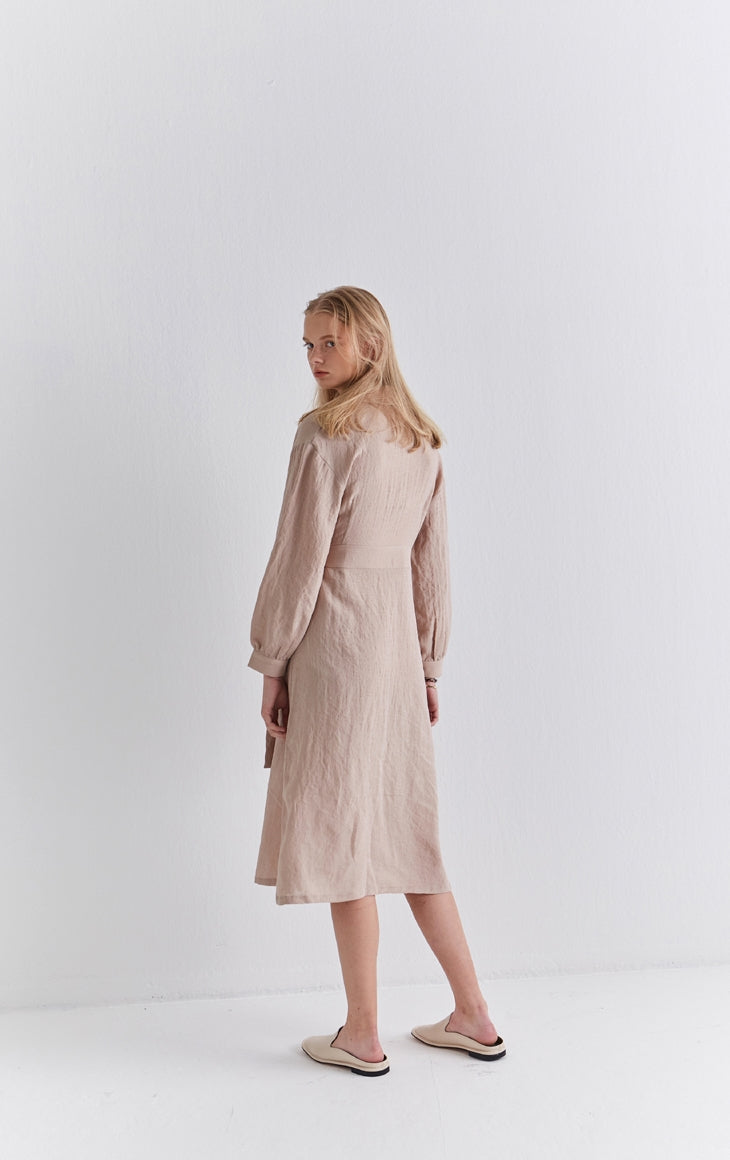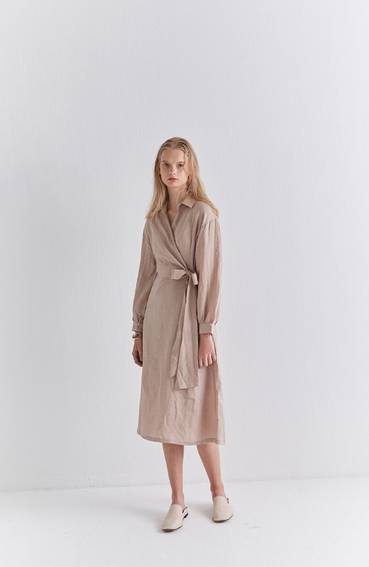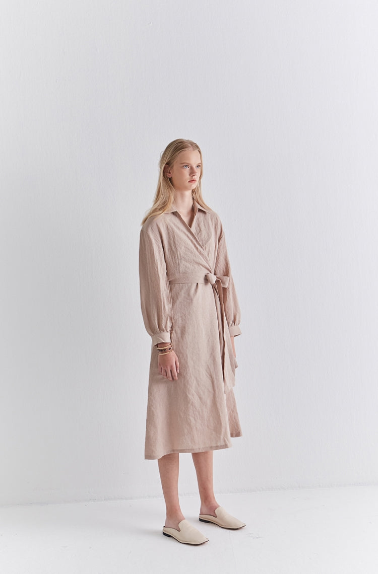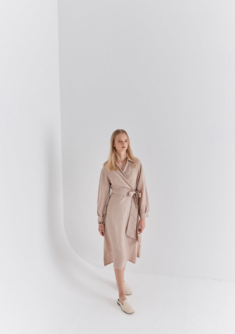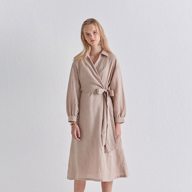 Elevate your wardrobe with the refined charm of this wrap-style linen midi dress by Laura Ren. Crafted from premium breathable linen, this dress combines timeless elegance with everyday ease. The tailored fit features a flattering wrap front, cinched with a long waist tie for adjustable definition, while the voluminous long sleeves add structure and poise. Subtle button cuffs and a flowing midi-length hemline offer versatility for both daywear and evening occasions. Whether paired with flats or boots, this linen dress is a must-have staple that merges sophistication with sustainability.