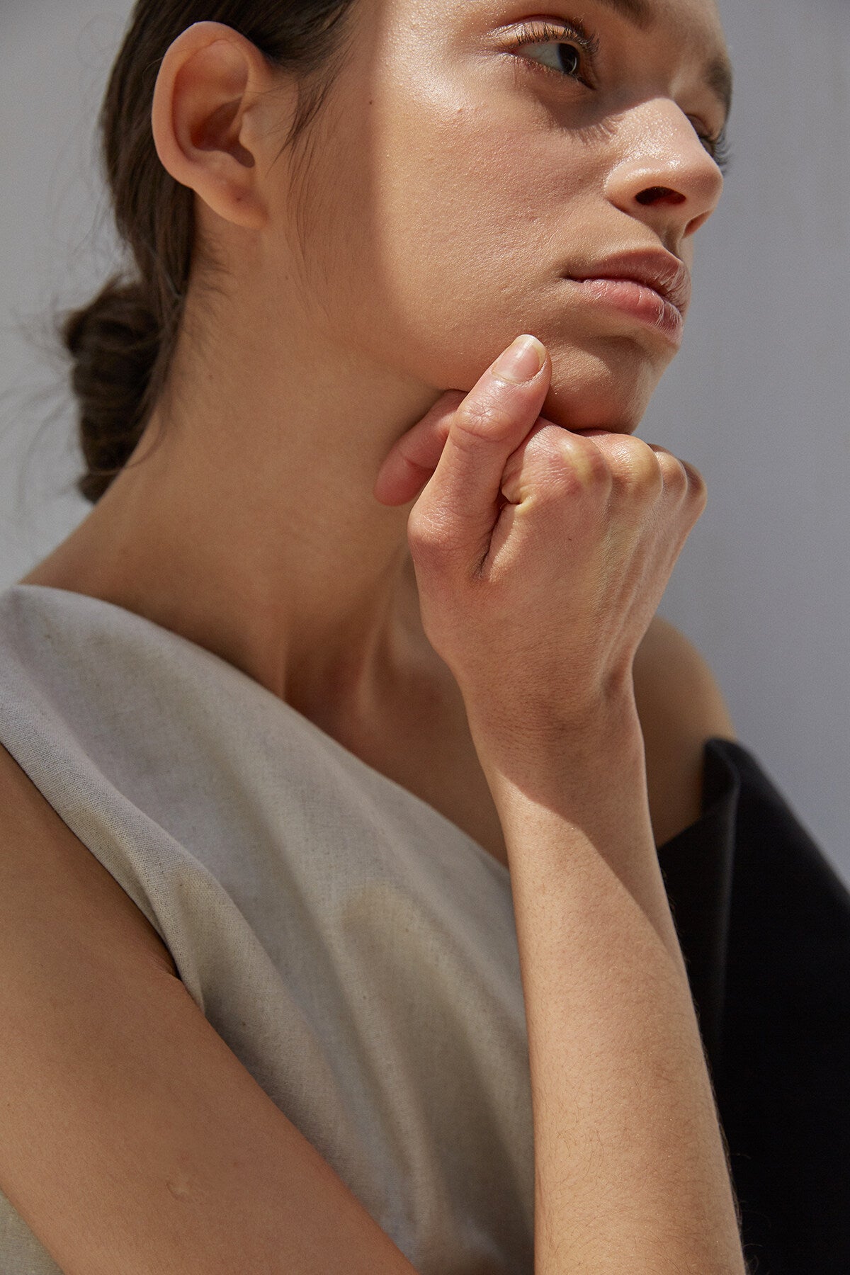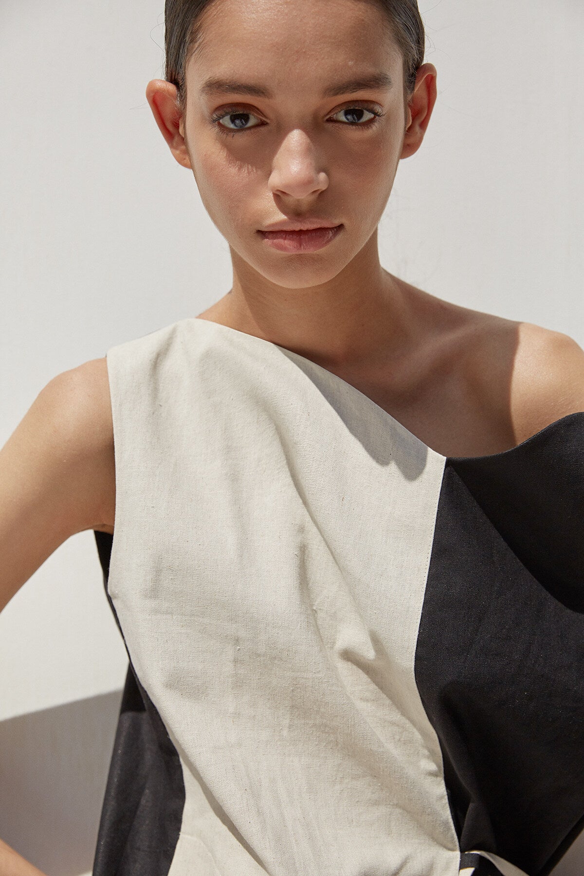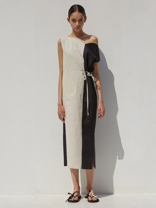 This striking asymmetrical linen midi dress by Laura Ren features bold contrast paneling for a contemporary take on minimalism. Made from premium breathable linen, the dress combines a sculptural off-shoulder neckline with a sleek color-block design in neutral tones. A waist tie gently defines the silhouette, while a side slit adds movement and ease. The back reveals a clean, uninterrupted flow of fabric, enhancing the dress's elegant lines. Ideal for warm-weather dressing, artful evenings, or standout resort styling, this piece offers refined simplicity with modern edge.