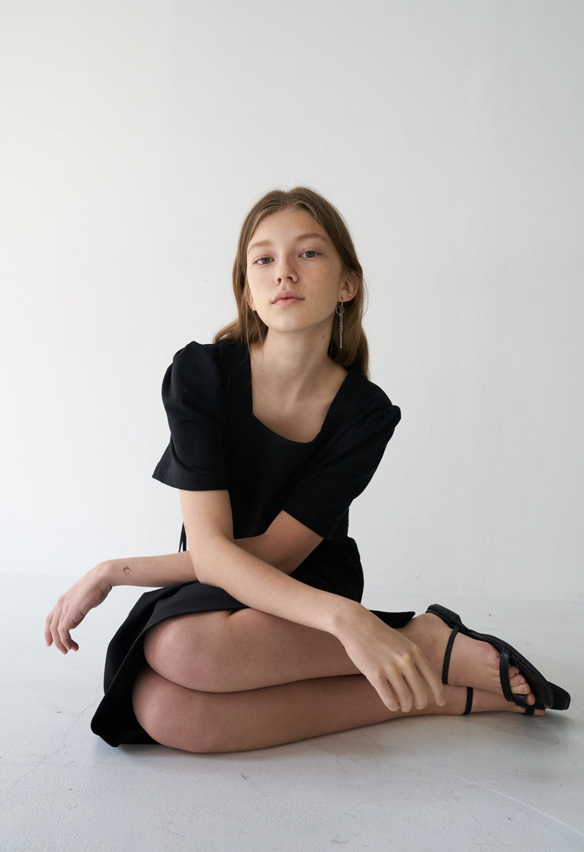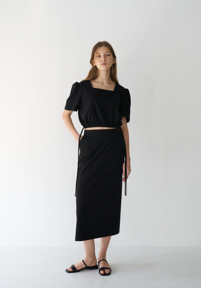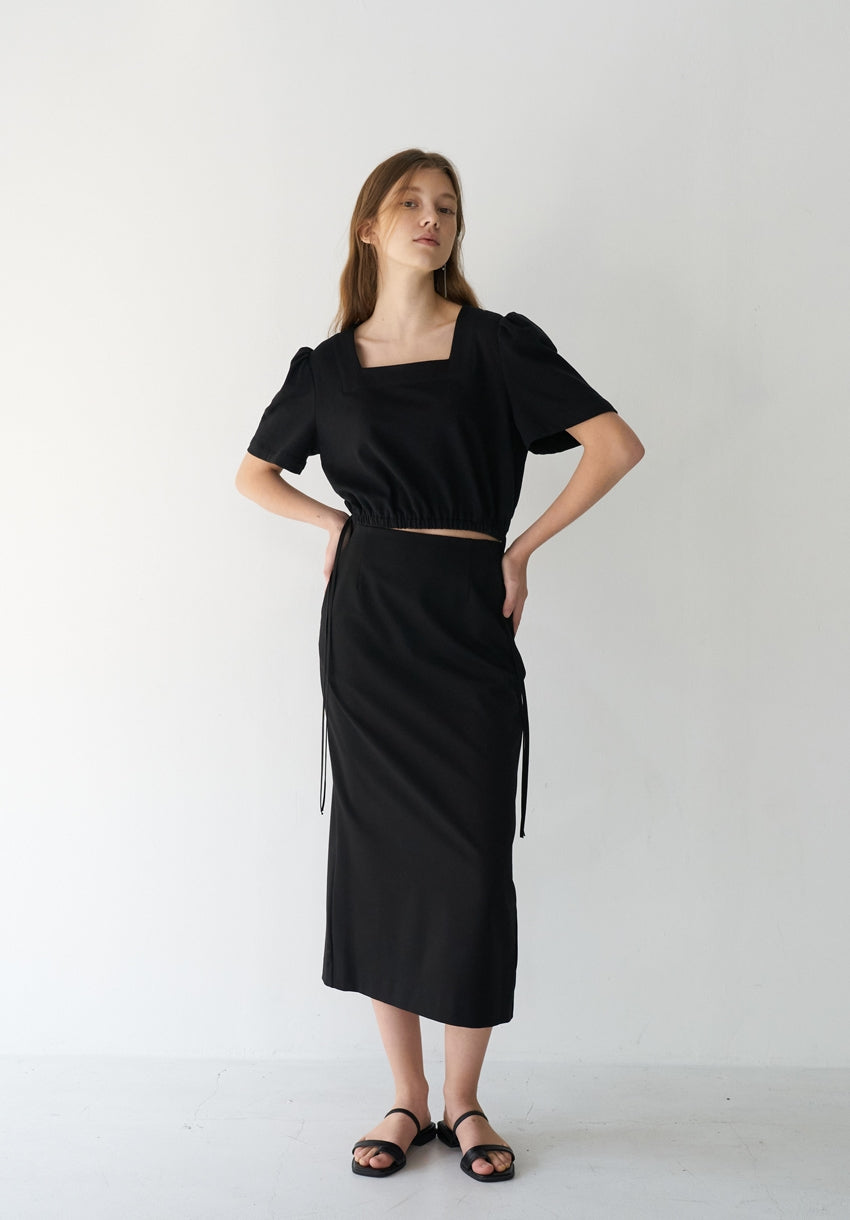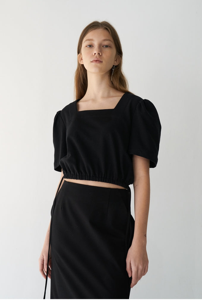 Elevate your minimalist wardrobe with this cropped linen blouse from Laura Ren, crafted to deliver structure and softness in one. Designed with a square neckline, elastic hem, and subtle puff sleeves, this top brings a refined yet contemporary silhouette. Adjustable side ties add an element of detail while allowing for a personalized fit. The breathable linen fabric makes it perfect for warm weather, while the clean black hue ensures effortless styling. Whether paired with high-waisted skirts or trousers, it’s a standout staple for refined day-to-evening dressing.