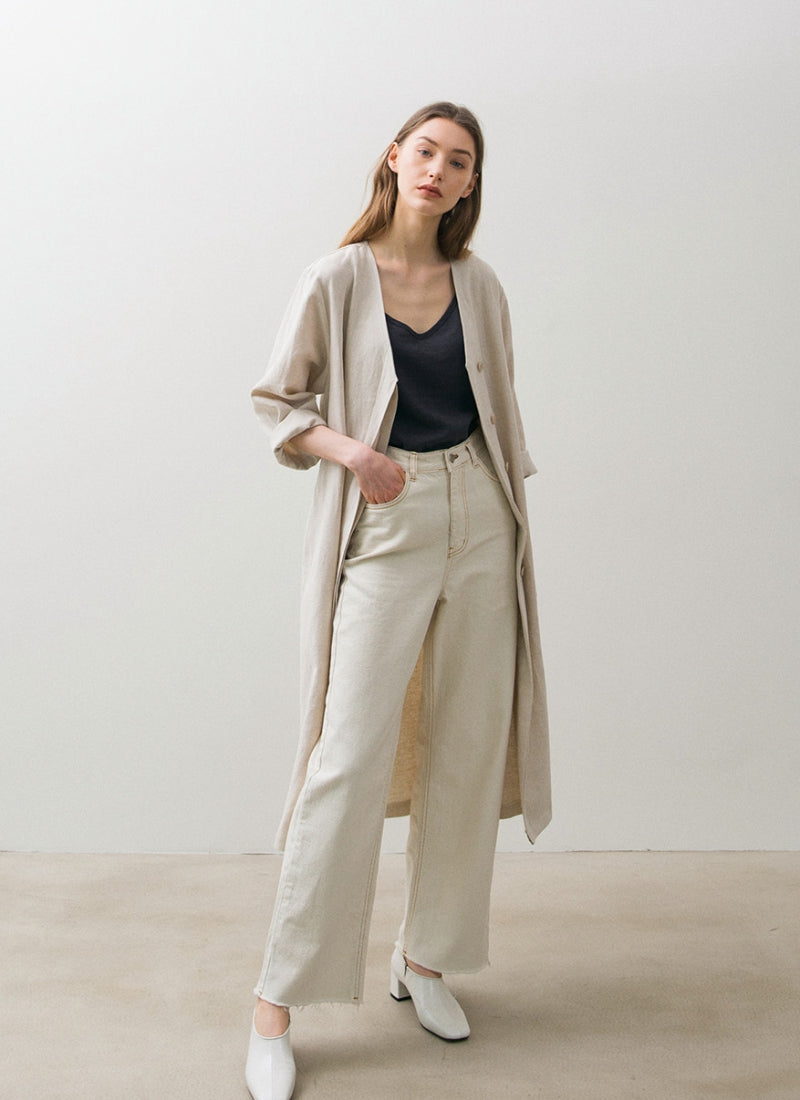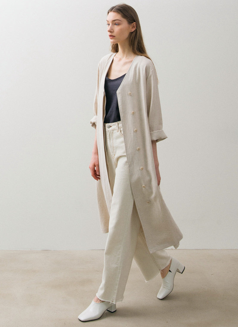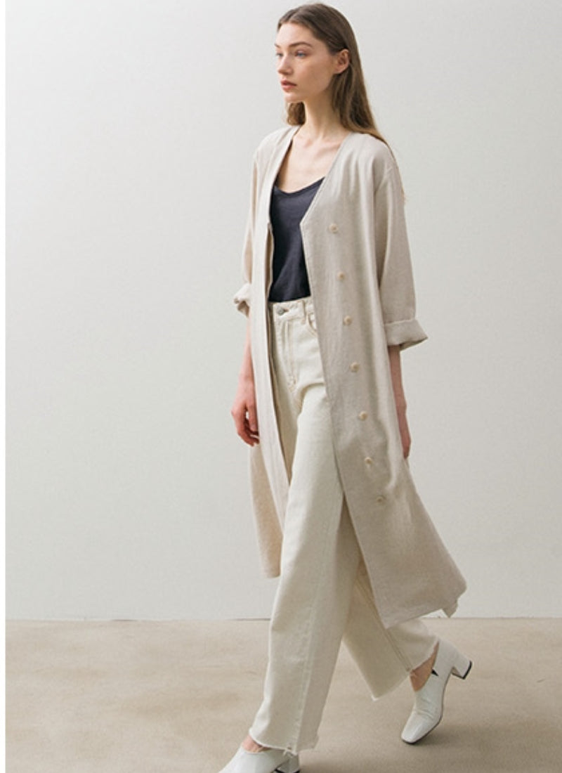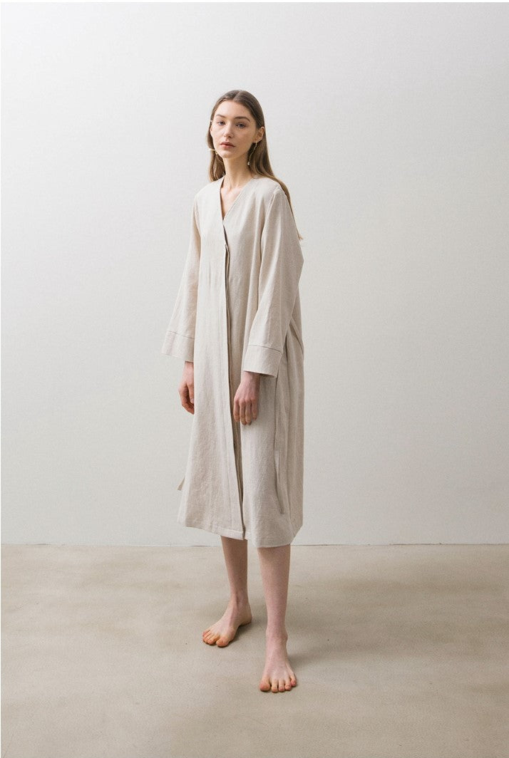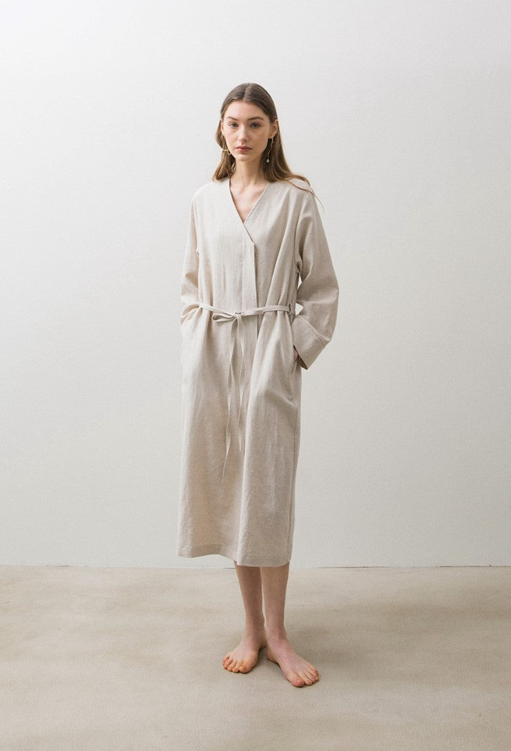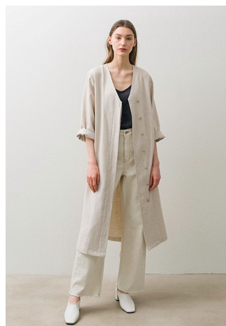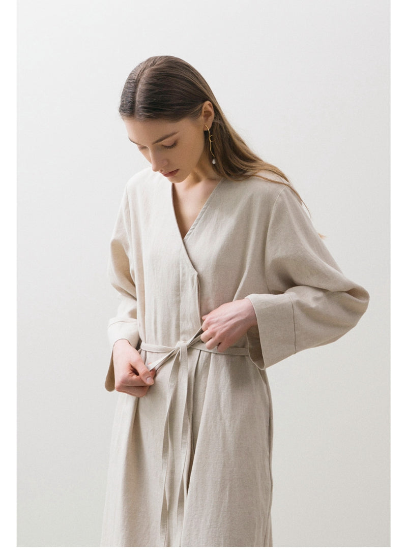 Elevate your seasonal wardrobe with this double-breasted linen coat dress from Laura Ren. Crafted from breathable and natural linen, this piece offers both structure and softness, making it ideal for layering or wearing solo. Featuring a clean V-neckline, soft tailoring through the body, and a flattering waist tie, it delivers effortless sophistication with practical side pockets. Whether styled open as a lightweight coat or cinched as a dress, this design embodies modern minimalism and versatility. Perfect for transitional weather, this linen piece is an essential for refined, everyday elegance.