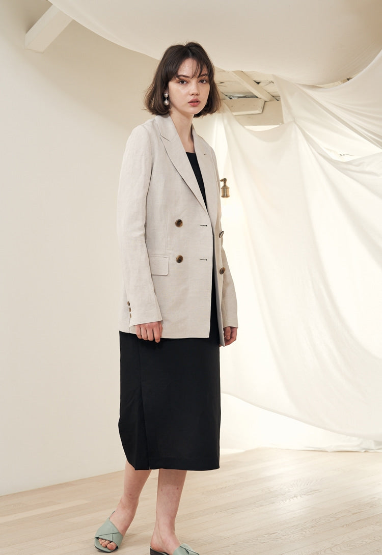 Elevate your wardrobe with this double-breasted linen blazer from Laura Ren, designed for the modern woman who values both polish and comfort. Crafted from breathable, high-quality linen, this blazer features structured shoulders, a sharp notch lapel, and statement tortoiseshell buttons. The tailored silhouette delivers a clean, elongated line perfect for layering over dresses, trousers, or skirts. Lightweight yet refined, it offers timeless versatility for both professional and elevated casual looks. Ideal for spring and summer, this piece defines effortless sophistication and natural elegance.