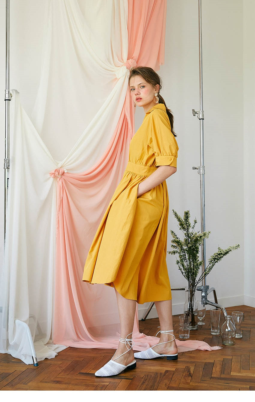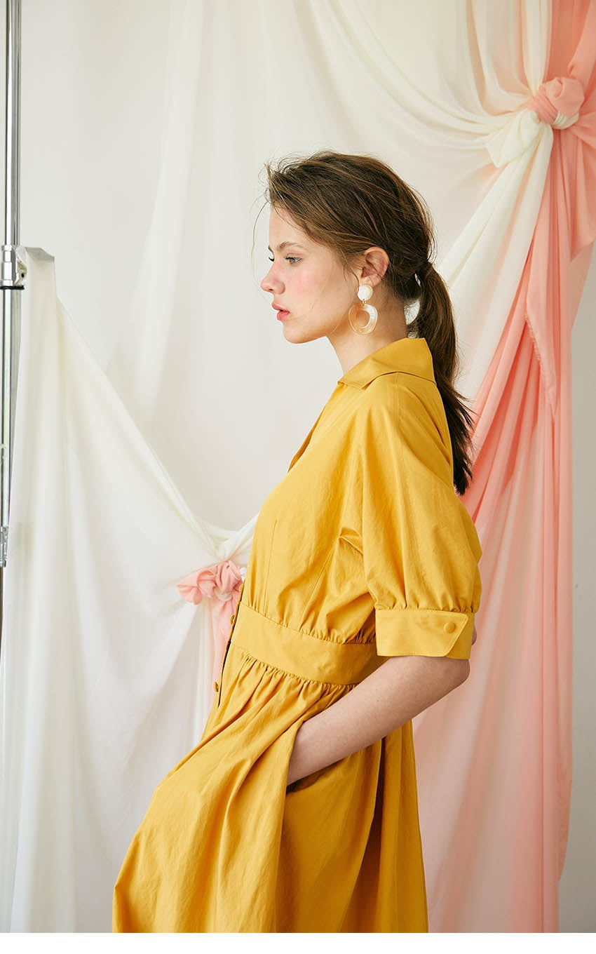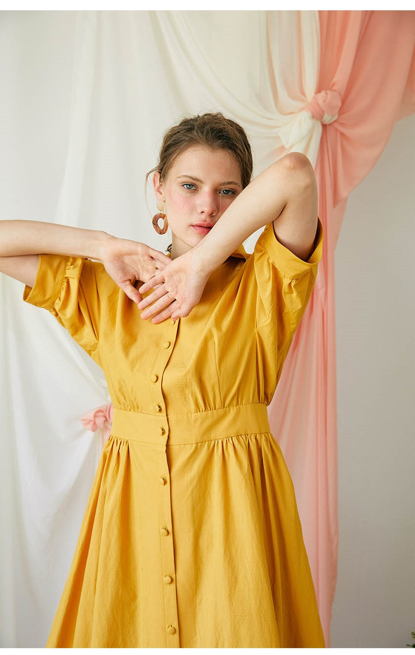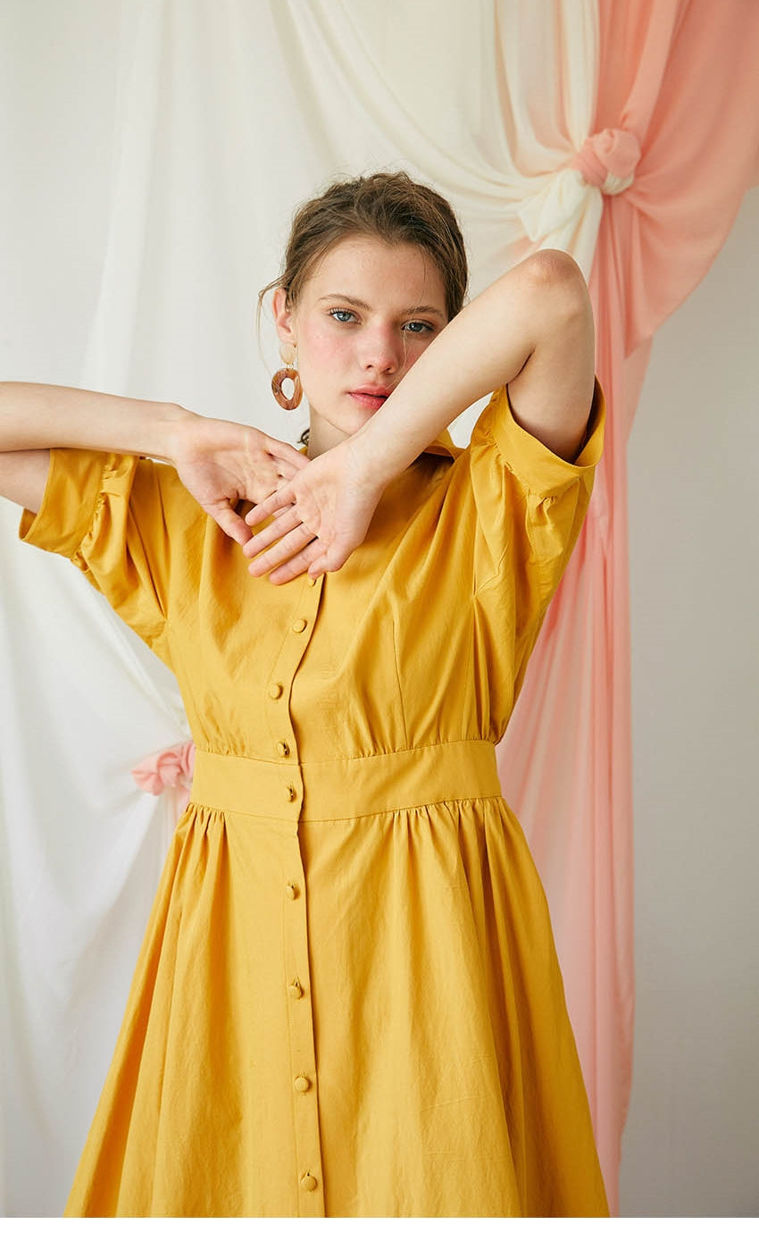 - Crafted from breathable, high-quality linen for all-day comfort - Feminine A-line silhouette with gently gathered skirt for elegant movement - Cuffed half sleeves and structured waistband for a tailored finish - Button-down front design adds classic charm and versatile styling - Ideal midi length perfect for warm-weather sophistication