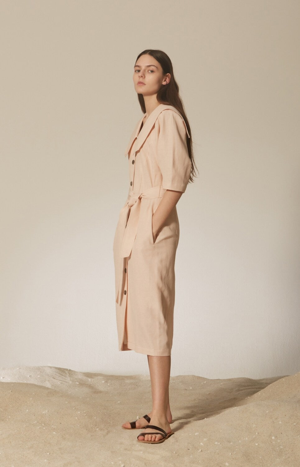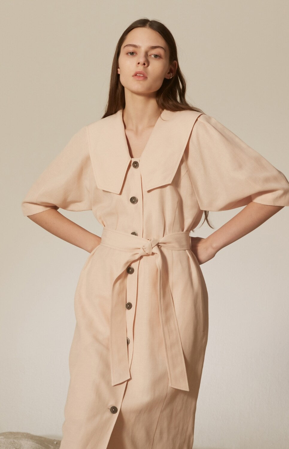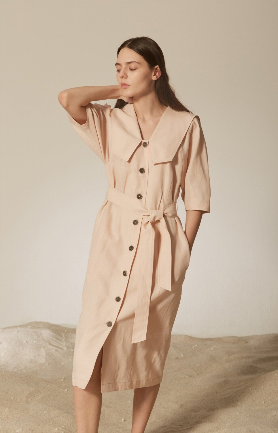 Designed for refined summer dressing, this linen dress by Laura Ren blends classic elegance with modern tailoring. Made from breathable, natural linen fabric, the dress features a flattering midi length, a front button-down closure, and a waist-defining belt for a polished silhouette. The standout oversized sailor-inspired collar adds a distinctive feminine touch, while the side pockets bring a practical element to its sophisticated design. Perfect for garden parties, city strolls, or elevated daytime wear, this Laura Ren linen dress is a timeless wardrobe staple that embodies comfort, versatility, and quiet luxury.