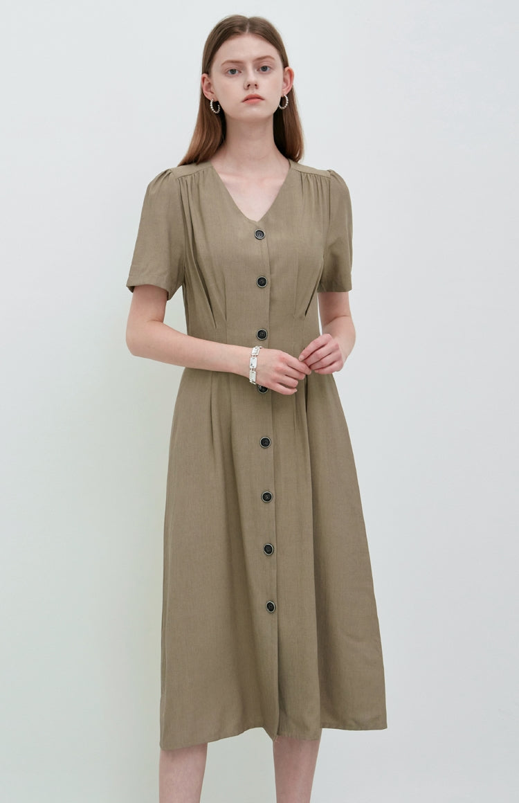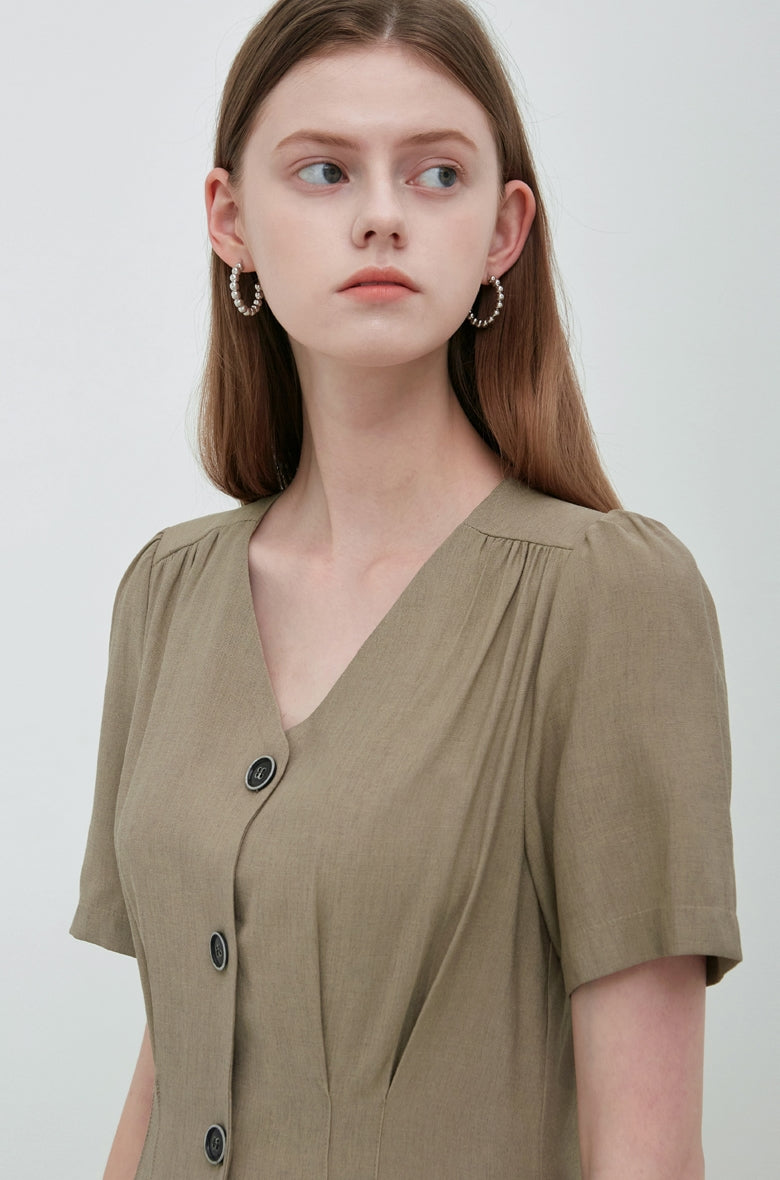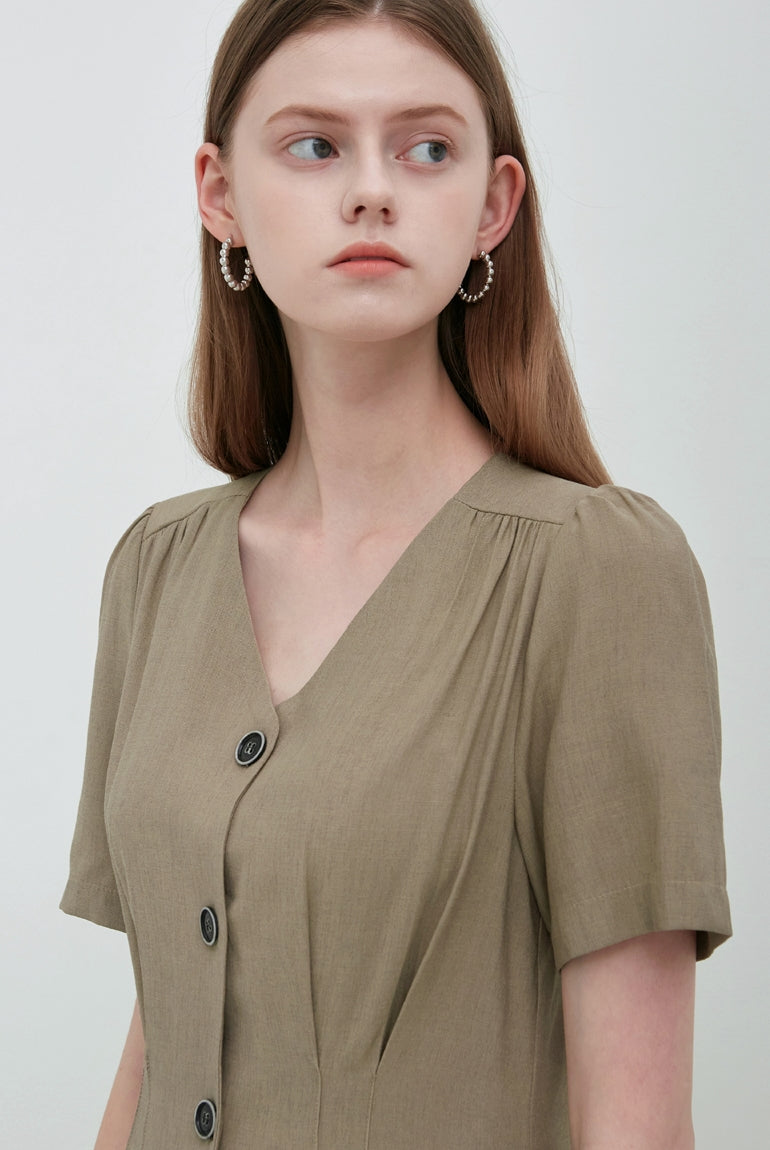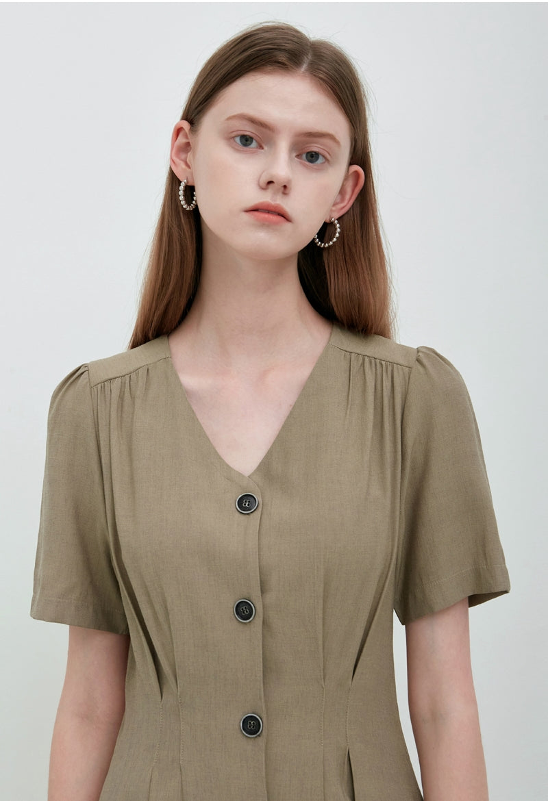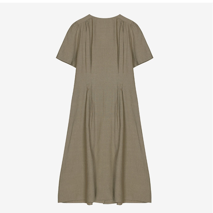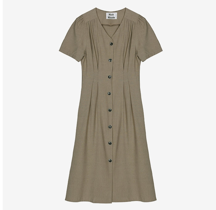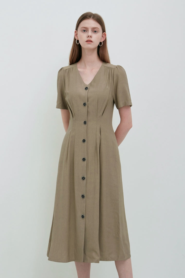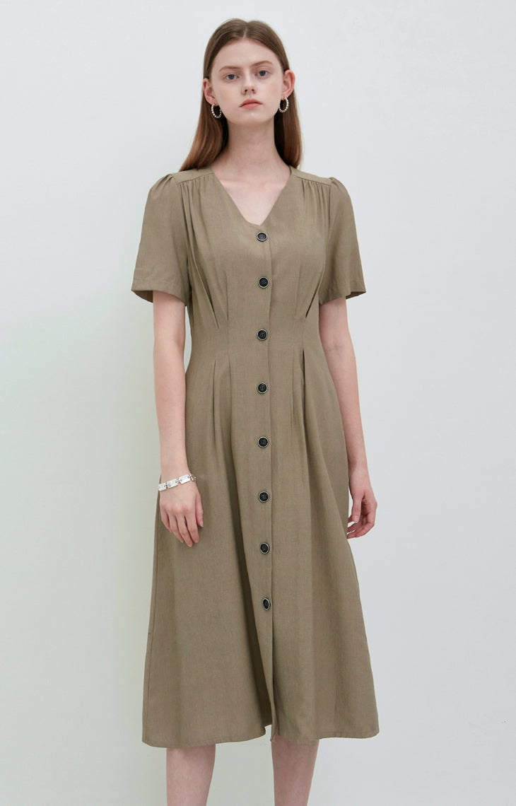 Step into timeless elegance with this beautifully tailored linen midi dress from Laura Ren. Crafted from high-quality breathable linen, this dress features a flattering V-neckline, gently gathered shoulders, and a full button-down front. Vertical seams and subtle pleats enhance the natural shape, offering a sophisticated, feminine silhouette perfect for warm-weather occasions or refined everyday wear. The short sleeves and smooth finish add effortless polish, making this dress ideal for work, travel, or casual evenings. Designed for the discerning woman who values style, comfort, and classic appeal, Laura Ren brings you a versatile staple that transitions seamlessly from day to night.