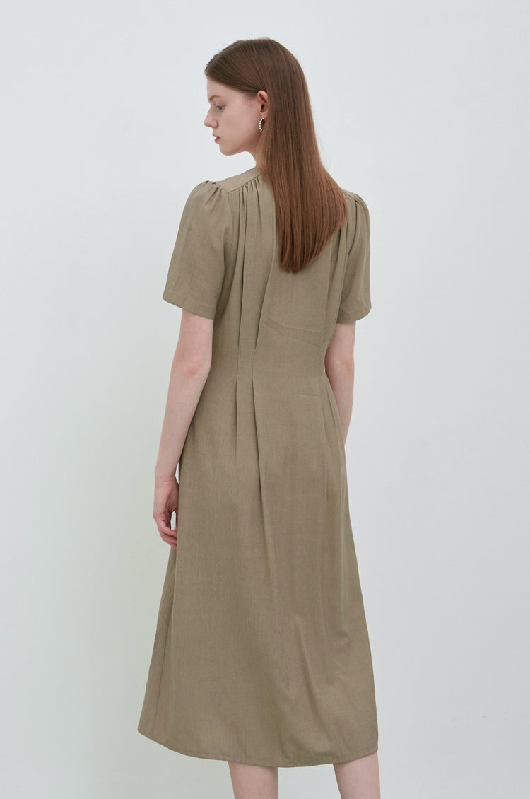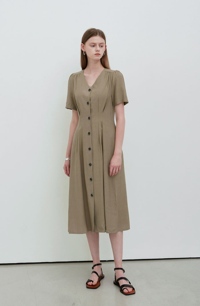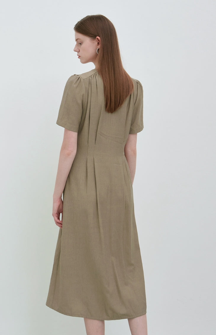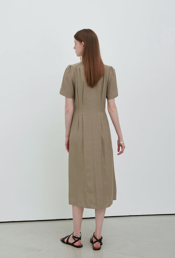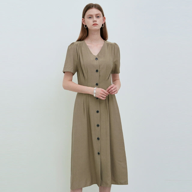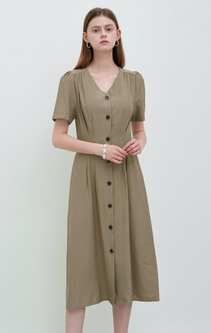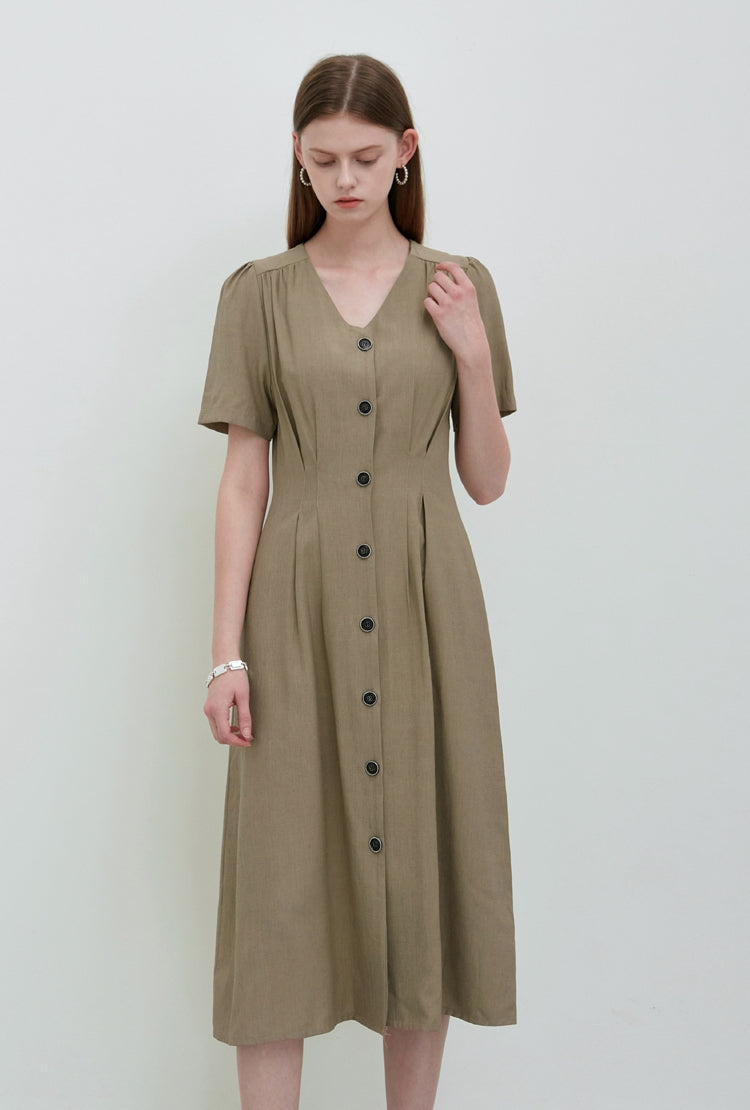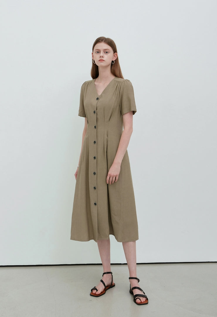 Step into timeless elegance with this beautifully tailored linen midi dress from Laura Ren. Crafted from high-quality breathable linen, this dress features a flattering V-neckline, gently gathered shoulders, and a full button-down front. Vertical seams and subtle pleats enhance the natural shape, offering a sophisticated, feminine silhouette perfect for warm-weather occasions or refined everyday wear. The short sleeves and smooth finish add effortless polish, making this dress ideal for work, travel, or casual evenings. Designed for the discerning woman who values style, comfort, and classic appeal, Laura Ren brings you a versatile staple that transitions seamlessly from day to night.