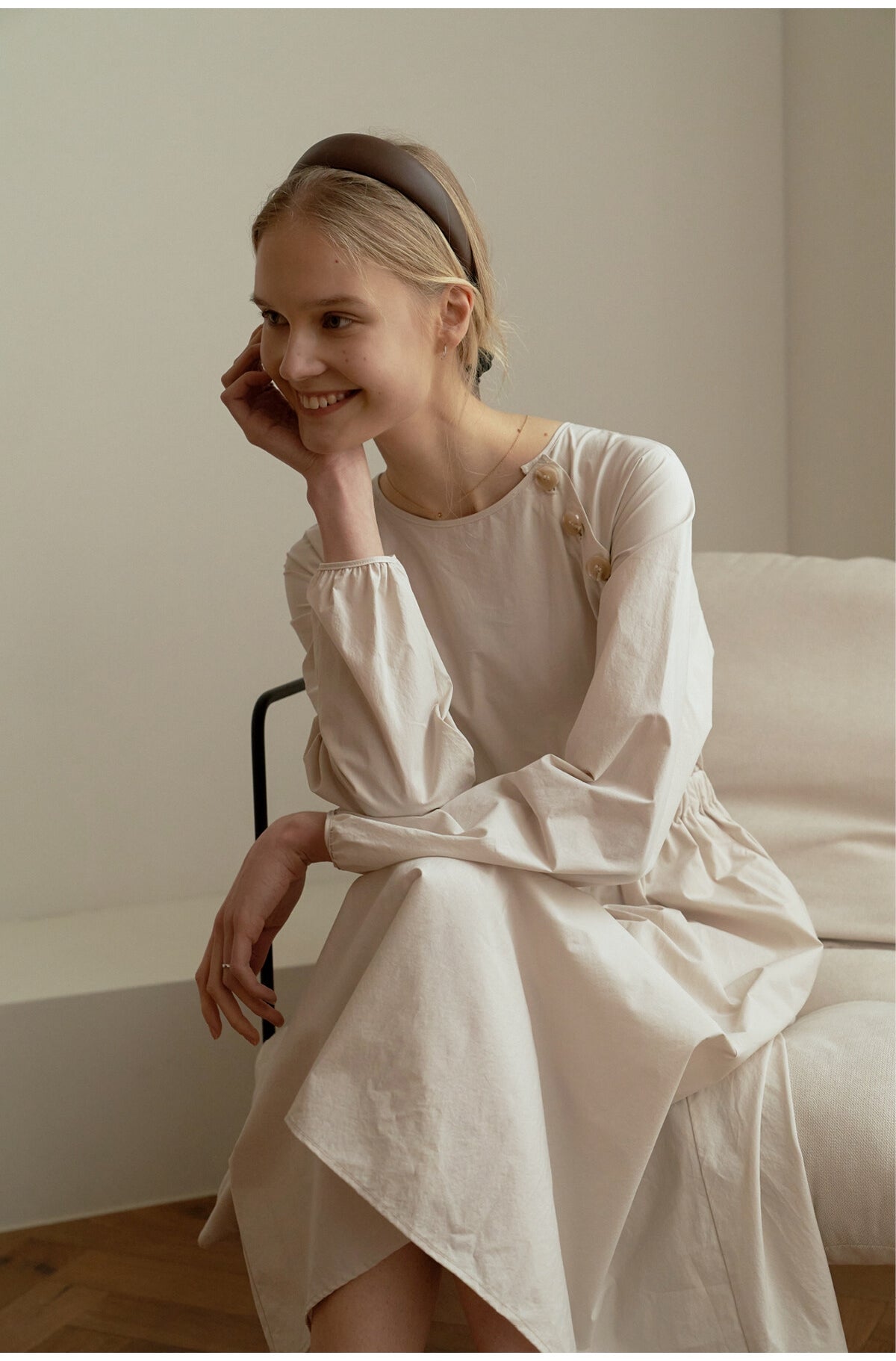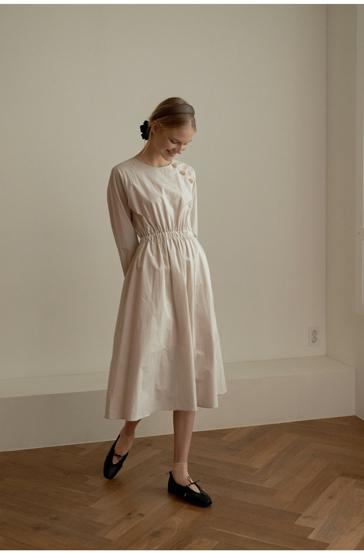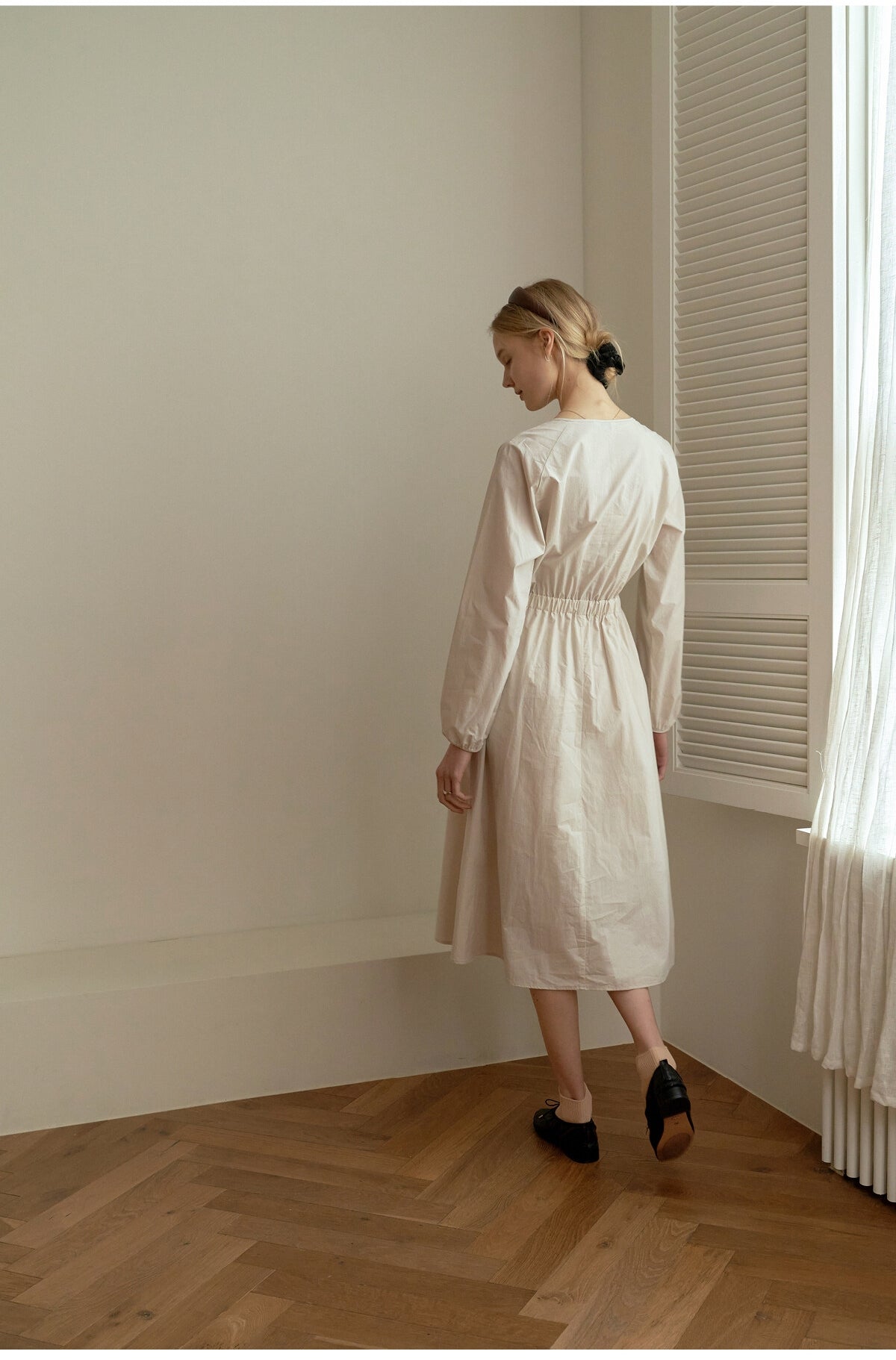 The cotton poplin midi dress from Laura Ren brings refined ease to everyday dressing. Designed in a structured yet breathable cotton poplin, it features long sleeves, a crew neckline, and a cinched elastic waist that enhances the natural silhouette. The mid-length hemline and relaxed drape offer timeless sophistication while ensuring all-day comfort. Subtle detailing like shoulder buttons adds understated charm. This is a versatile wardrobe essential that pairs beautifully with flats or heels, ideal for both elevated casual and polished occasions. Crafted for the woman who values comfort, elegance, and clean lines.