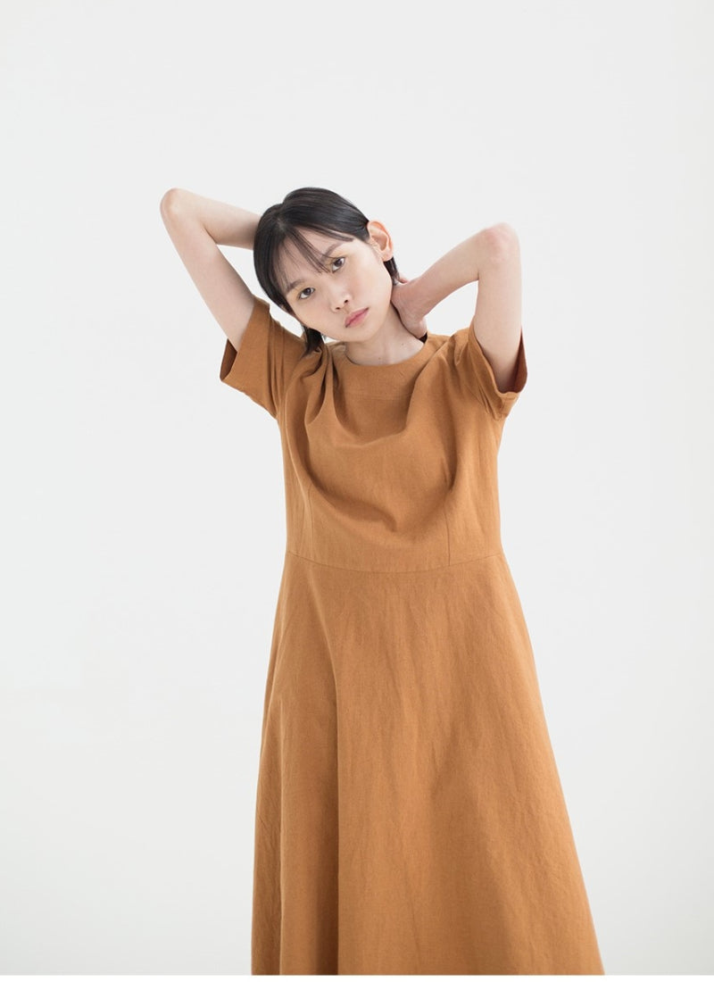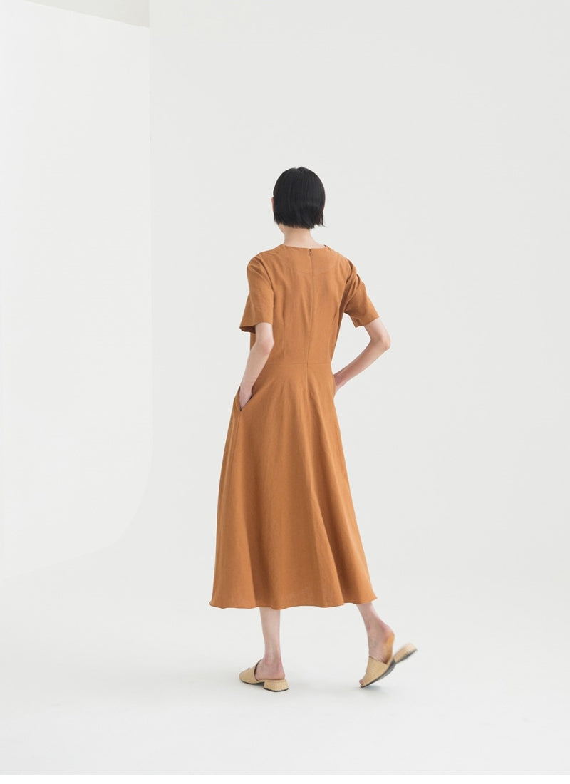 This sophisticated midi dress by Laura Ren is crafted from breathable, natural linen, making it ideal for warm-weather elegance. Designed with a flattering A-line silhouette, it features short sleeves, a round neckline, and a fitted bodice that flows gracefully into a flared hem. The clean lines and minimalistic tailoring give it a timeless look, while the soft, textured linen offers all-day comfort and a polished appearance. Perfect for both casual and semi-formal occasions, this dress seamlessly balances relaxed charm with refined detail. Laura Ren's commitment to effortless femininity and quality craftsmanship is evident in every stitch of this beautifully structured piece.