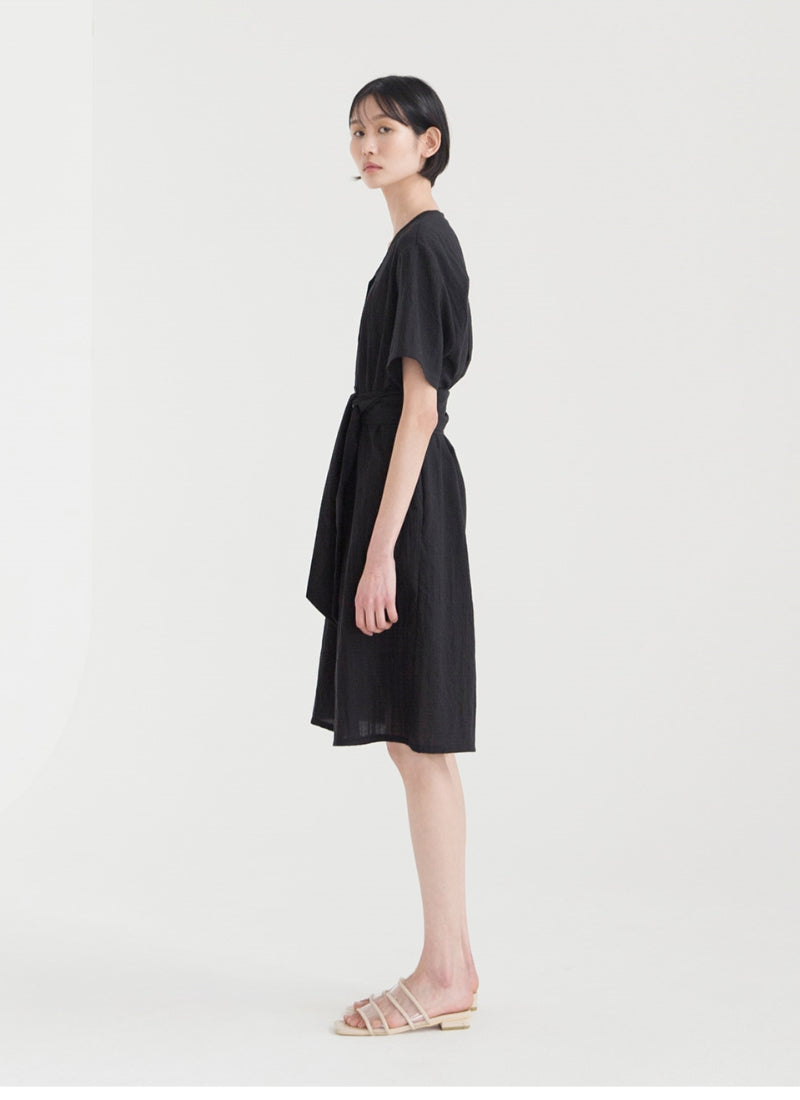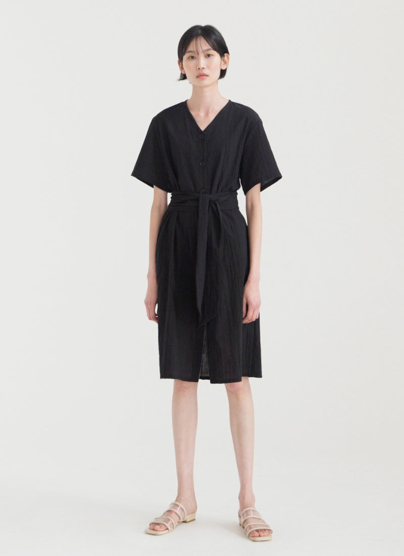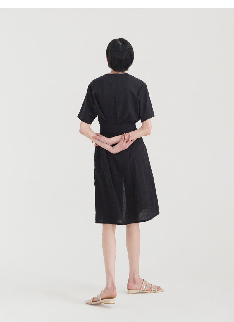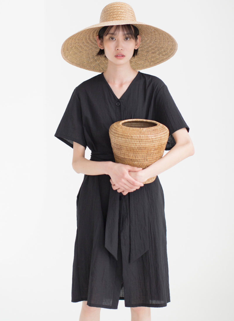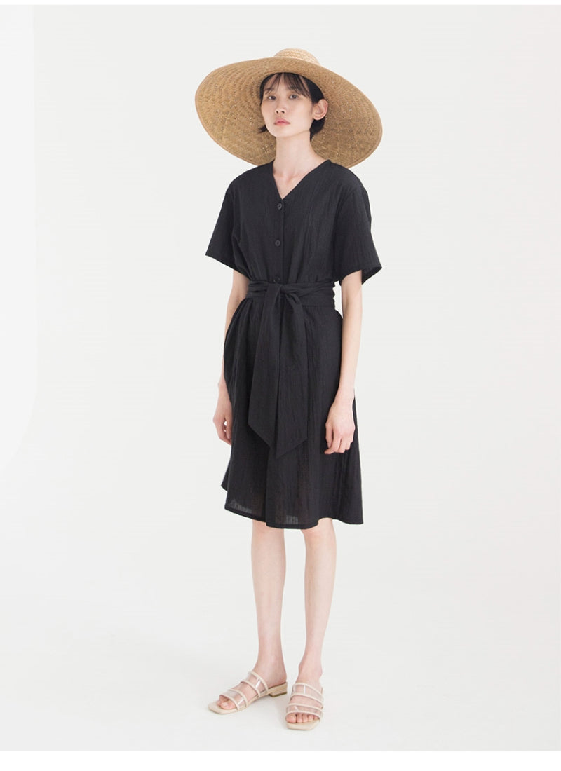 Crafted from breathable, lightweight linen, this midi dress from Laura Ren blends minimalism with modern femininity. Designed with a flattering V-neckline and a full button-down front, it features wide short sleeves and a self-tie waist belt that enhances the silhouette. The clean lines and soft texture make it perfect for warm-weather styling, whether you're dressing up for a casual day out or a summer gathering. With its refined tailoring and timeless silhouette, this linen midi dress brings effortless elegance and comfort to your wardrobe. An essential piece for sophisticated, eco-conscious fashion lovers.