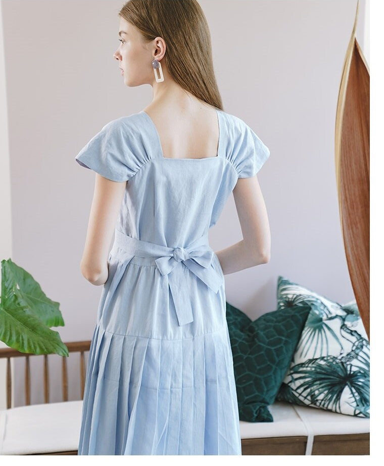 This elegant pleated linen midi dress from Laura Ren combines timeless charm with everyday comfort. Crafted from lightweight, breathable linen, the dress features a square neckline, subtle puff sleeves, and a pleated skirt for graceful movement. The back-tie waist flatters your silhouette while offering flexible styling options. A delicate front button detail adds to its refined aesthetic, making it perfect for both casual daytime outings and semi-formal gatherings. Laura Ren’s craftsmanship ensures a premium finish and an effortlessly chic presence in your wardrobe. Ideal for warm-weather elegance and timeless appeal.